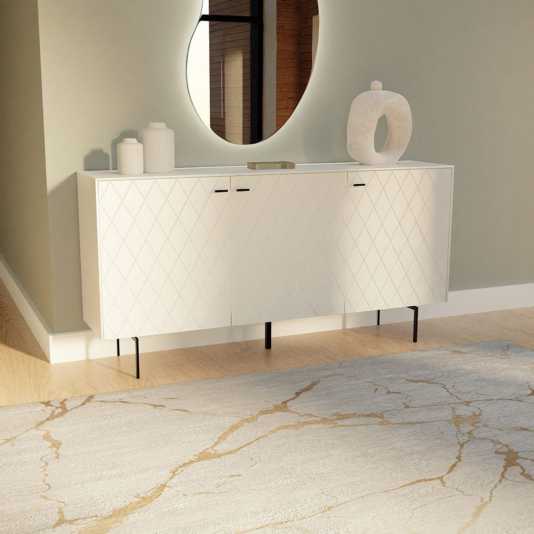Fabricada en 100% PES con una alta densidad de 1200 GSM, esta pieza sobresale por su tacto suave y su excelente resistencia al uso cotidiano. El diseño presenta una armoniosa combinación de fondo blanco puro con vetas en tonos dorados y ocres, logrando un equilibrio perfecto entre calidez y distinción. Además, incorpora una práctica base antideslizante de 120 gr/m2 que garantiza la máxima seguridad y estabilidad, manteniendo la alfombra perfectamente posicionada sobre cualquier tipo de suelo.