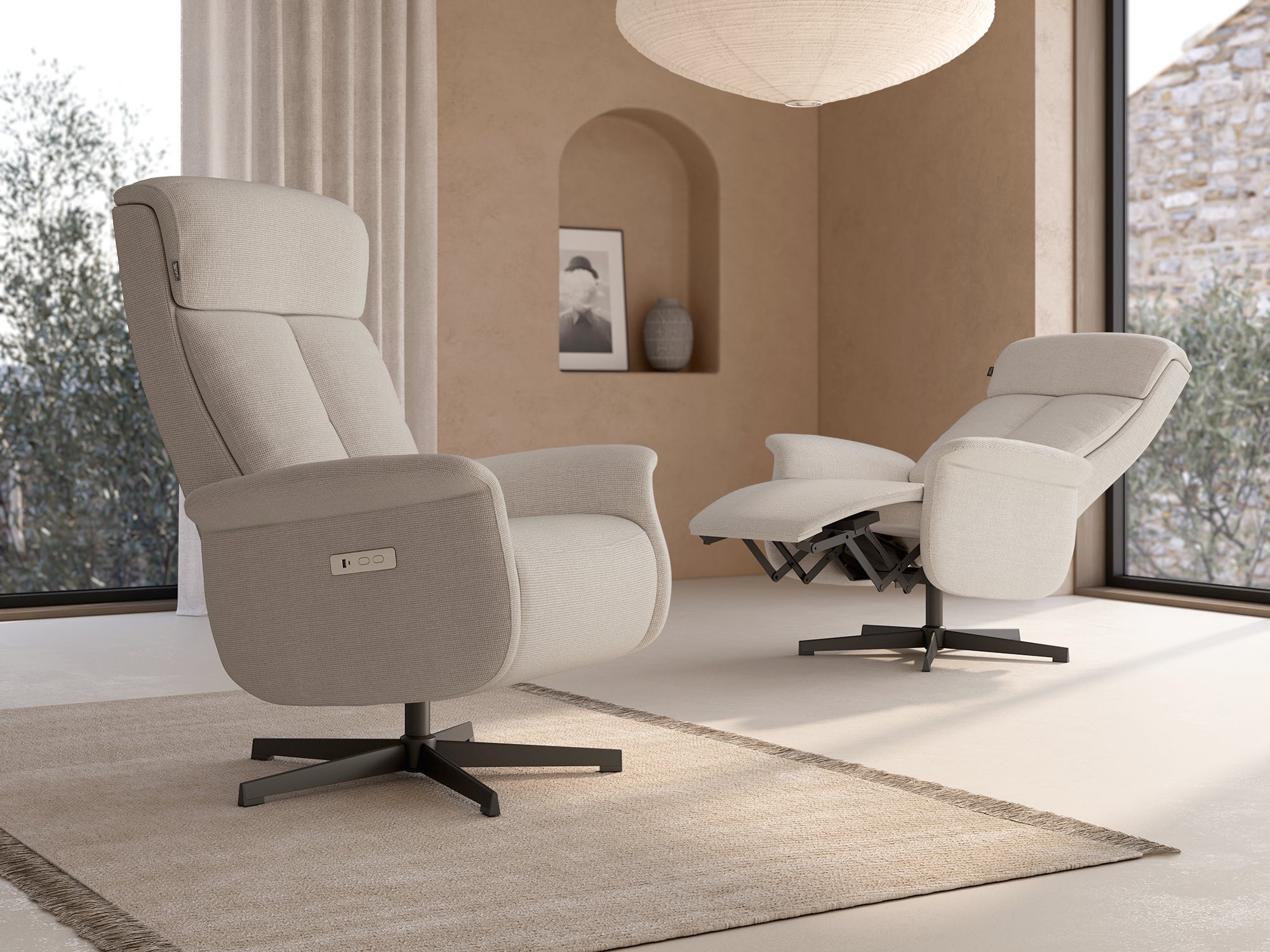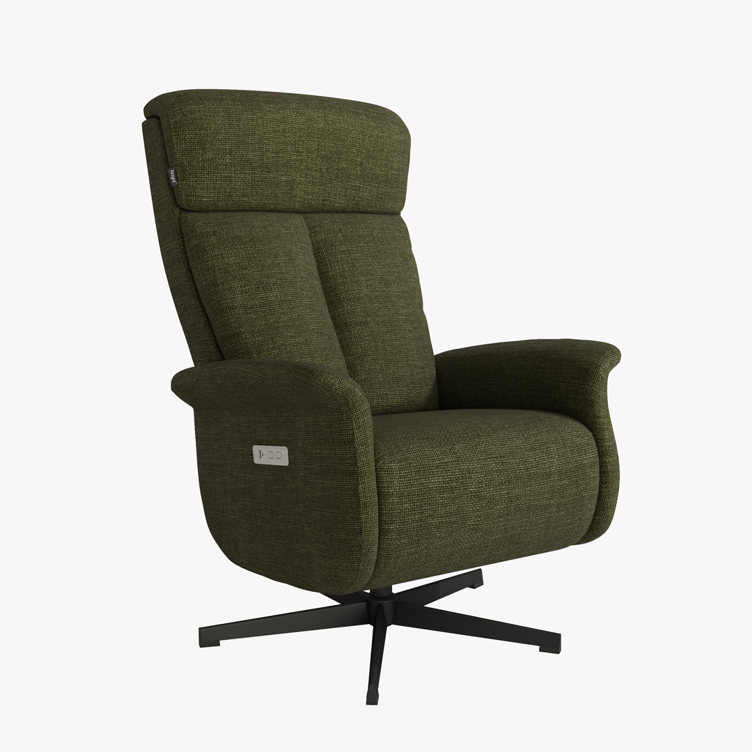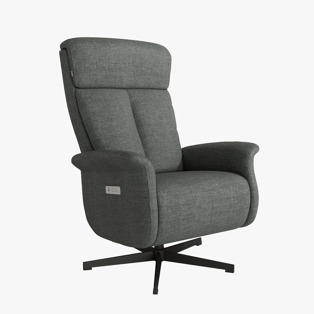 Incorpora un sistema de relax eléctrico con dos motores, que permite ajustar de forma independiente el respaldo y el reposapiés para encontrar la posición más cómoda en cada momento. La base metálica negra con función giratoria añade estabilidad y libertad de movimiento, mientras que el tapizado resulta agradable al tacto y resistente para el uso diario. Incluye además un práctico puerto USB integrado.