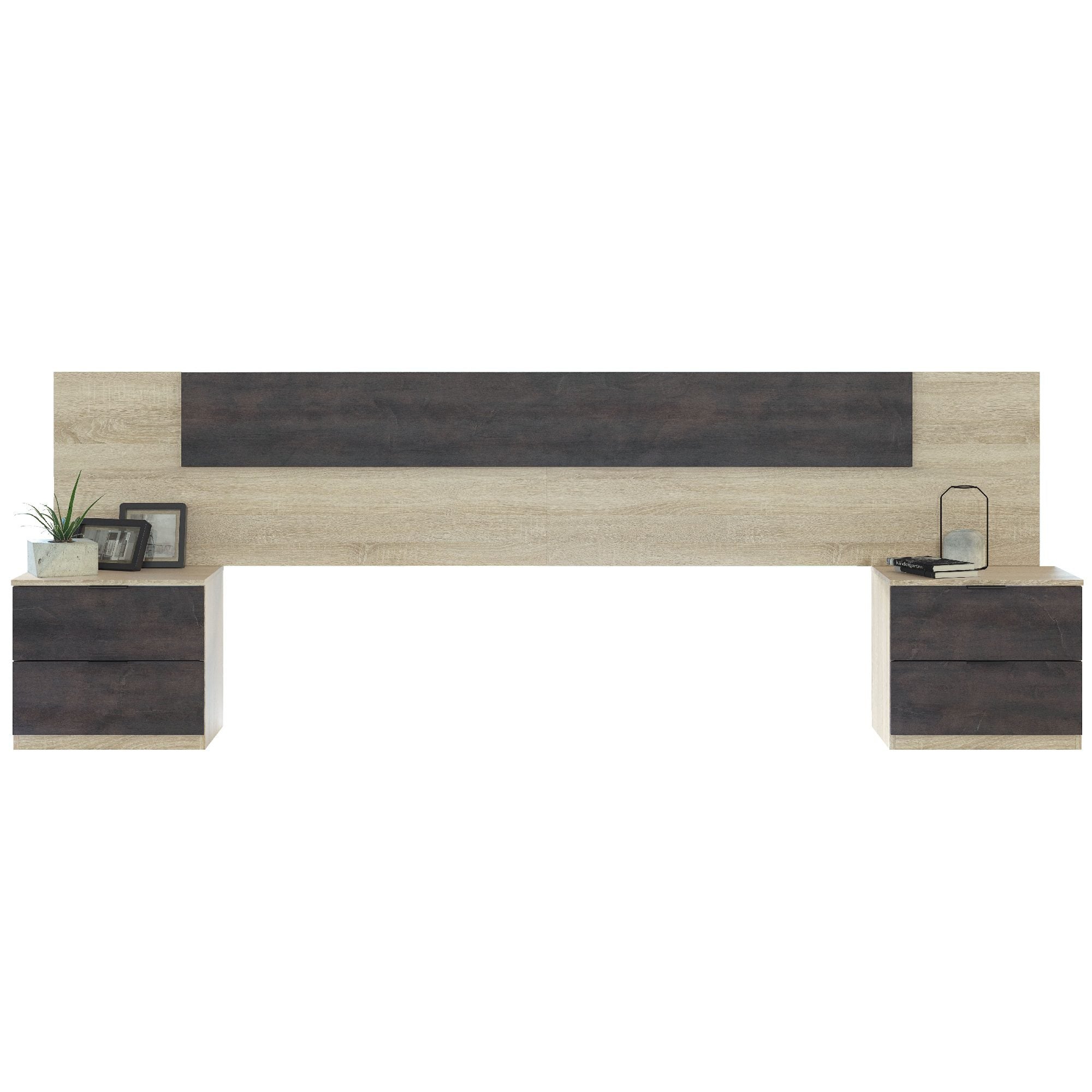 Medidas: Cabezal: 50 cm (alto) x 247 cm (ancho) x 3 cm (prof.) | Mesita (unidad): 45 cm (alto) x 50 cm (ancho) x 38 cm (prof.)