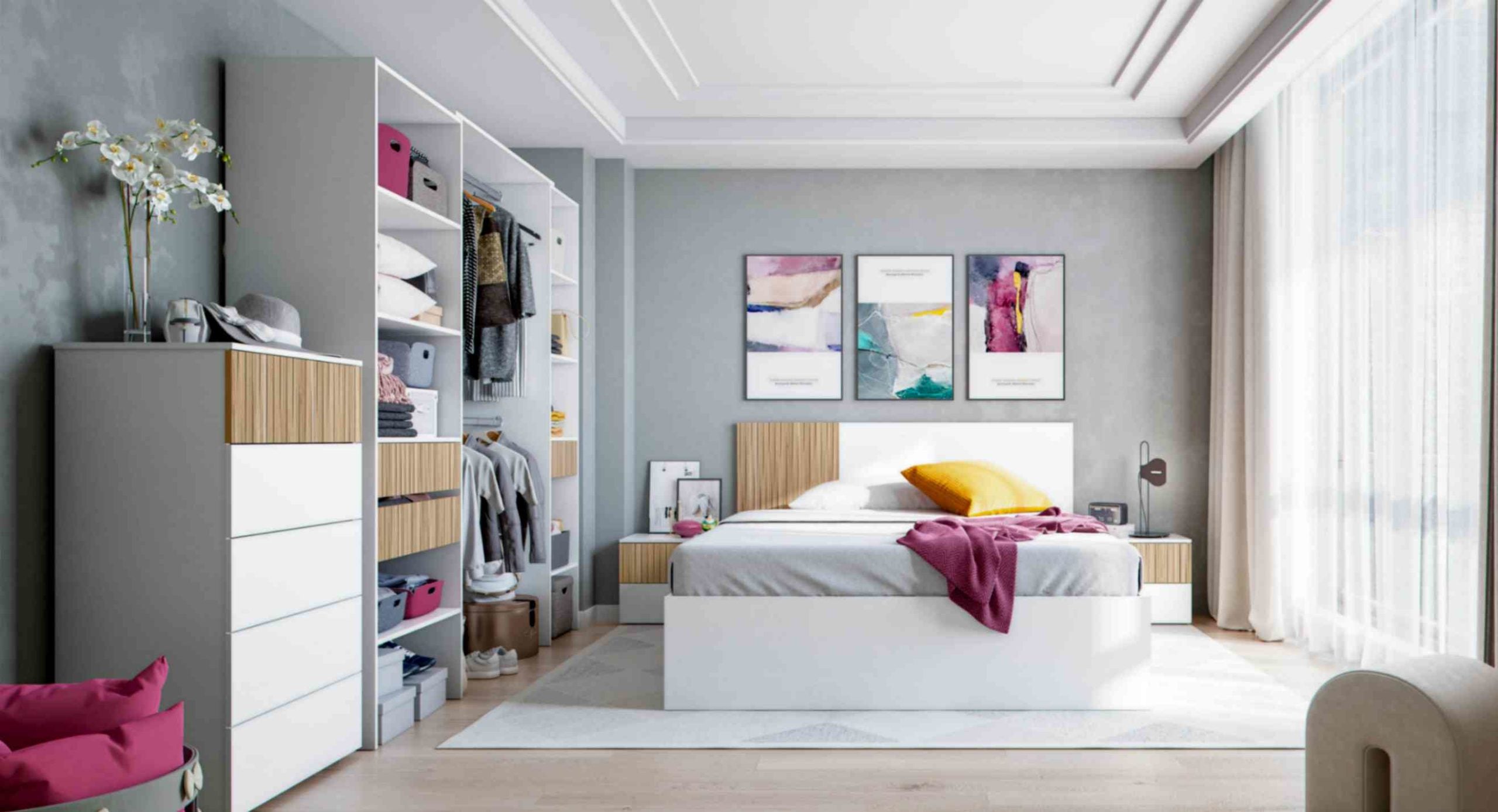 El conjunto de dormitorio ETHNA, compuesto por un moderno cabezal y dos mesitas de noche, es la opción perfecta para crear un ambiente elegante y de tendencia en tu habitación. Su diseño contemporáneo, caracterizado por un sutil juego de volúmenes en sus paneles, está pensado para enmarcar a la perfección camas de 160 cm, aportando una estética sofisticada y muy actual al espacio de descanso.