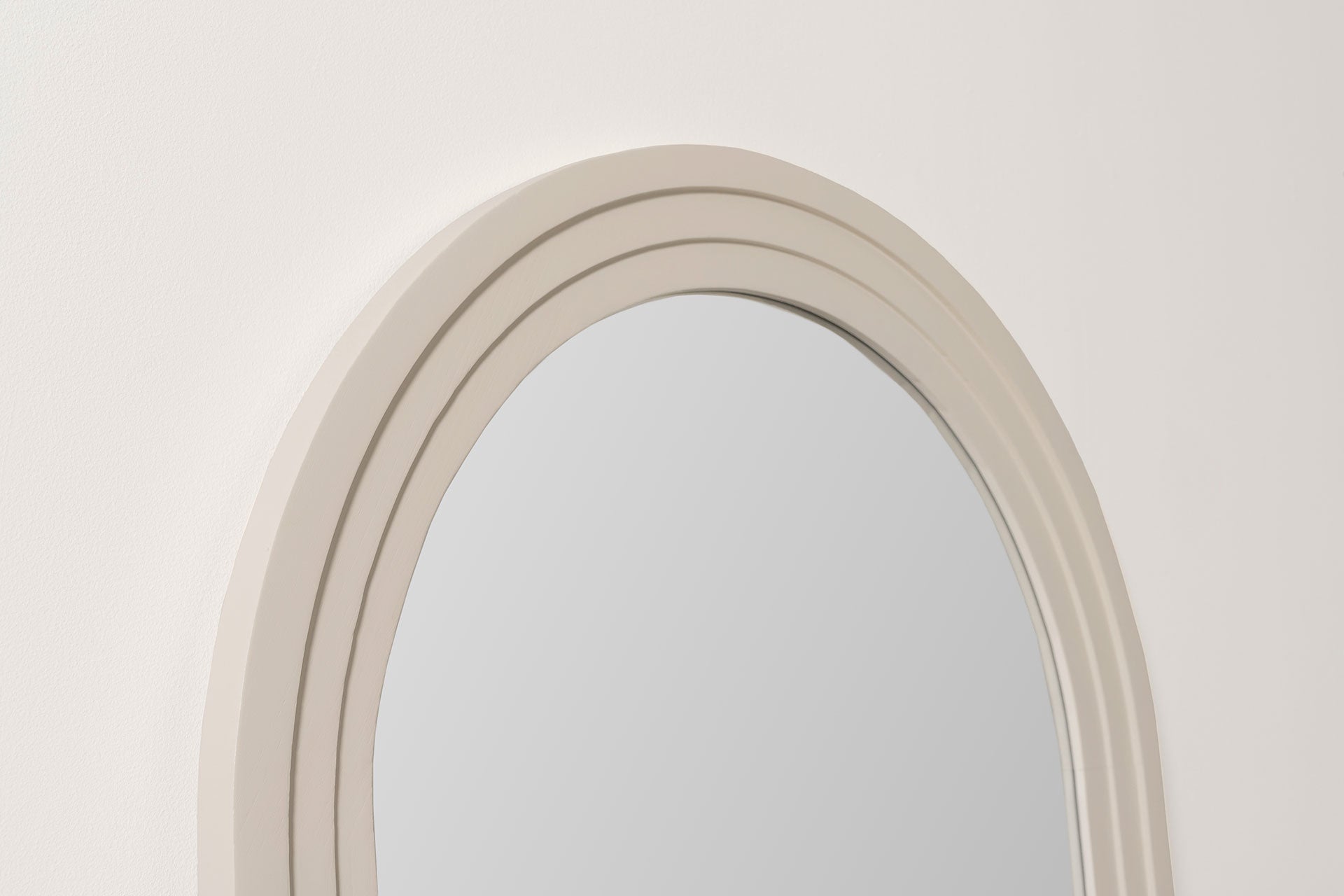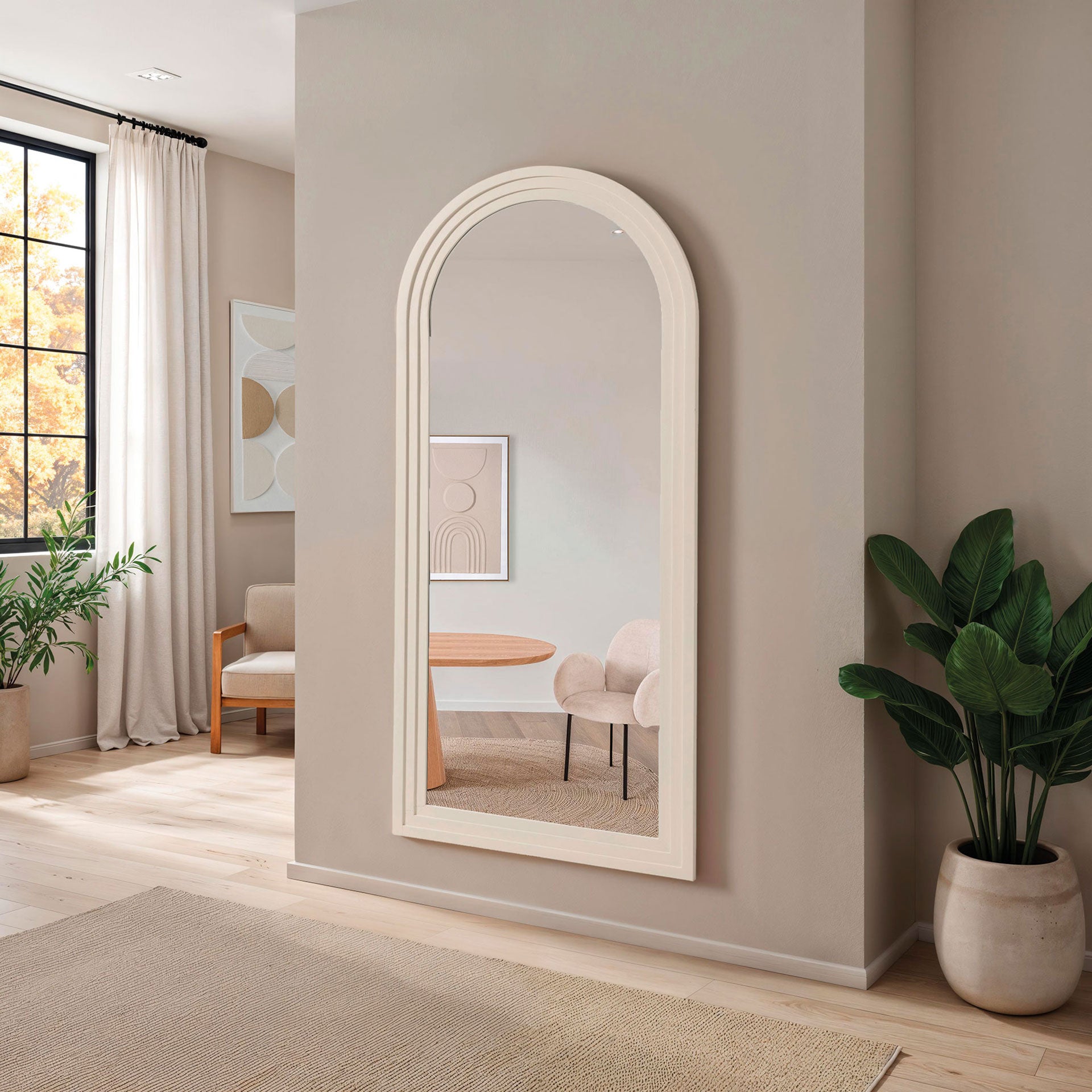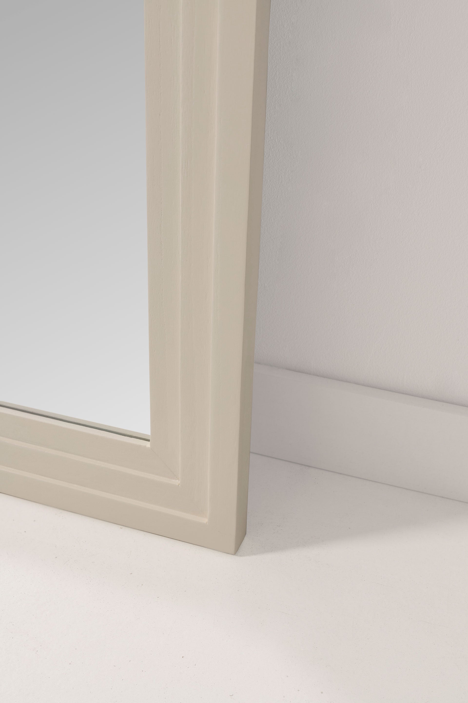 Fabricado con un robusto marco de madera de alta calidad en acabado blanco roto, esta pieza sobresale por su moldura escalonada en tres niveles, que añade una sutil tridimensionalidad y un juego de sombras muy refinado. El cristal de alta transparencia asegura un reflejo nítido y sin distorsiones, mientras que su generoso formato de cuerpo entero lo convierte en una pieza tan funcional como decorativa. Su estética atemporal permite que se integre con naturalidad en ambientes de estilo nórdico, mediterráneo o minimalista.