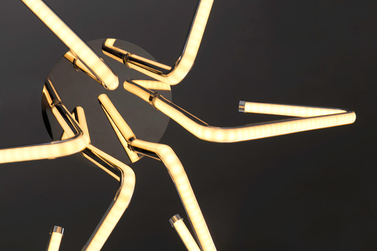 La lámpara de techo Vector destaca por su diseño vanguardista y su capacidad para transmitir elegancia en cualquier ambiente. Su estructura, formada por una serie de ganchos metálicos entrelazados donde se integra la tecnología LED, crea una pieza decorativa con mucha personalidad que se convierte en el centro de atención de salones o espacios de diseño contemporáneo.