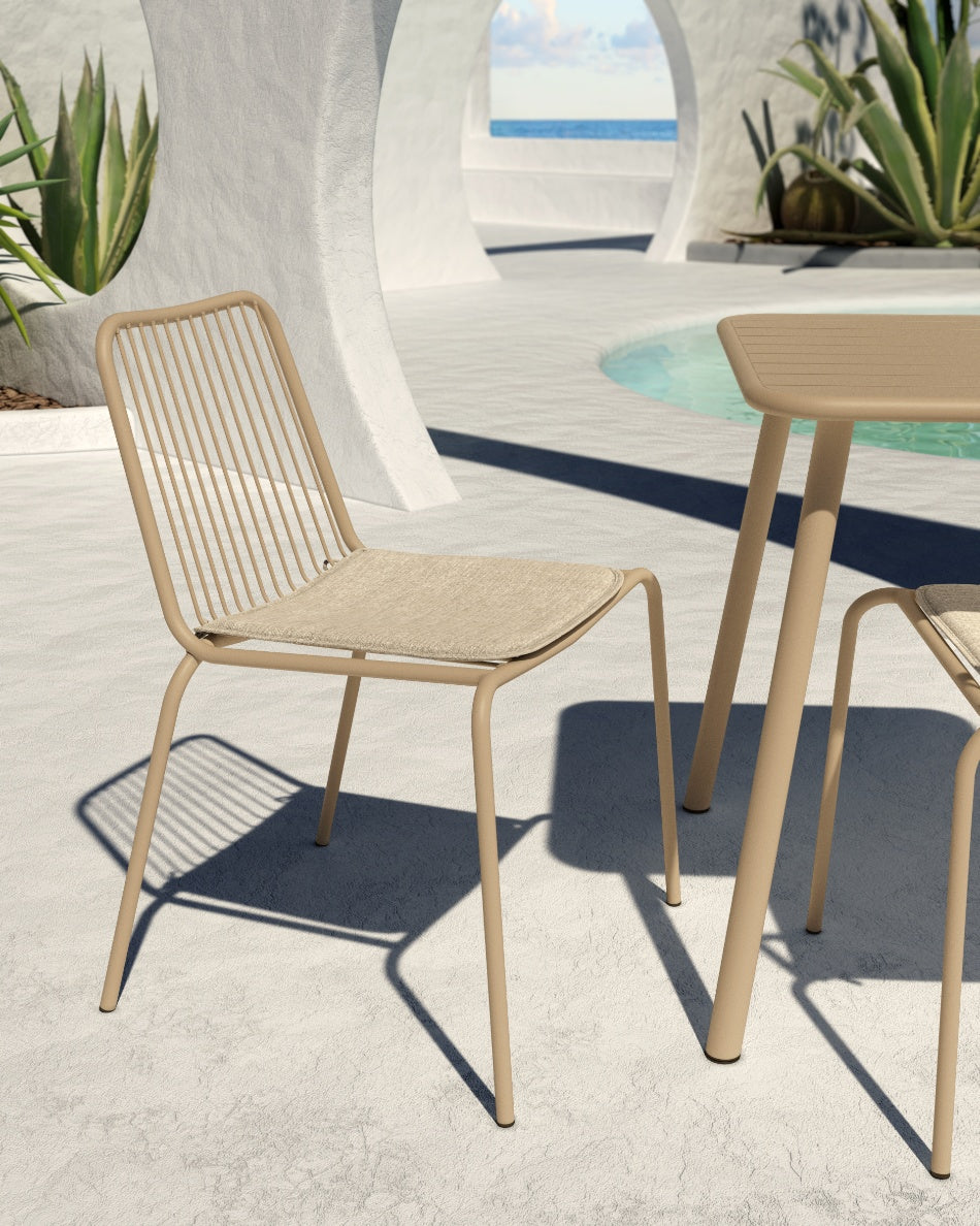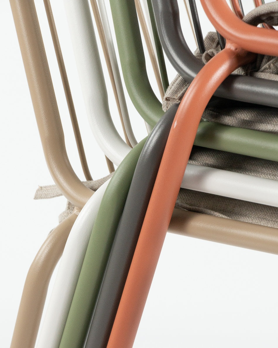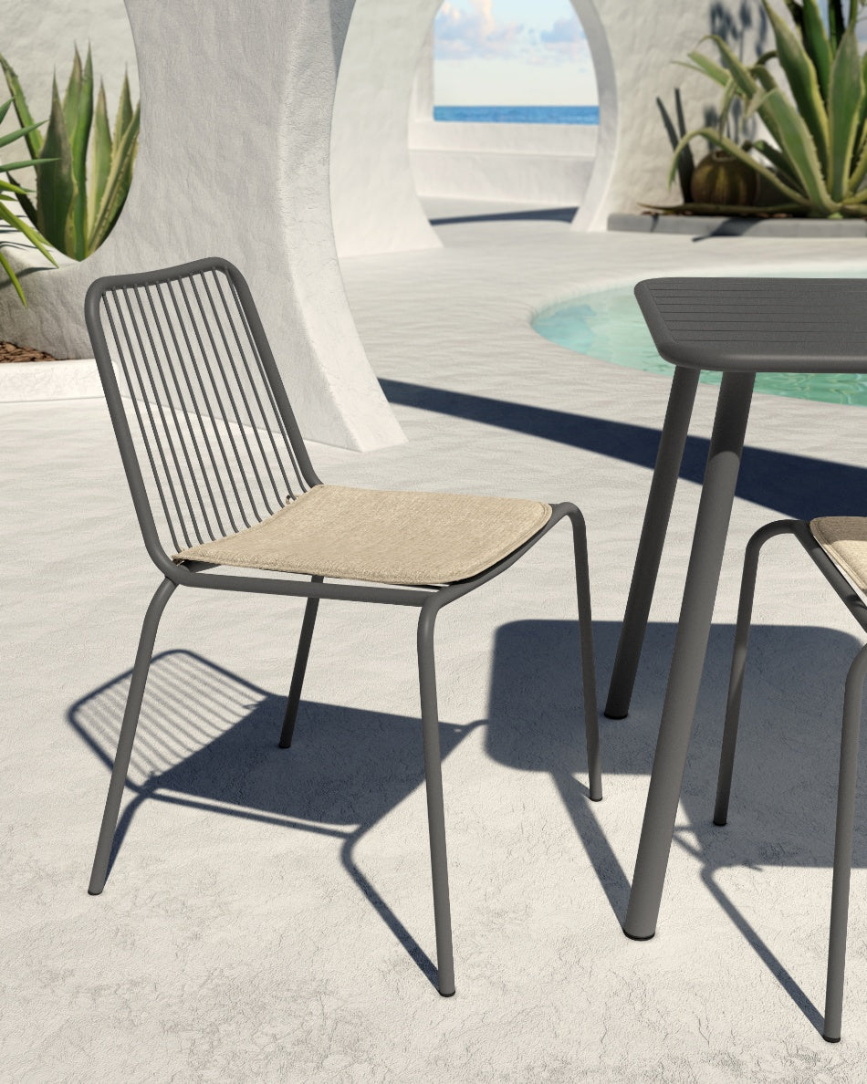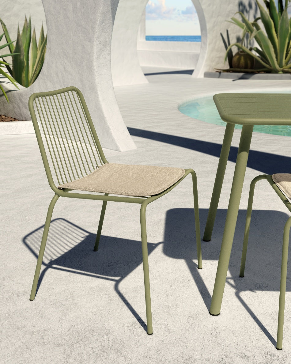 La silla Aloha presenta un diseño fresco y ligero, pensada para disfrutar del exterior con comodidad y estilo. Su estructura metálica y líneas abiertas aportan una estética actual que encaja con naturalidad en terrazas, jardines o zonas junto a la piscina.