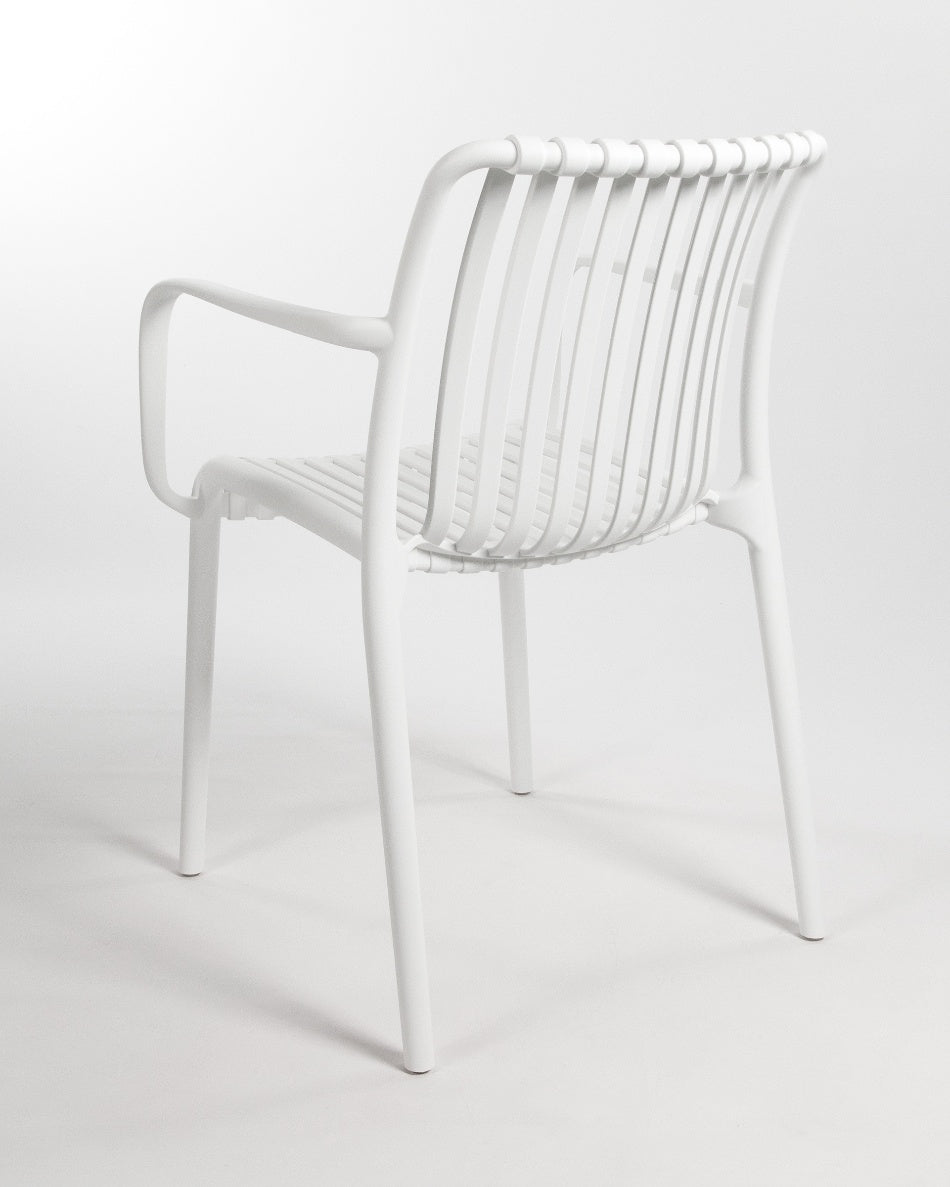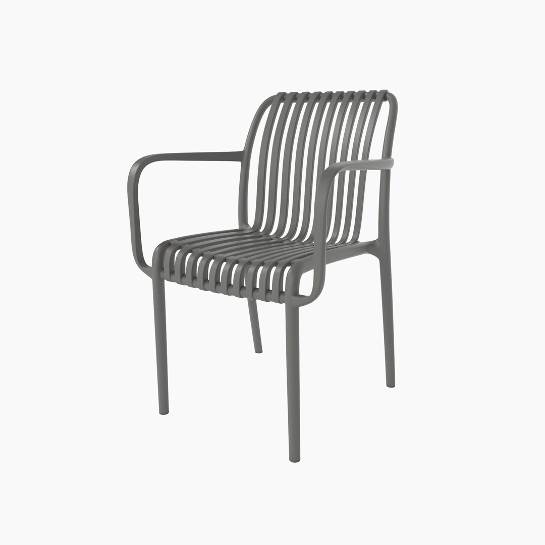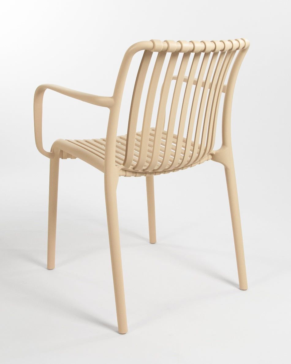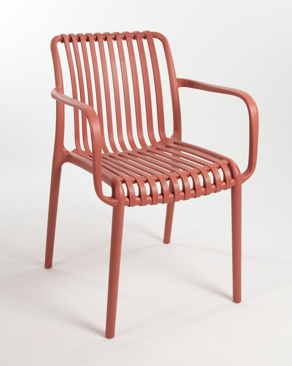 La silla Habana presenta un diseño fresco y actual, con un respaldo de lamas que aporta ligereza visual y un aire desenfadado. Su silueta envolvente con apoyabrazos integrados la convierte en una opción cómoda y atractiva para terrazas, jardines o zonas de comedor al aire libre.