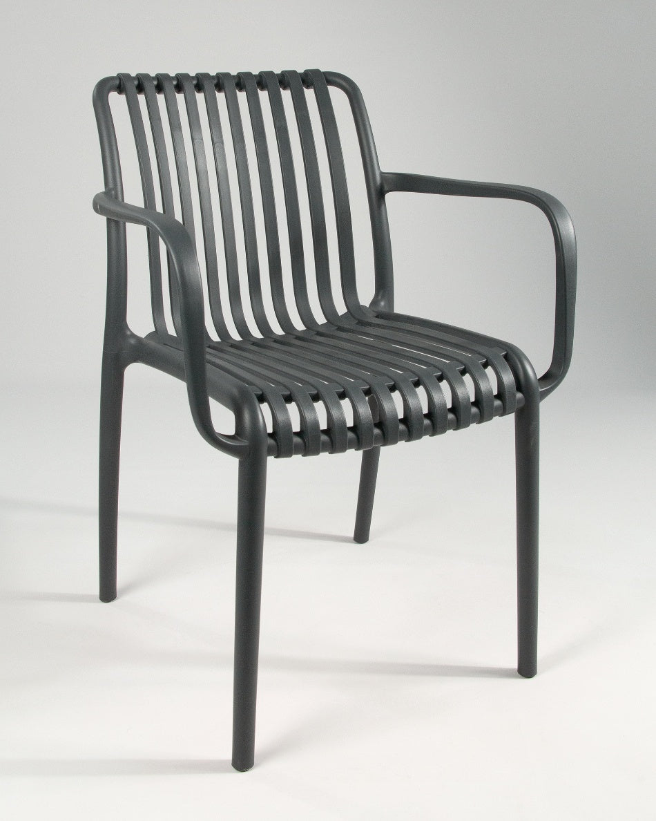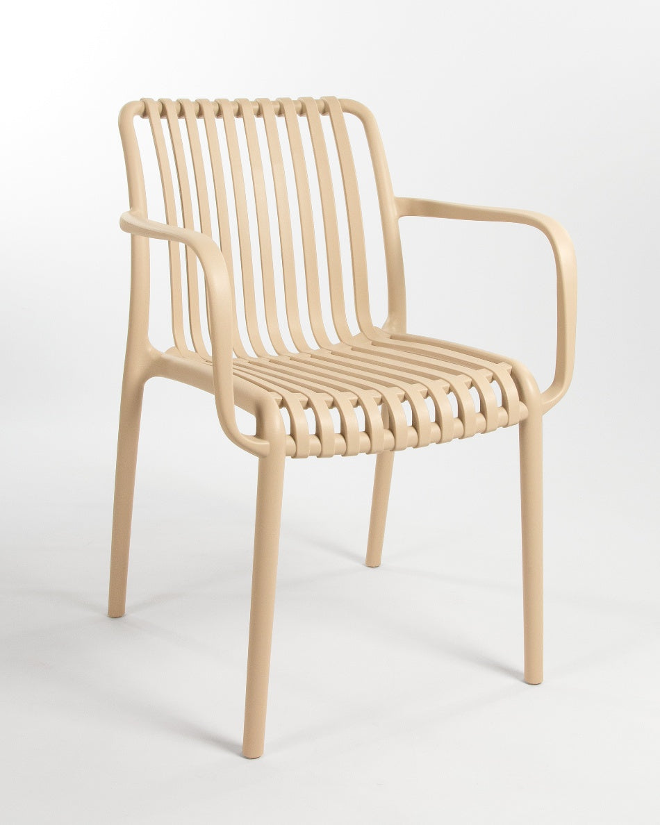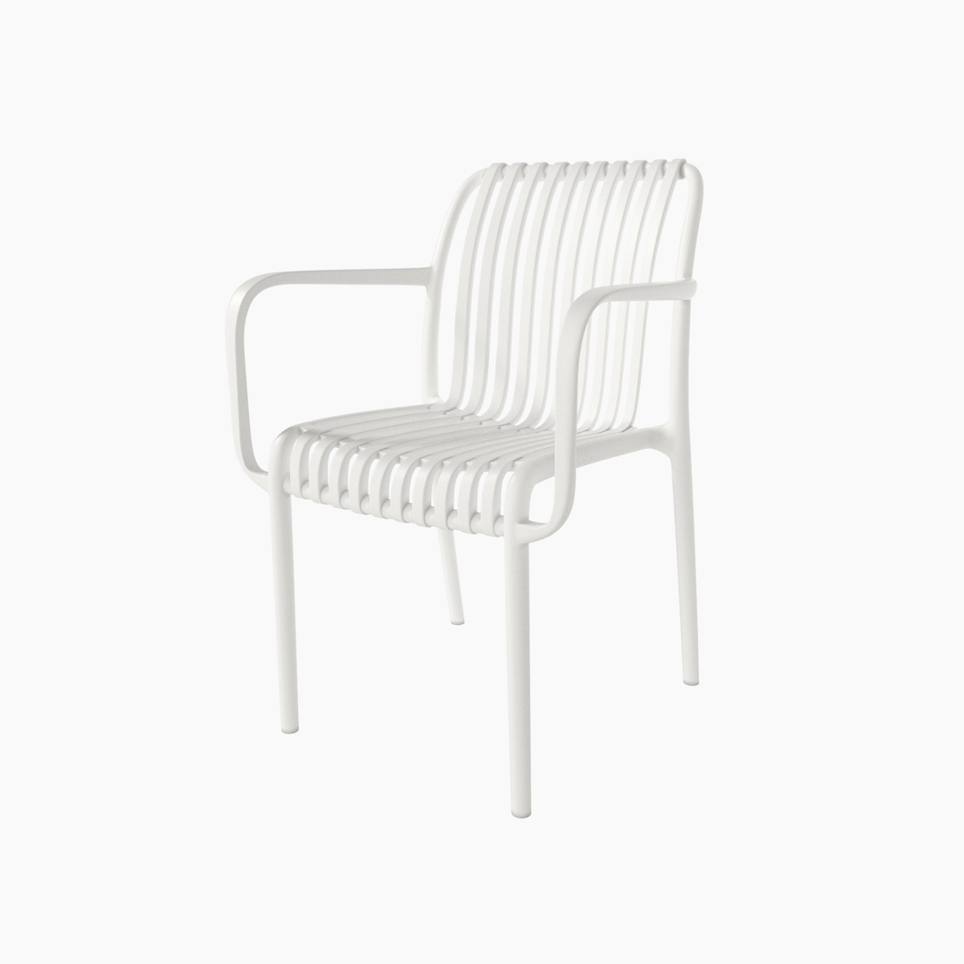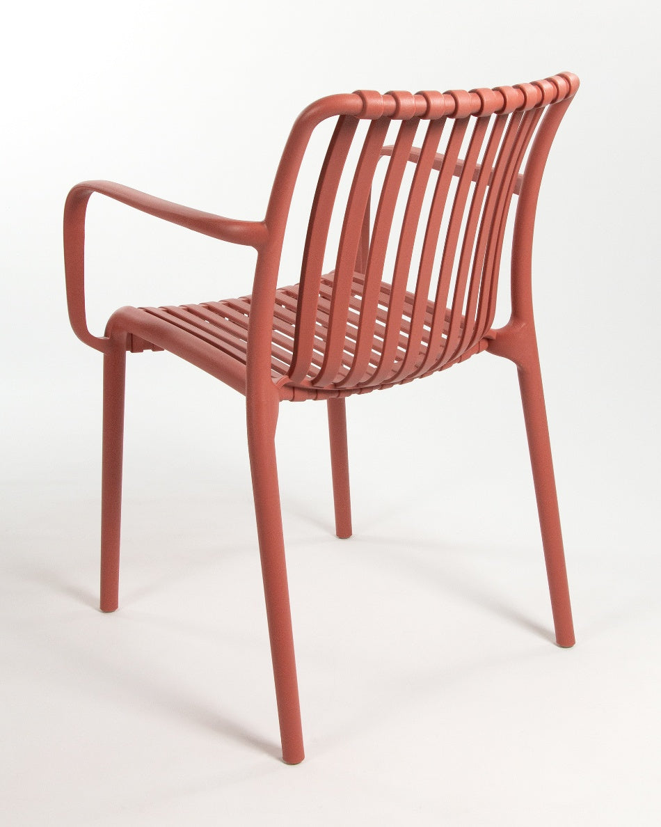 La silla Habana presenta un diseño fresco y actual, con un respaldo de lamas que aporta ligereza visual y un aire desenfadado. Su silueta envolvente con apoyabrazos integrados la convierte en una opción cómoda y atractiva para terrazas, jardines o zonas de comedor al aire libre.