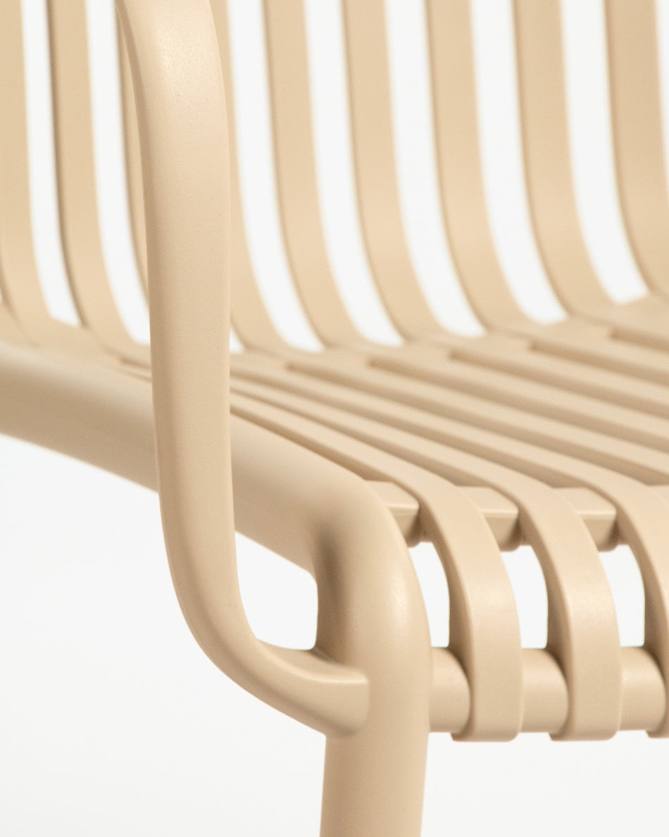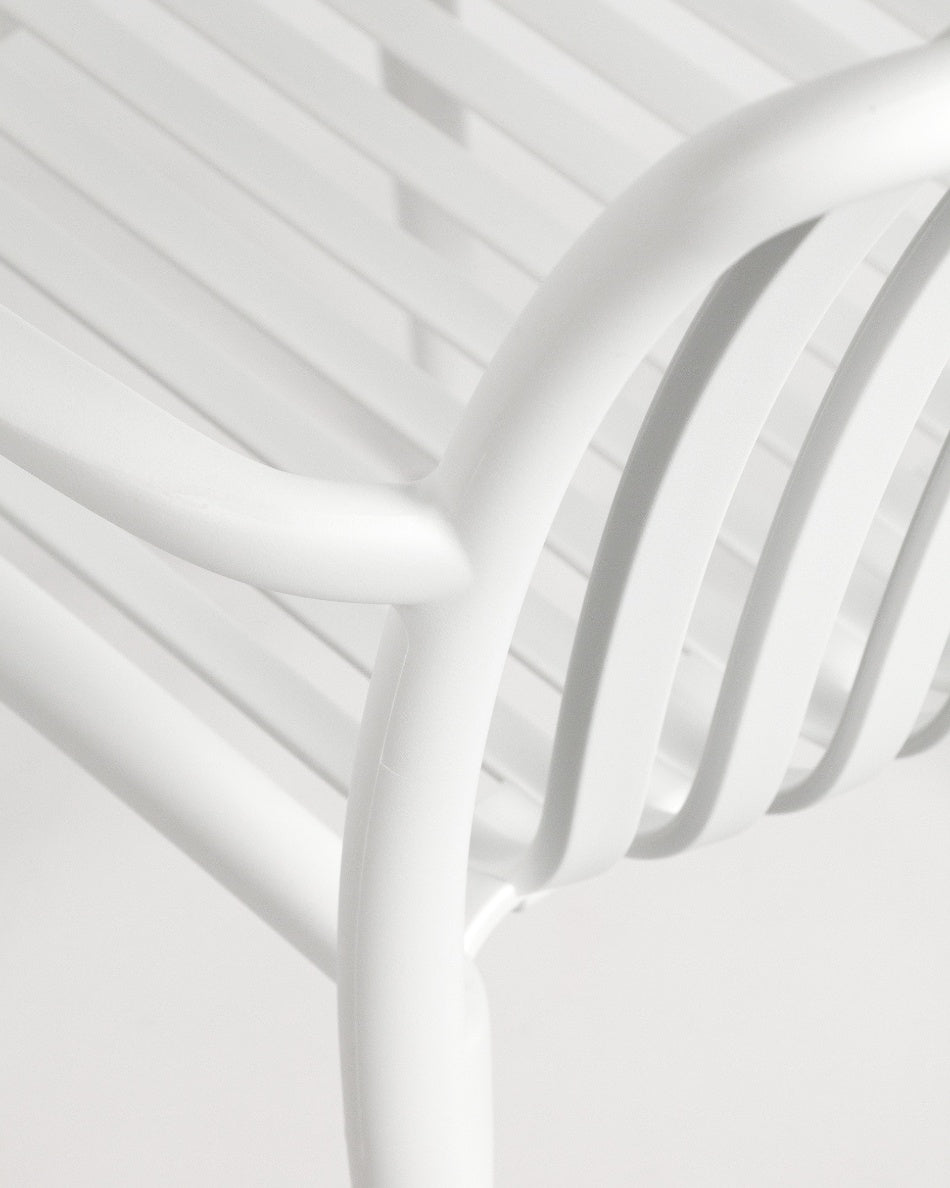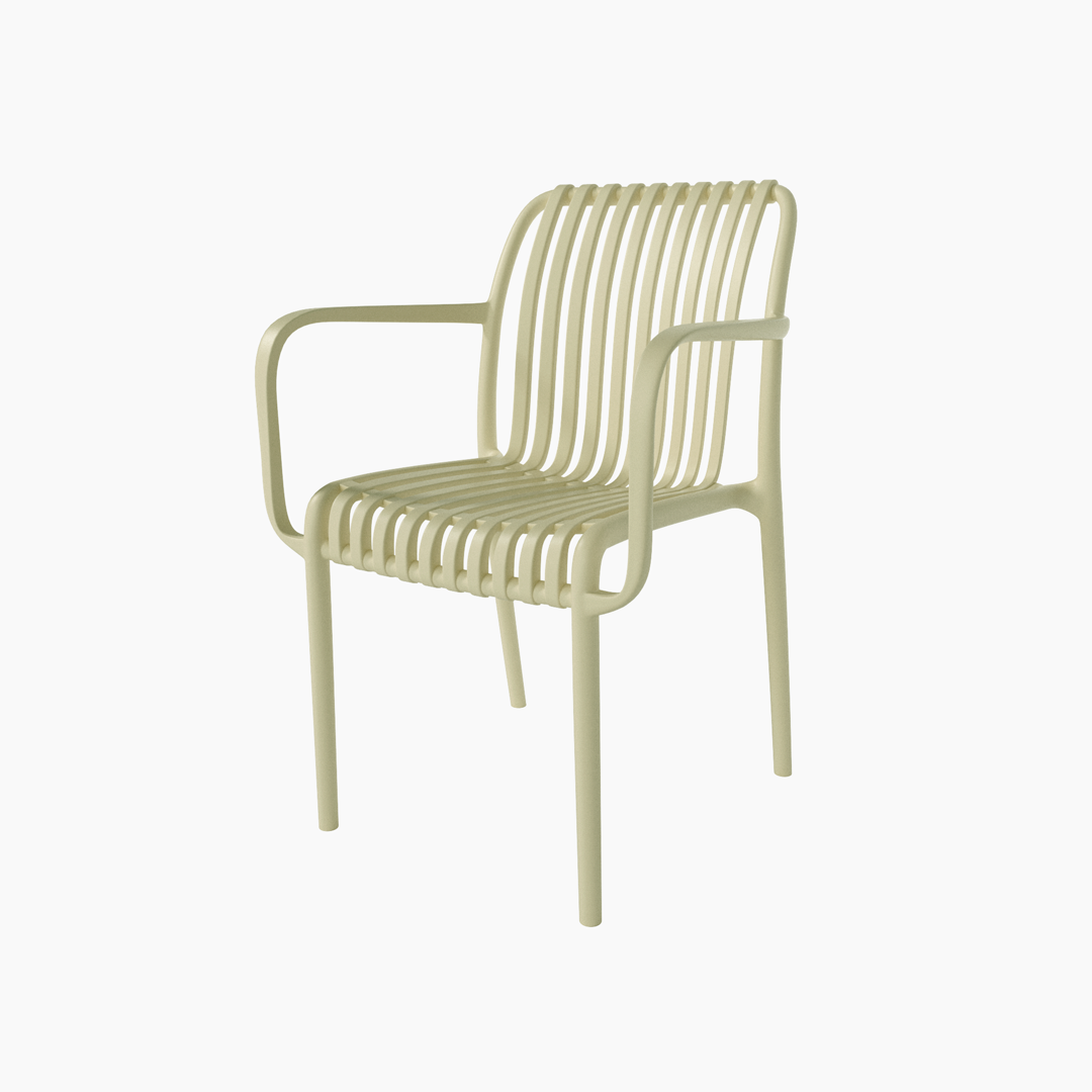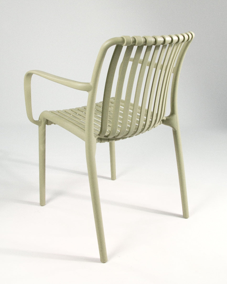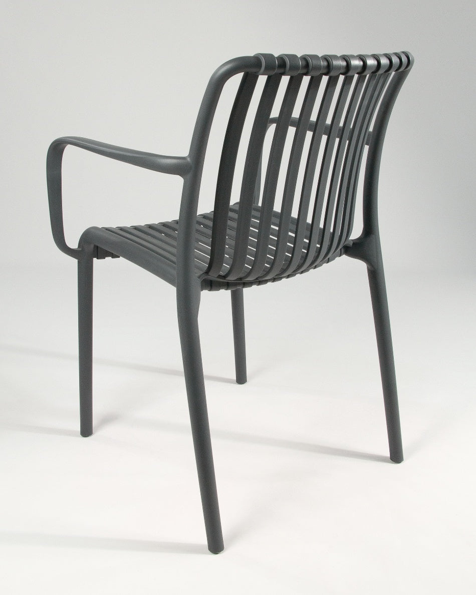 La silla Habana presenta un diseño fresco y actual, con un respaldo de lamas que aporta ligereza visual y un aire desenfadado. Su silueta envolvente con apoyabrazos integrados la convierte en una opción cómoda y atractiva para terrazas, jardines o zonas de comedor al aire libre.