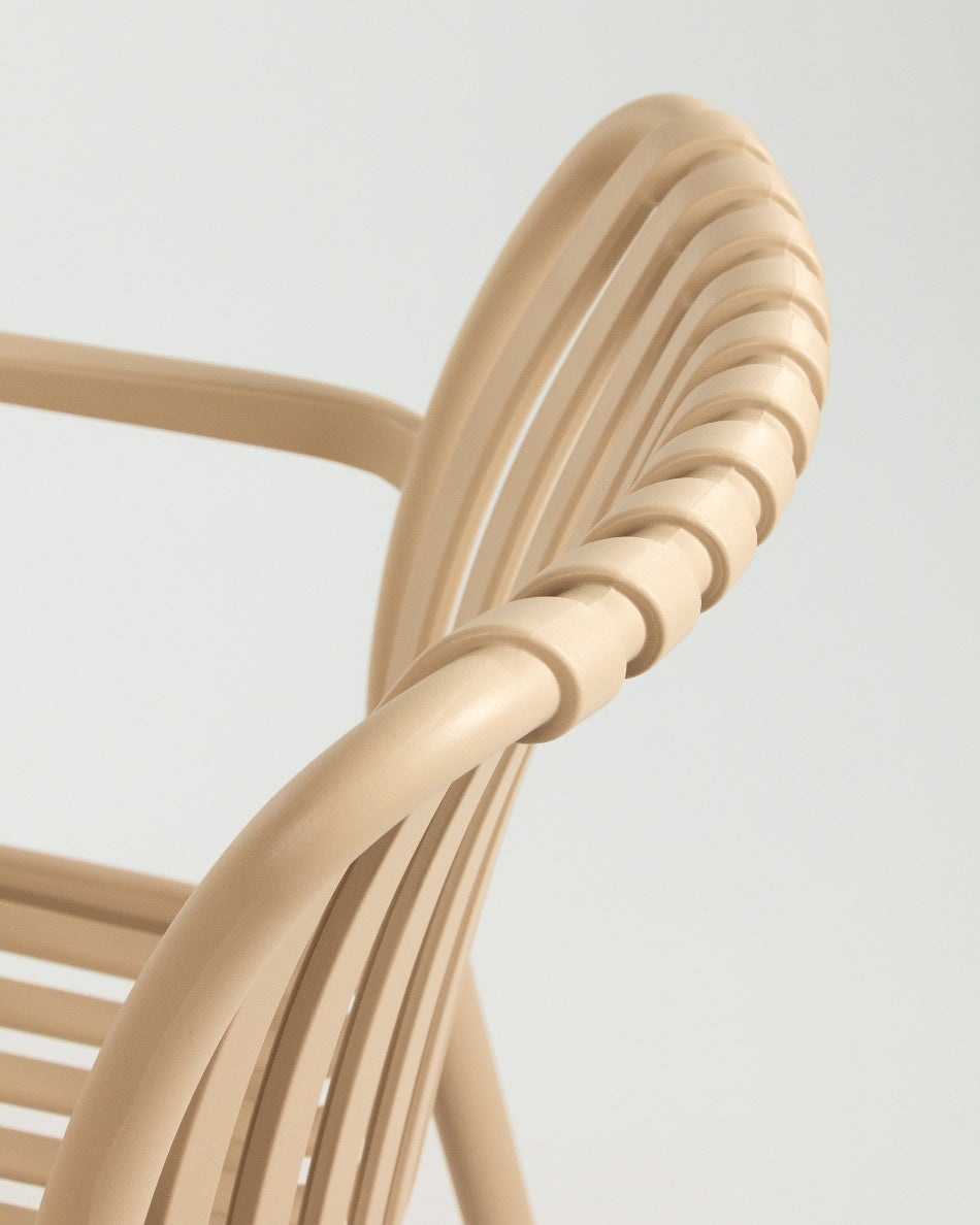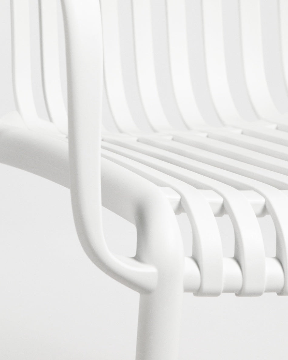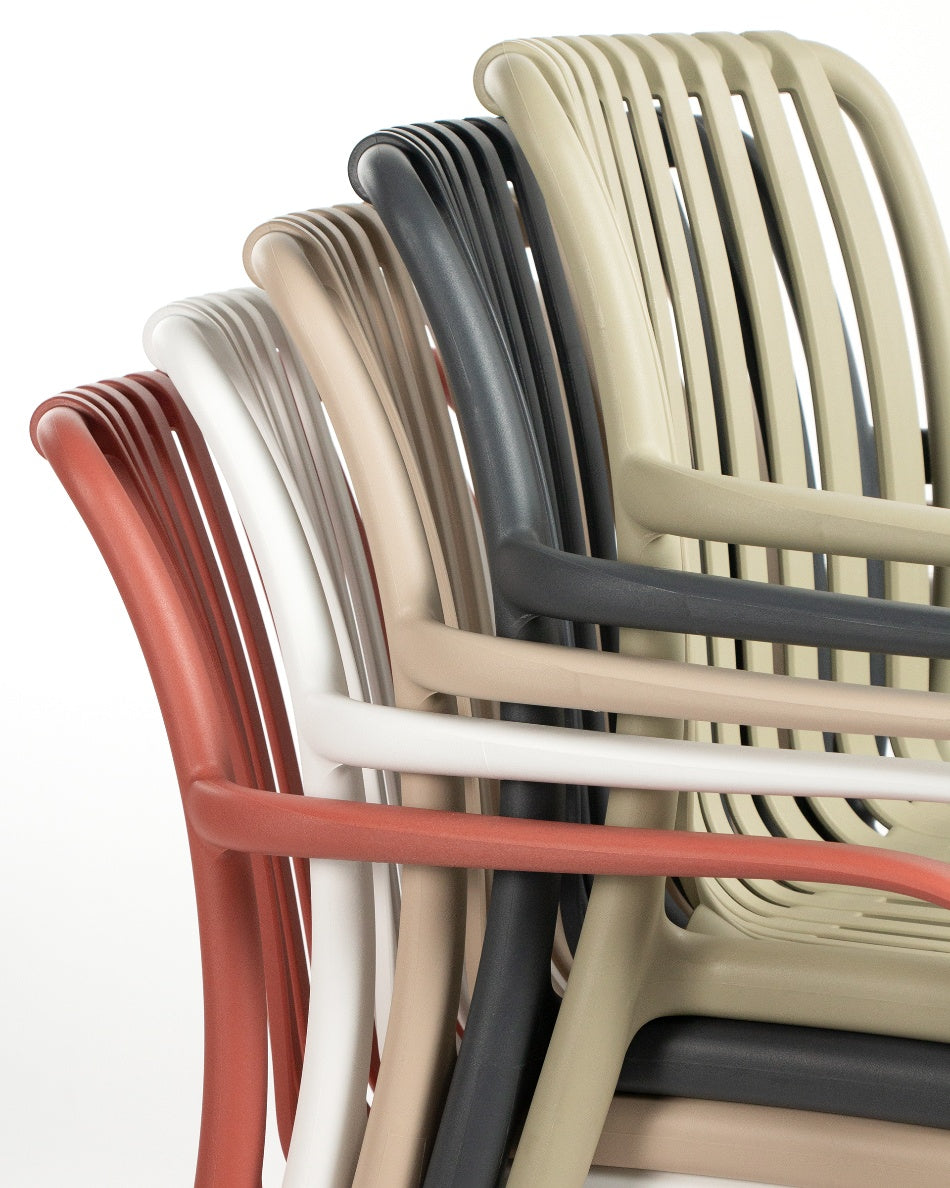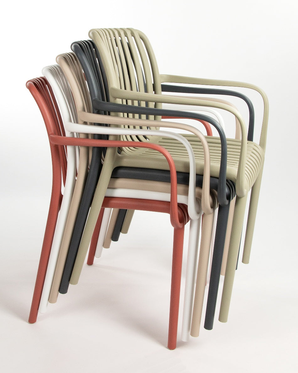 Fabricada en polipropileno, es resistente y fácil de mantener, además de ser apilable, lo que facilita su almacenaje cuando no se utiliza. Apta para exterior, combina funcionalidad y estilo, adaptándose tanto a espacios domésticos como a entornos contract.
