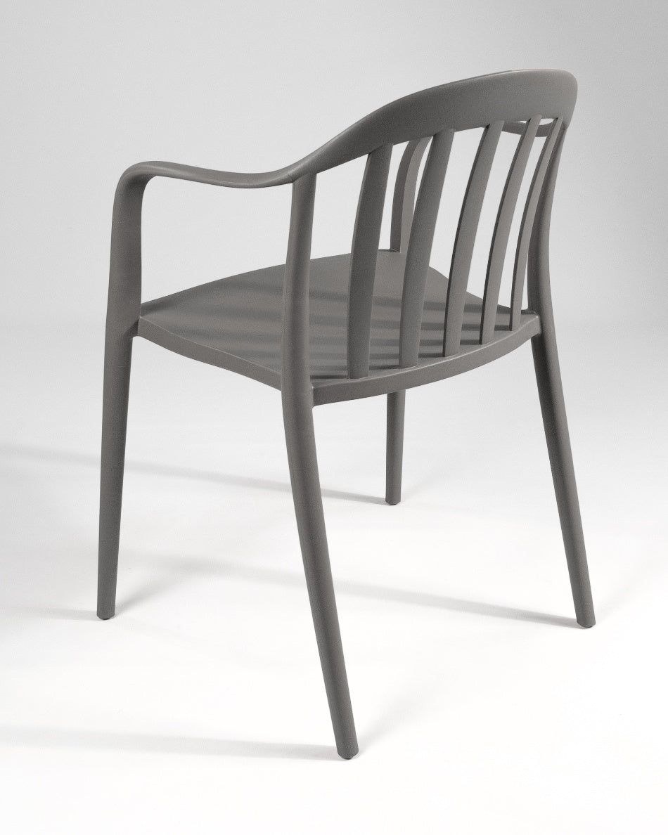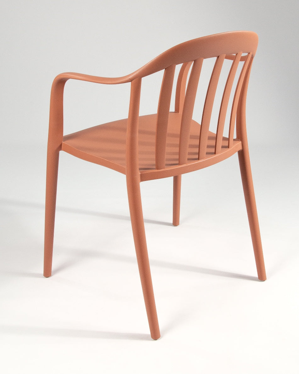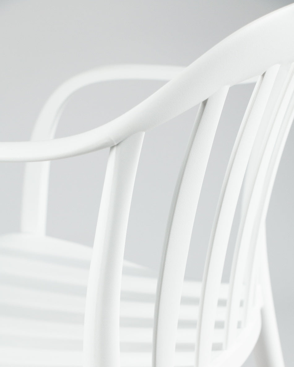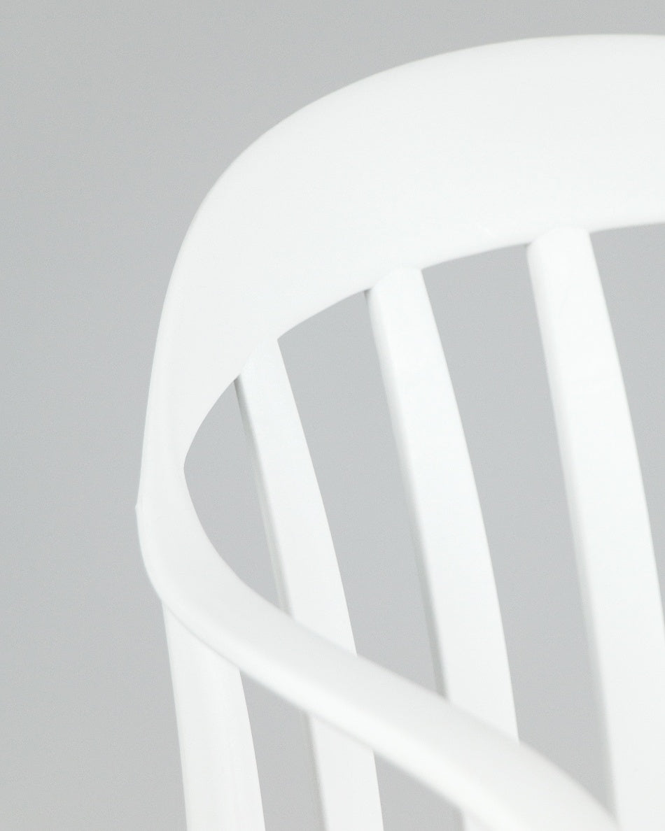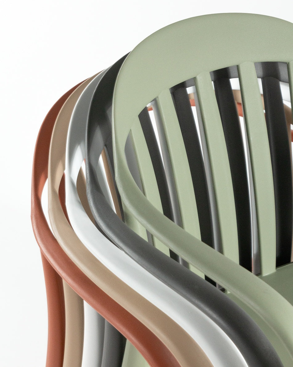 La silla Malibú presenta un diseño ligero y desenfadado, pensada para disfrutar del exterior con comodidad y un estilo actual. Su respaldo curvado con varillas aporta una estética fresca y abierta que encaja perfectamente en terrazas, patios o zonas de comedor al aire libre.