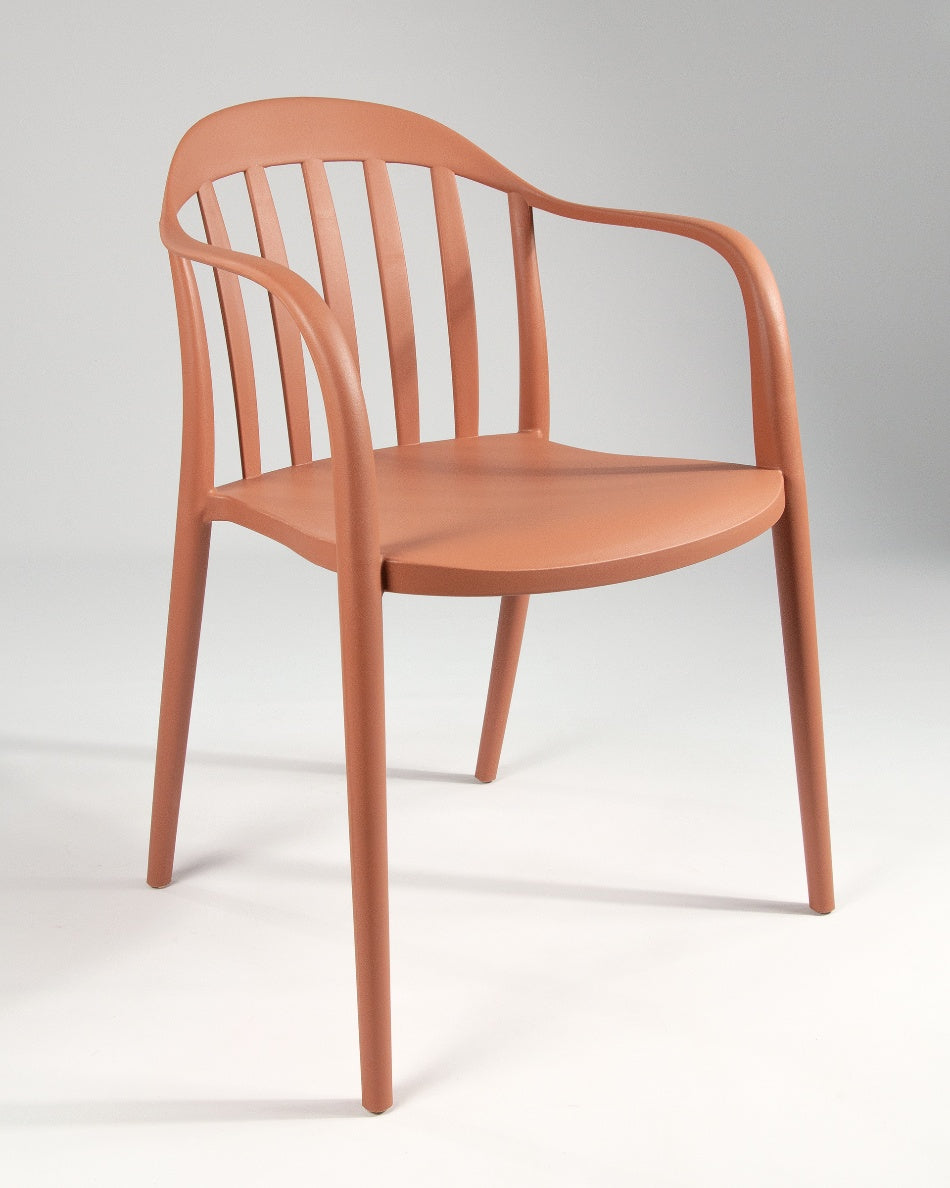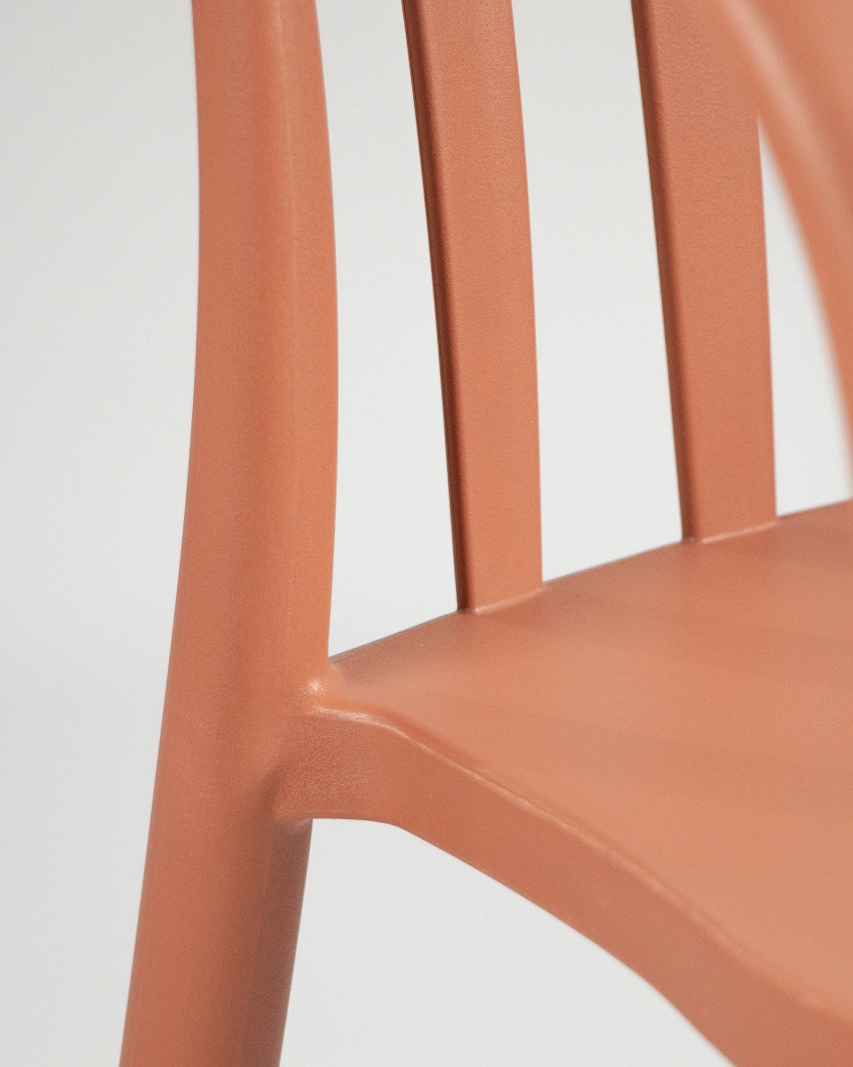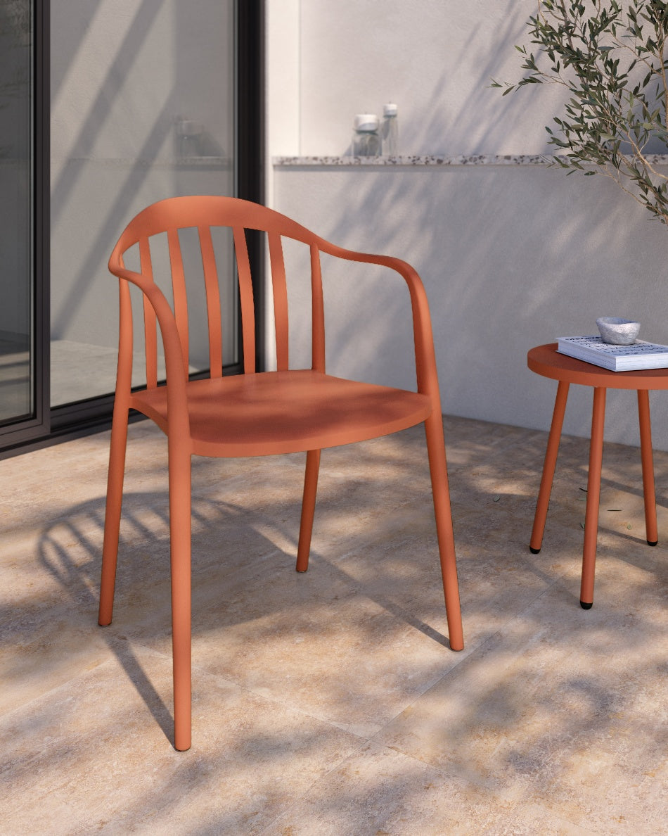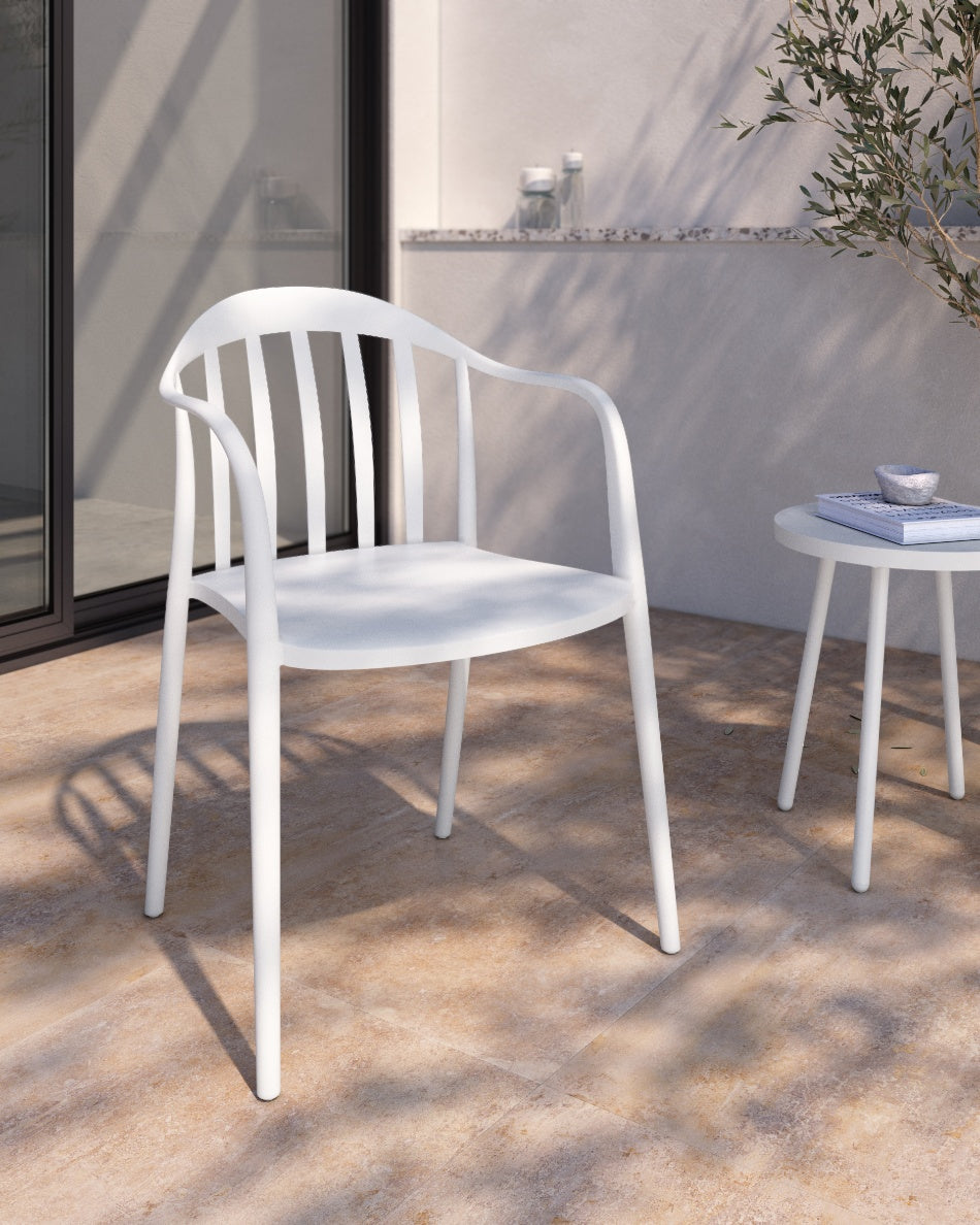 La silla Malibú presenta un diseño ligero y desenfadado, pensada para disfrutar del exterior con comodidad y un estilo actual. Su respaldo curvado con varillas aporta una estética fresca y abierta que encaja perfectamente en terrazas, patios o zonas de comedor al aire libre.