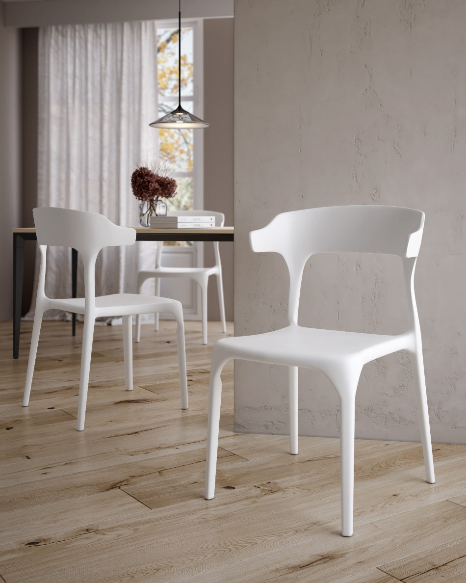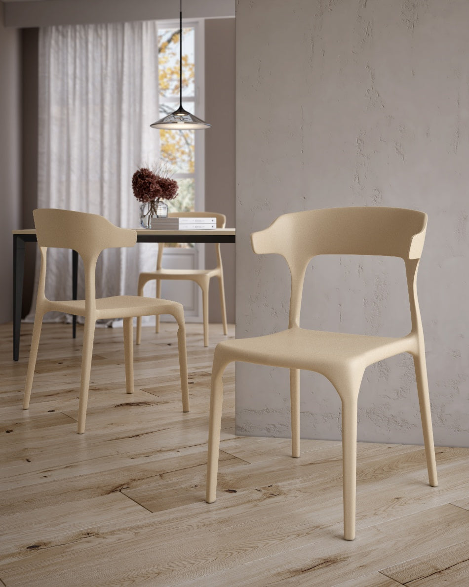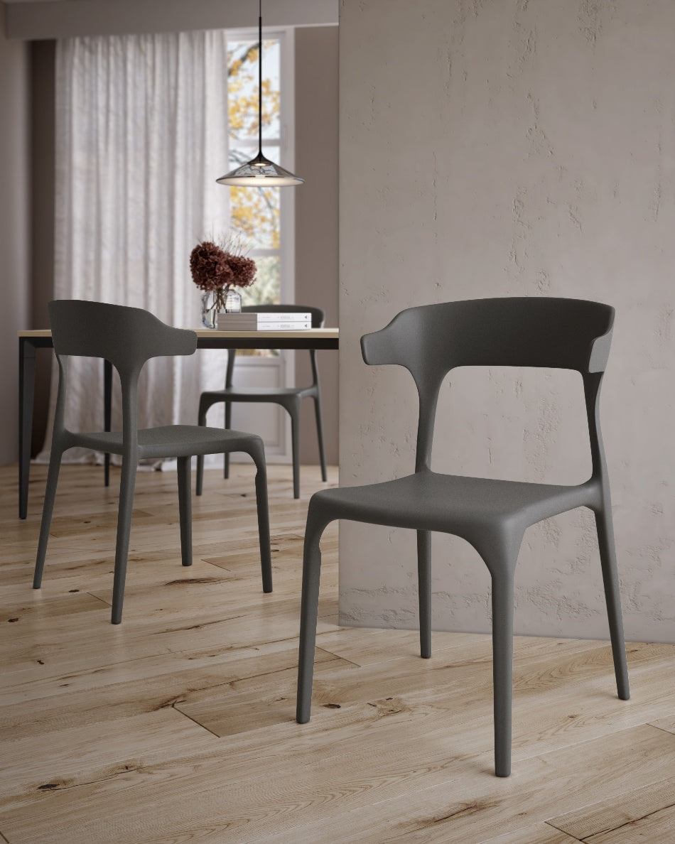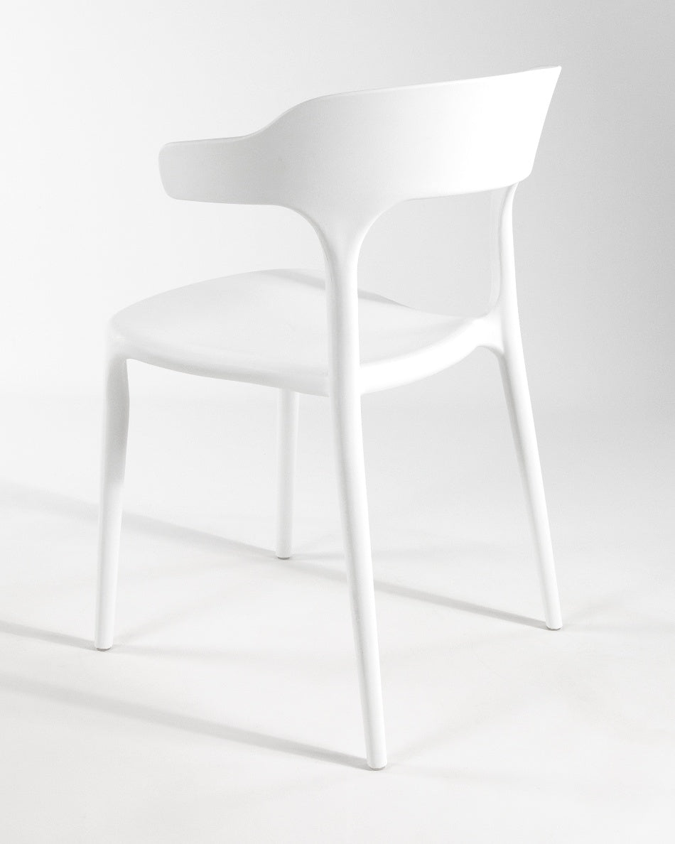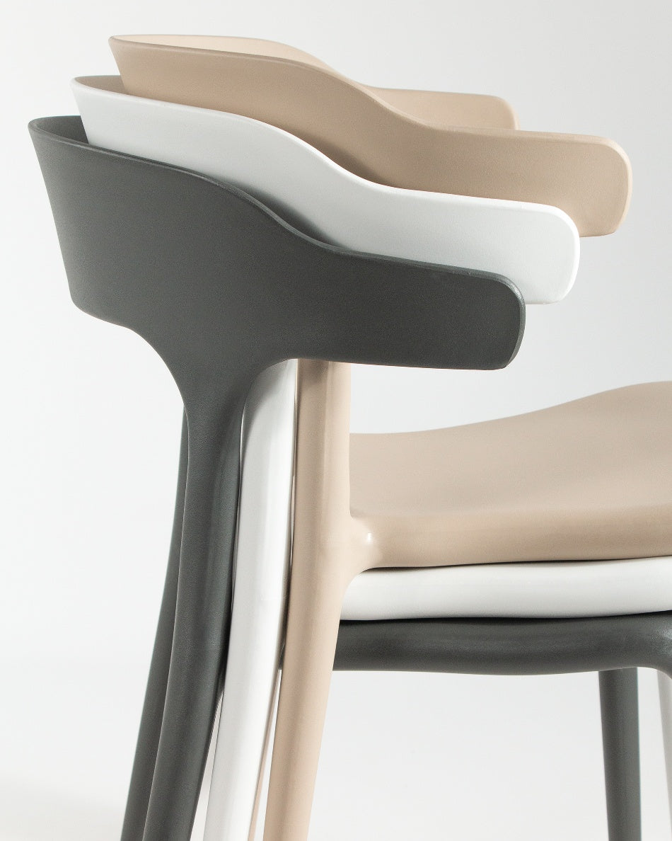 La silla Pisa presenta un diseño fluido y contemporáneo, con una silueta continua que aporta ligereza visual y un carácter actual al espacio. Su forma envolvente y proporciones equilibradas la convierten en una opción versátil para comedores, cocinas o zonas exteriores, integrándose con facilidad en ambientes modernos y funcionales.