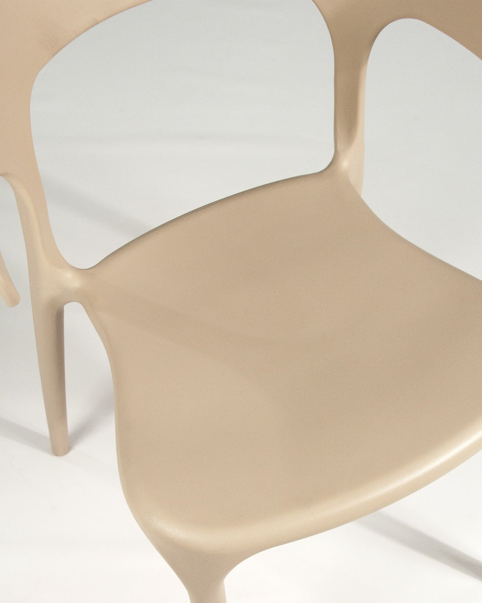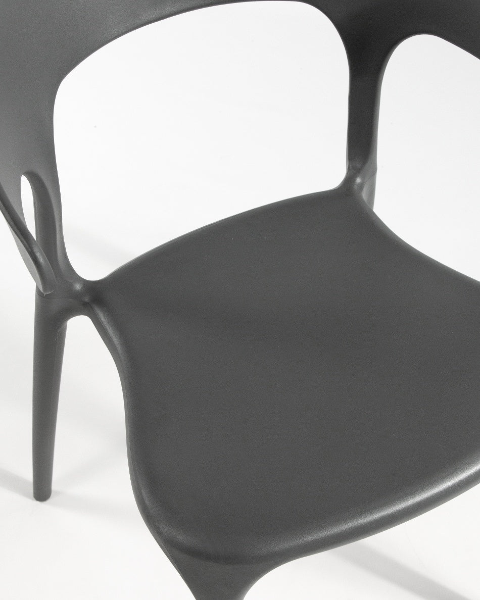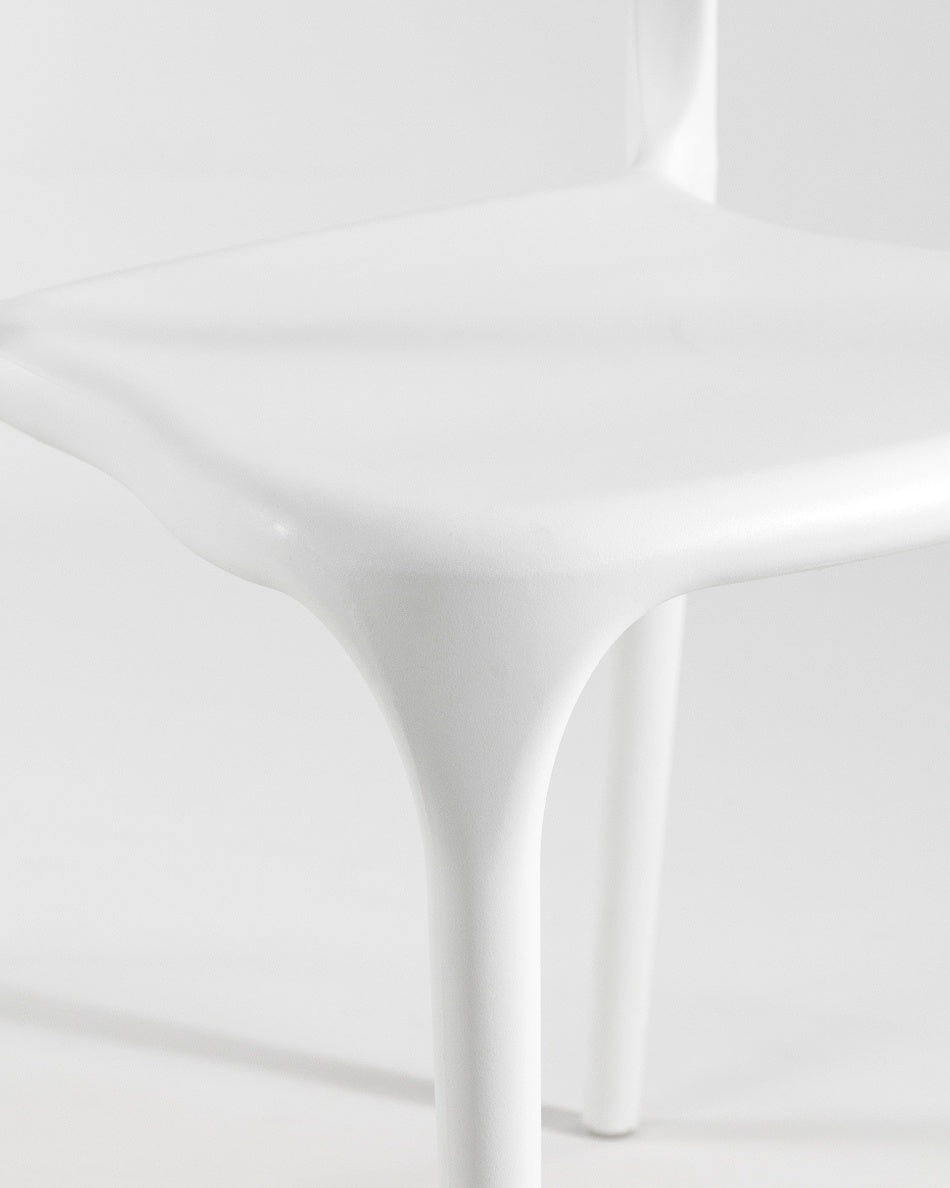 Fabricada en polipropileno, es resistente y fácil de mantener, además de ser apilable, lo que facilita su almacenaje cuando no se utiliza. Su diseño permite un uso cómodo tanto en interior como en exterior, manteniendo estabilidad y una presencia ligera en cualquier entorno.