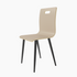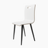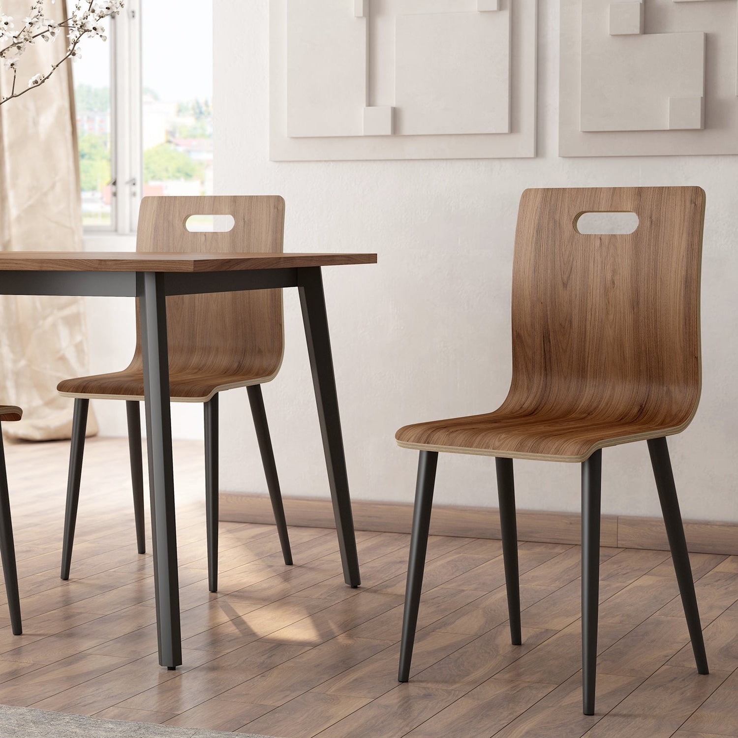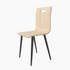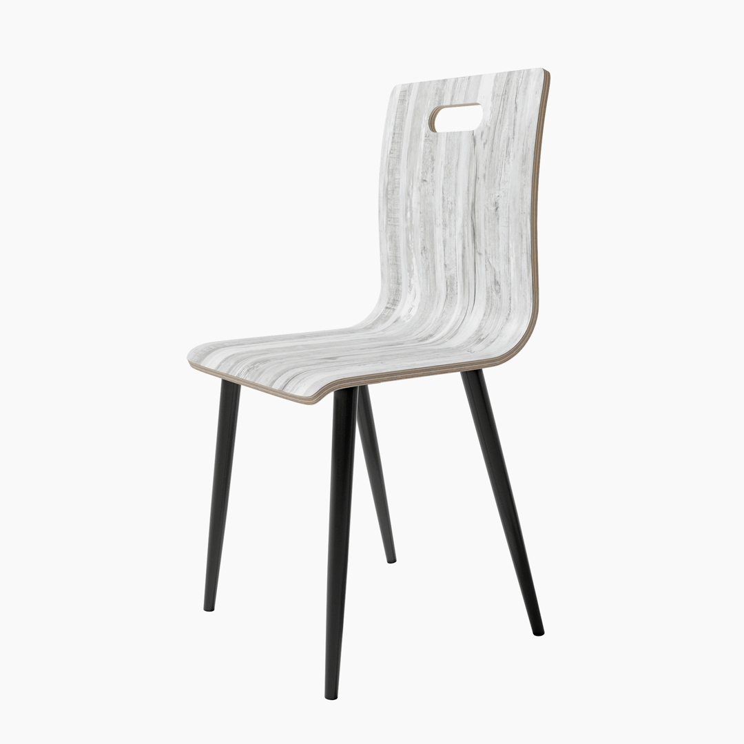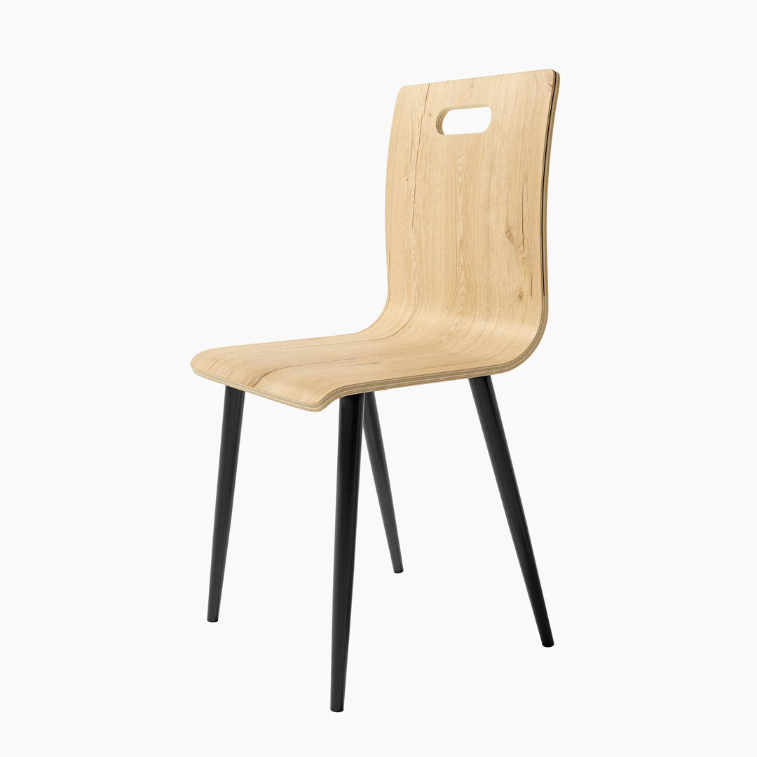 El respaldo y el asiento de tablero contrachapado aportan ligereza y resistencia, mientras que las patas metálicas negras garantizan estabilidad y un contraste sobrio que refuerza su carácter contemporáneo. El asa integrada en el respaldo facilita su manejo y añade un detalle práctico al conjunto.