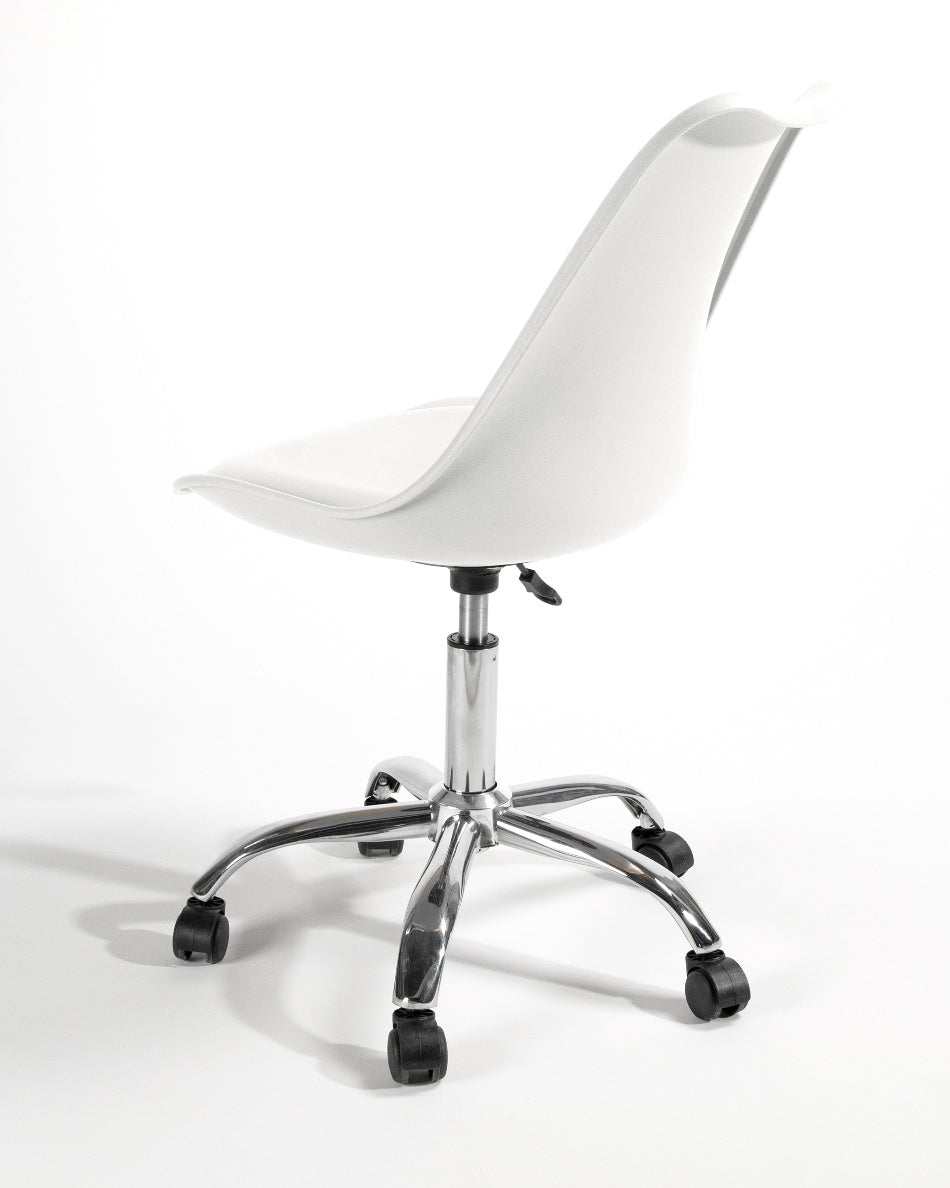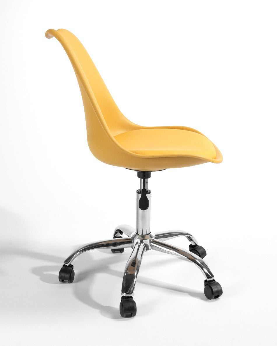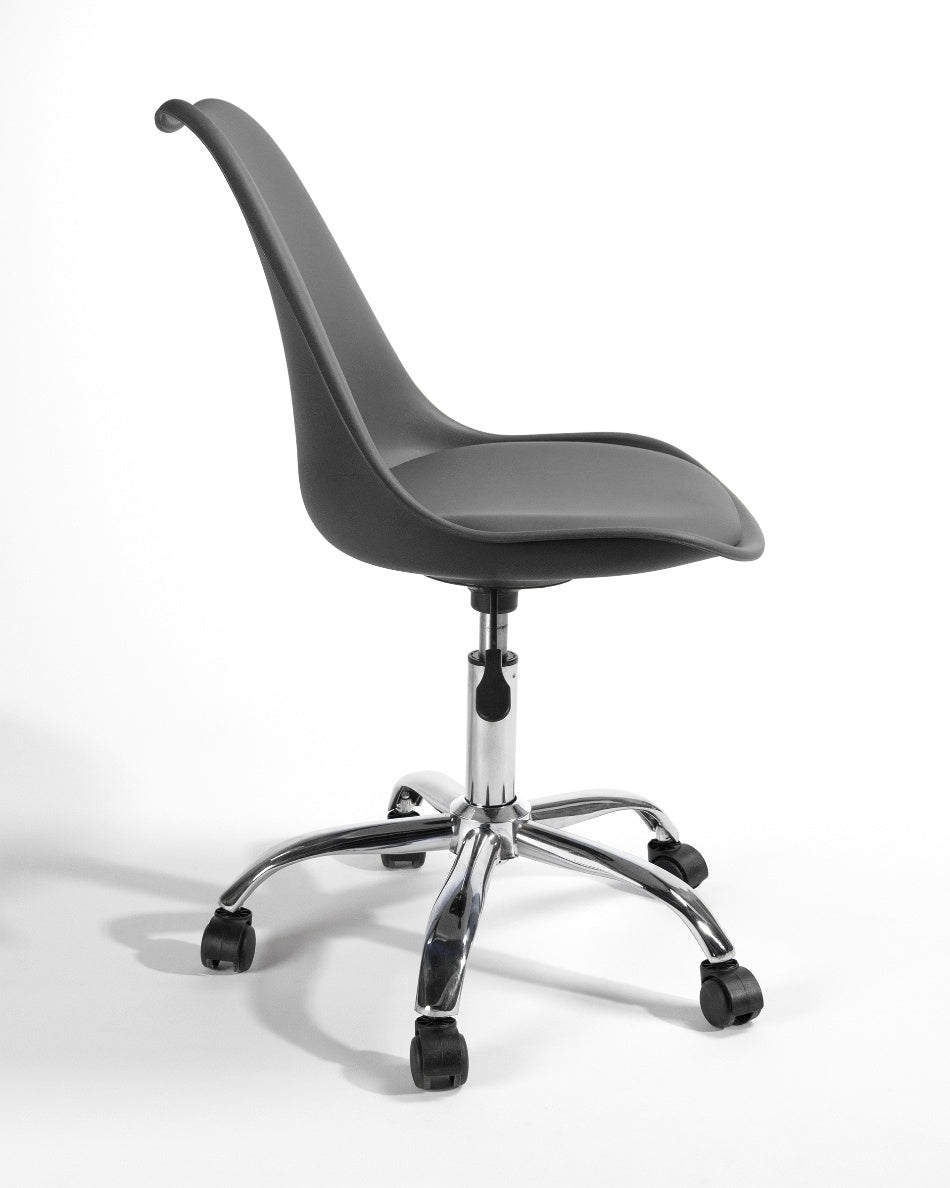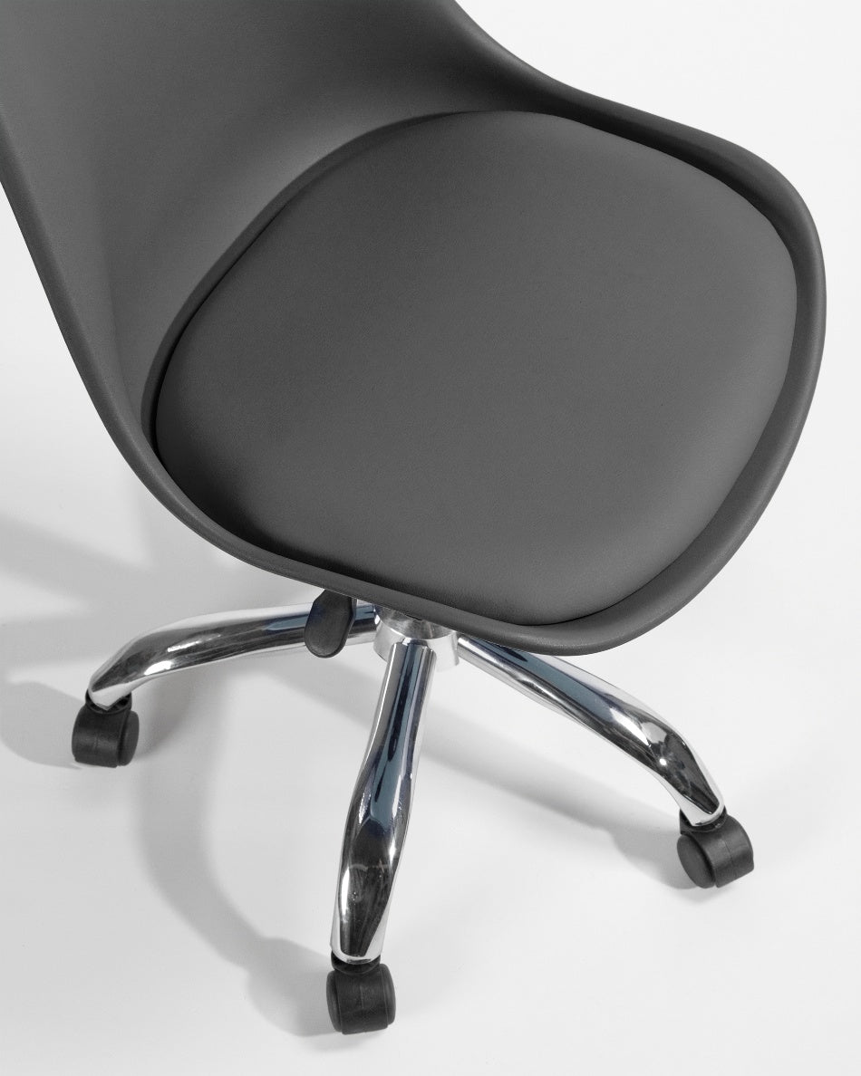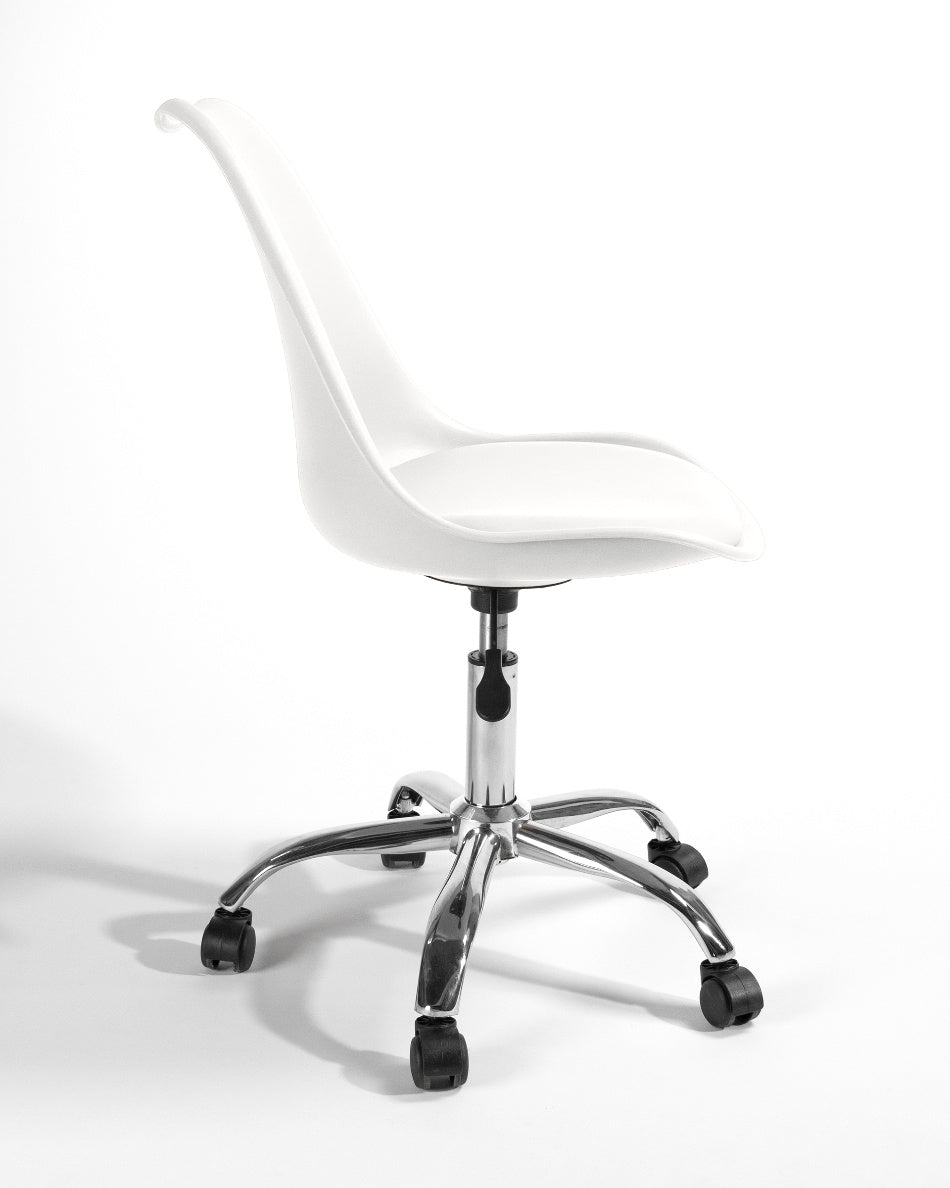 El asiento tapizado ofrece una sentada cómoda para el uso diario, mientras que la estructura de polipropileno aporta ligereza y resistencia. La base cromada con ruedas facilita el movimiento y mejora la ergonomía en jornadas de trabajo prolongadas, combinando practicidad y un aspecto actual.
