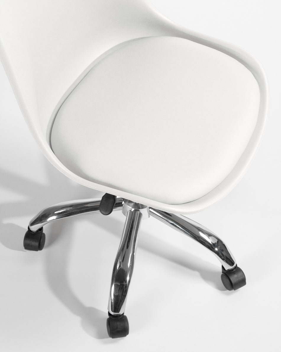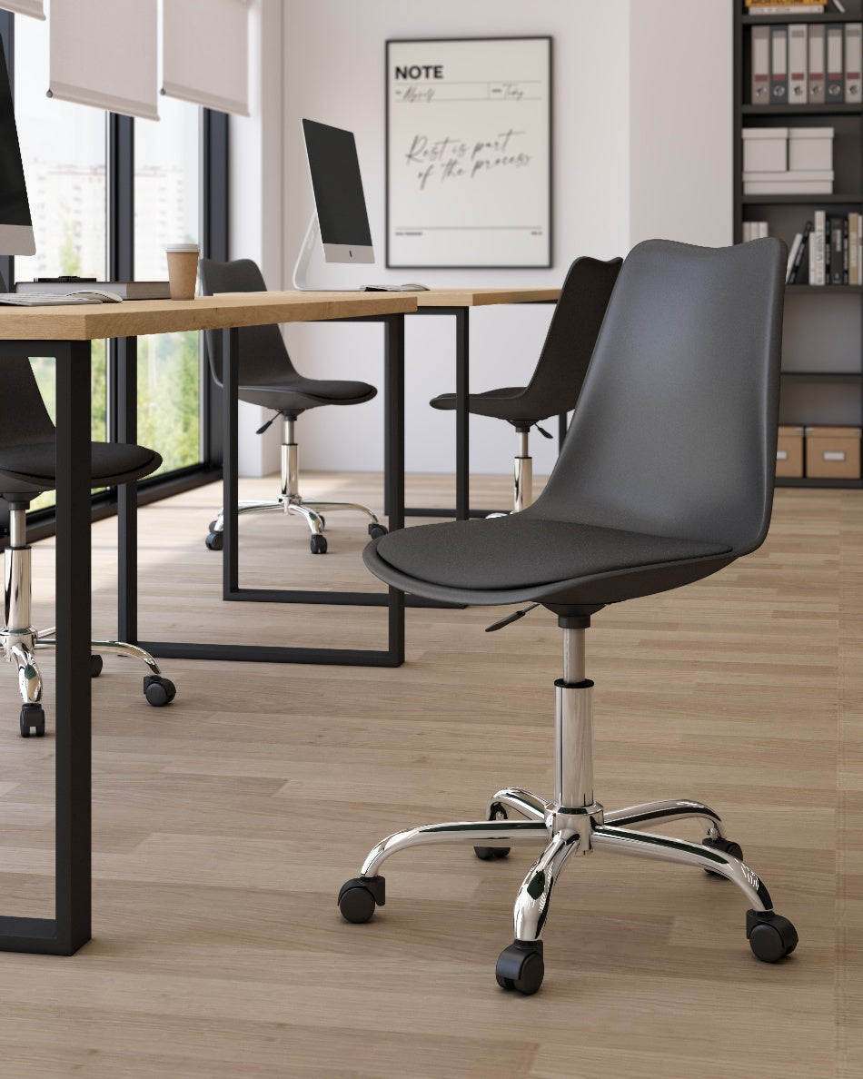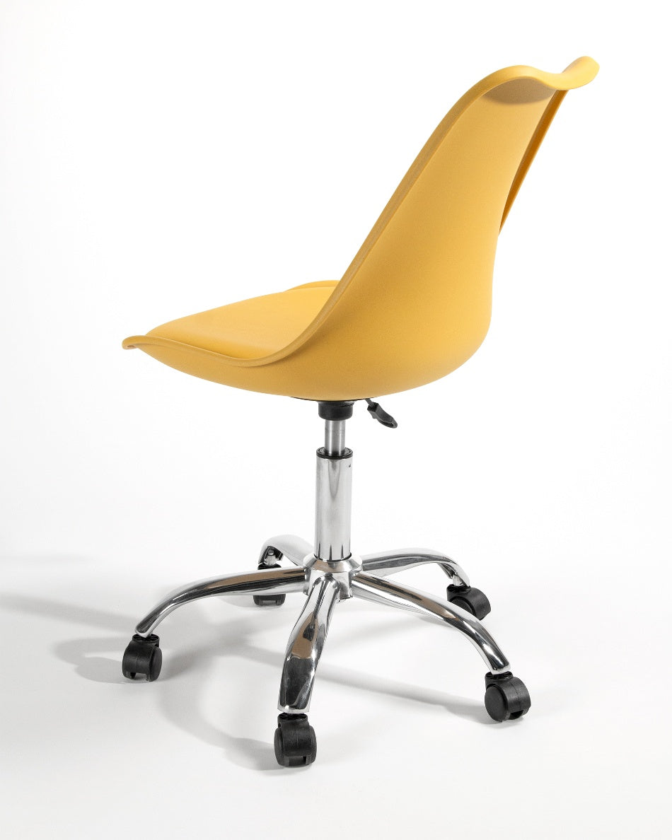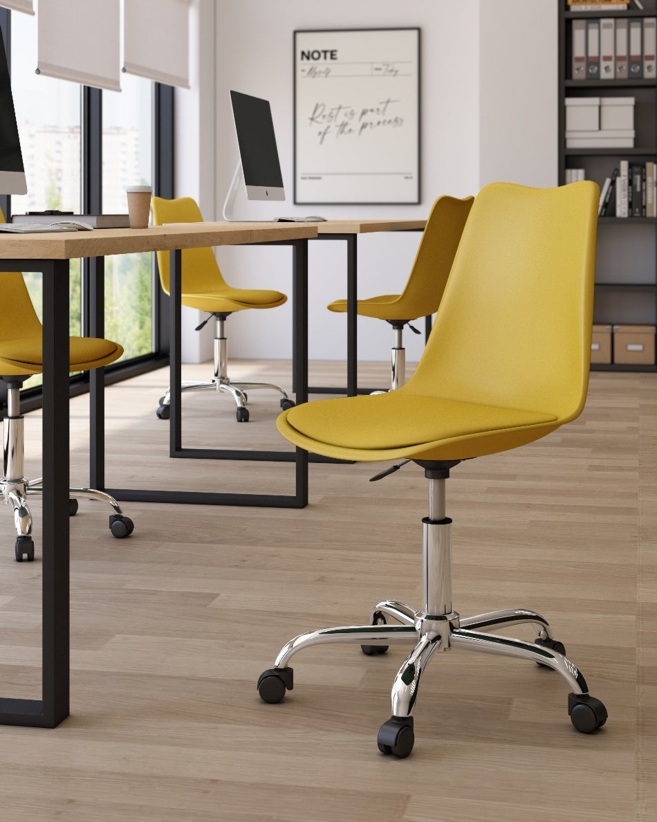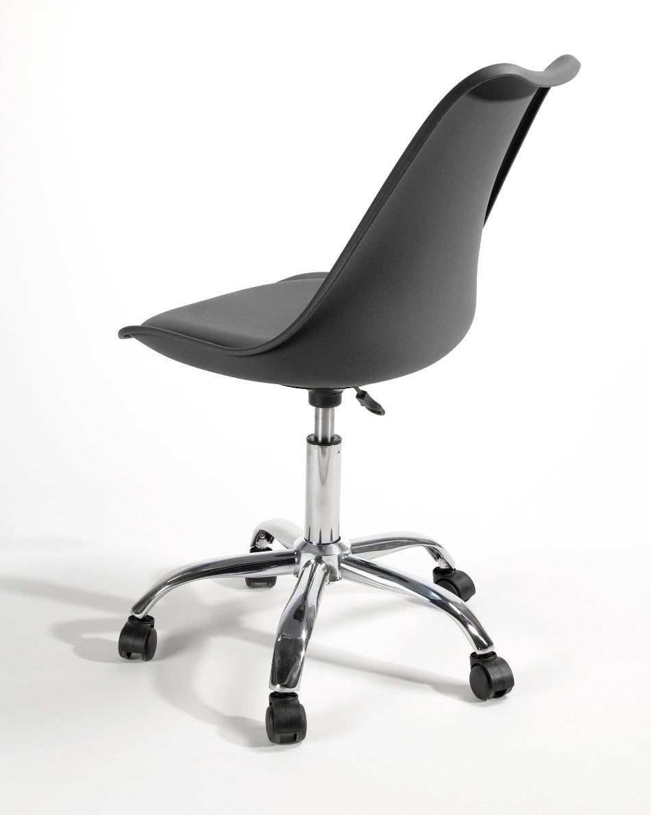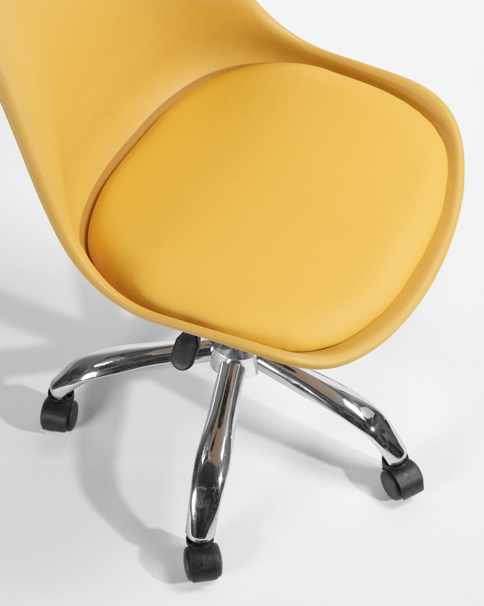 El asiento tapizado ofrece una sentada cómoda para el uso diario, mientras que la estructura de polipropileno aporta ligereza y resistencia. La base cromada con ruedas facilita el movimiento y mejora la ergonomía en jornadas de trabajo prolongadas, combinando practicidad y un aspecto actual.