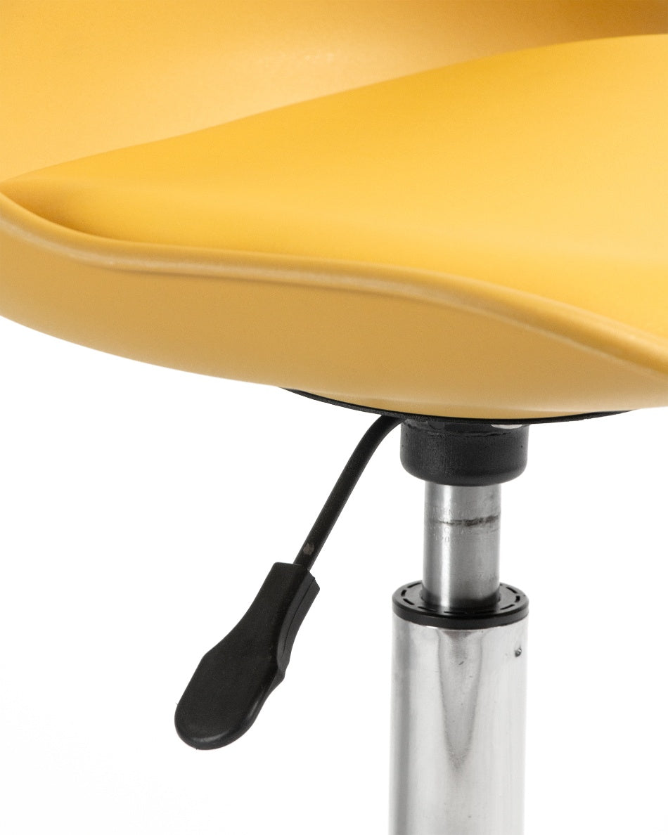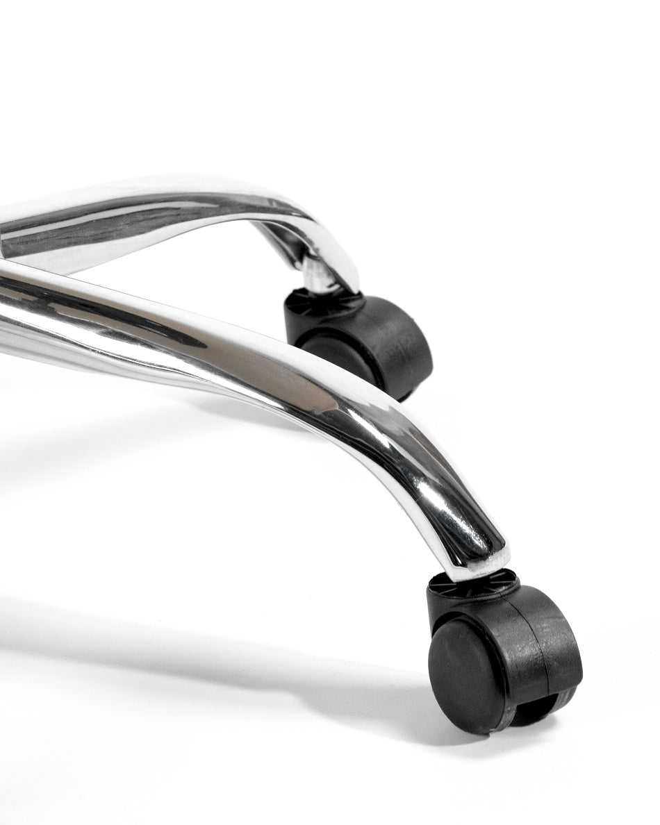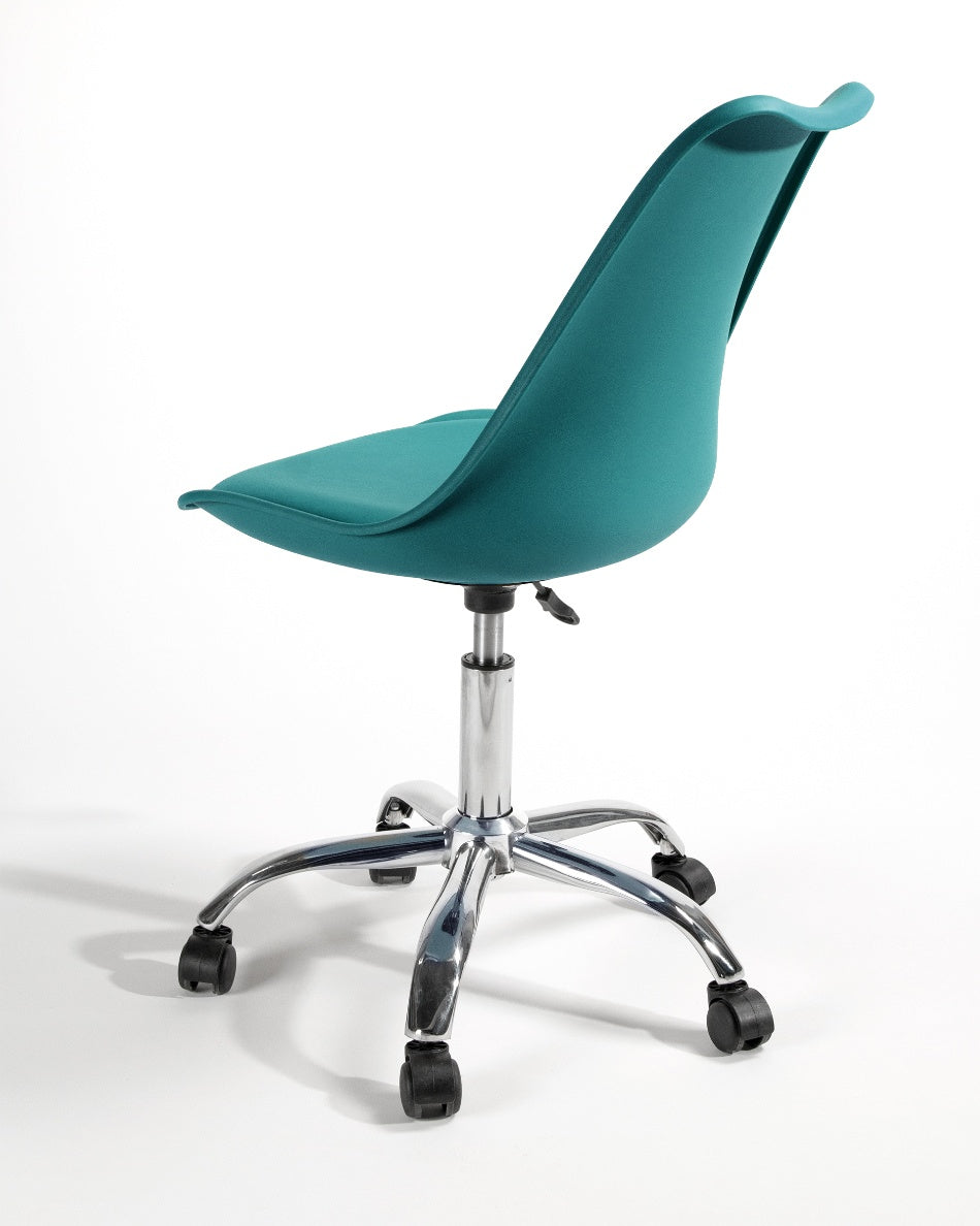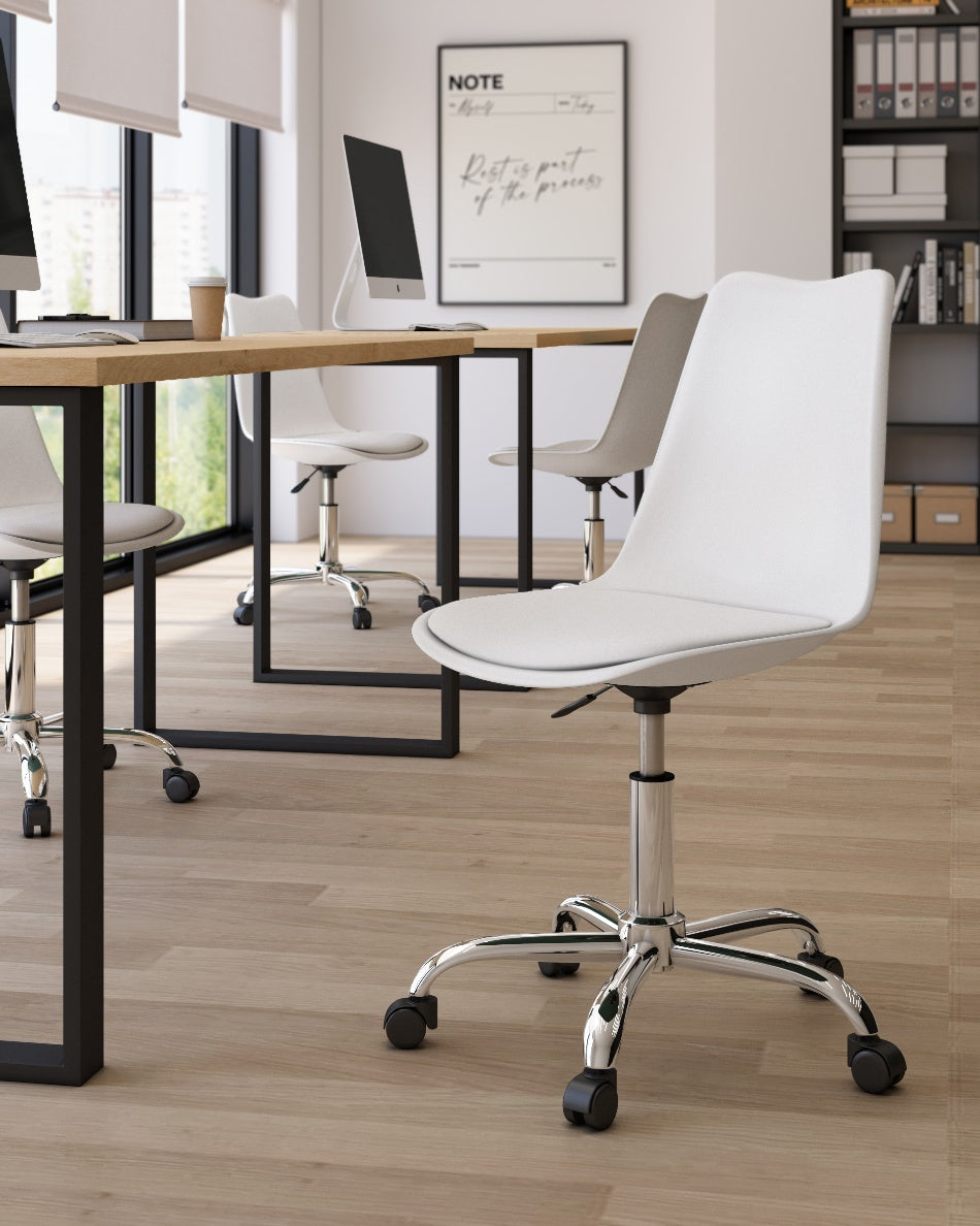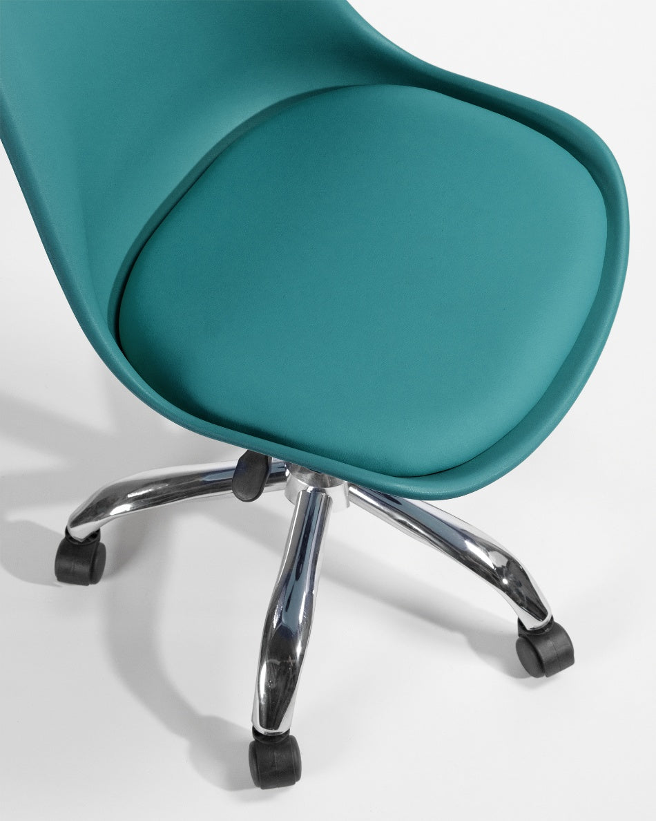 El asiento tapizado ofrece una sentada cómoda para el uso diario, mientras que la estructura de polipropileno aporta ligereza y resistencia. La base cromada con ruedas facilita el movimiento y mejora la ergonomía en jornadas de trabajo prolongadas, combinando practicidad y un aspecto actual.