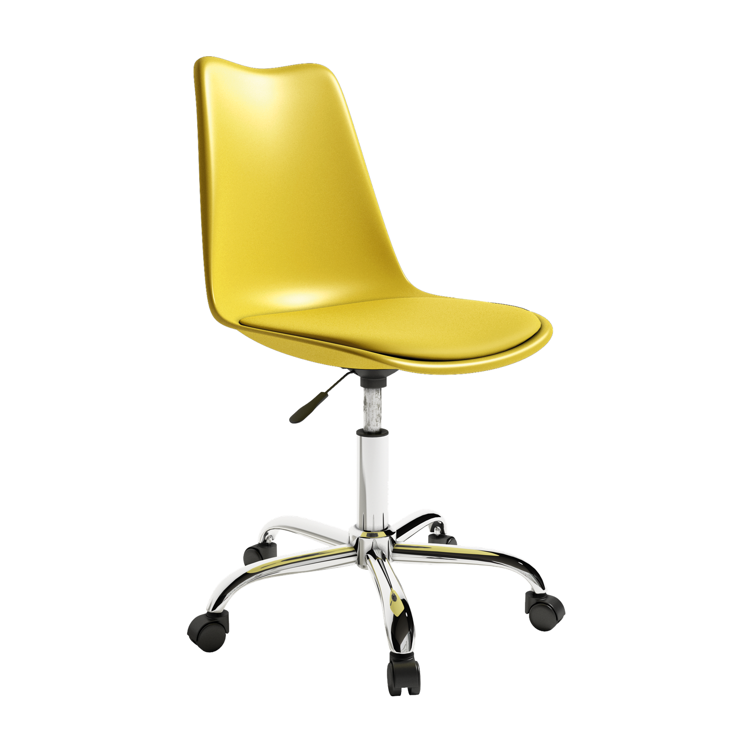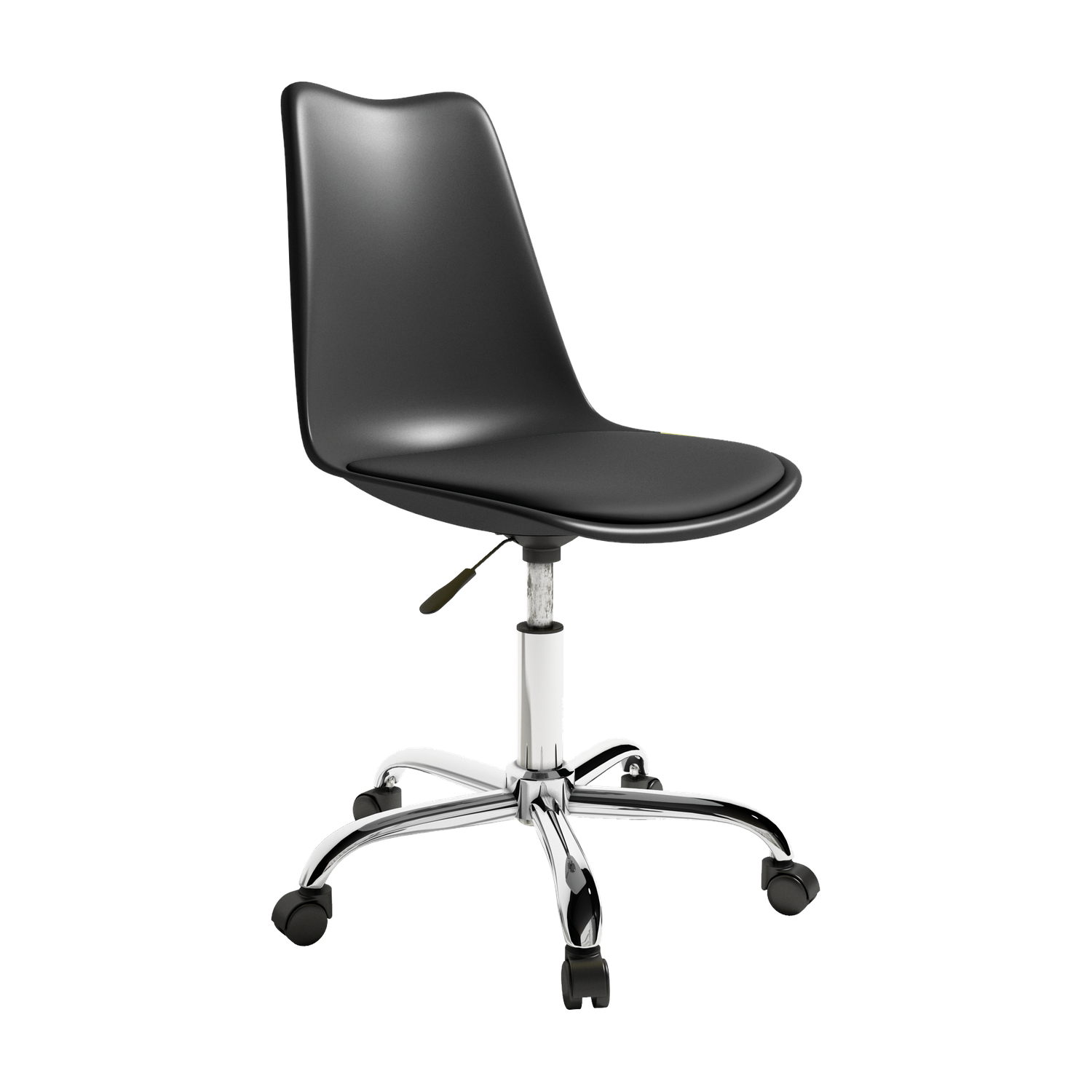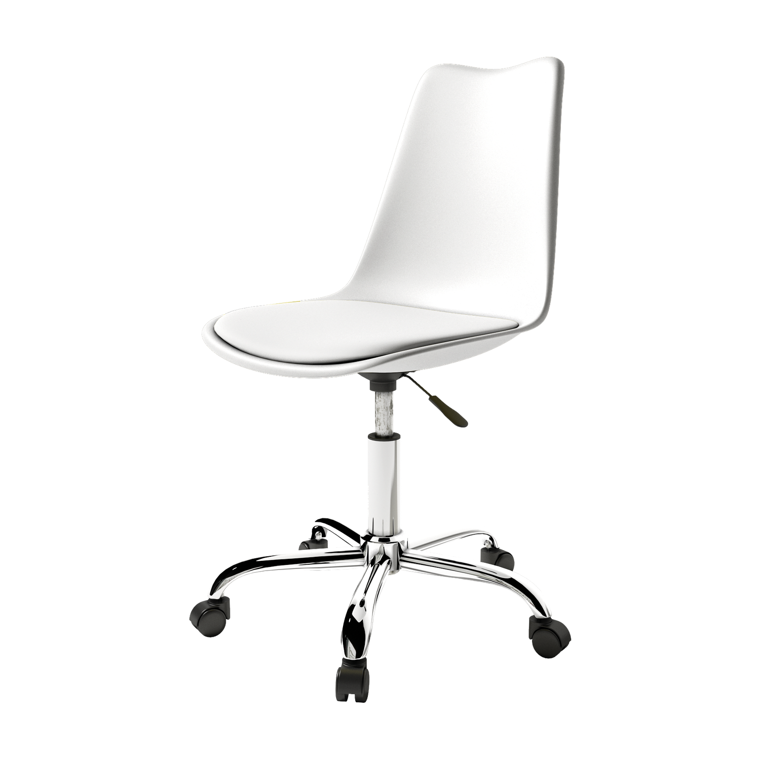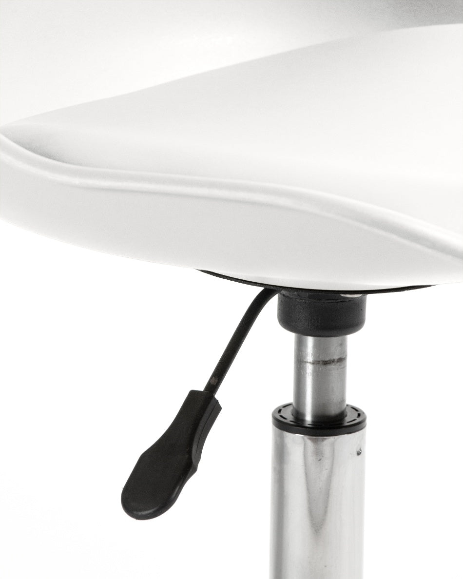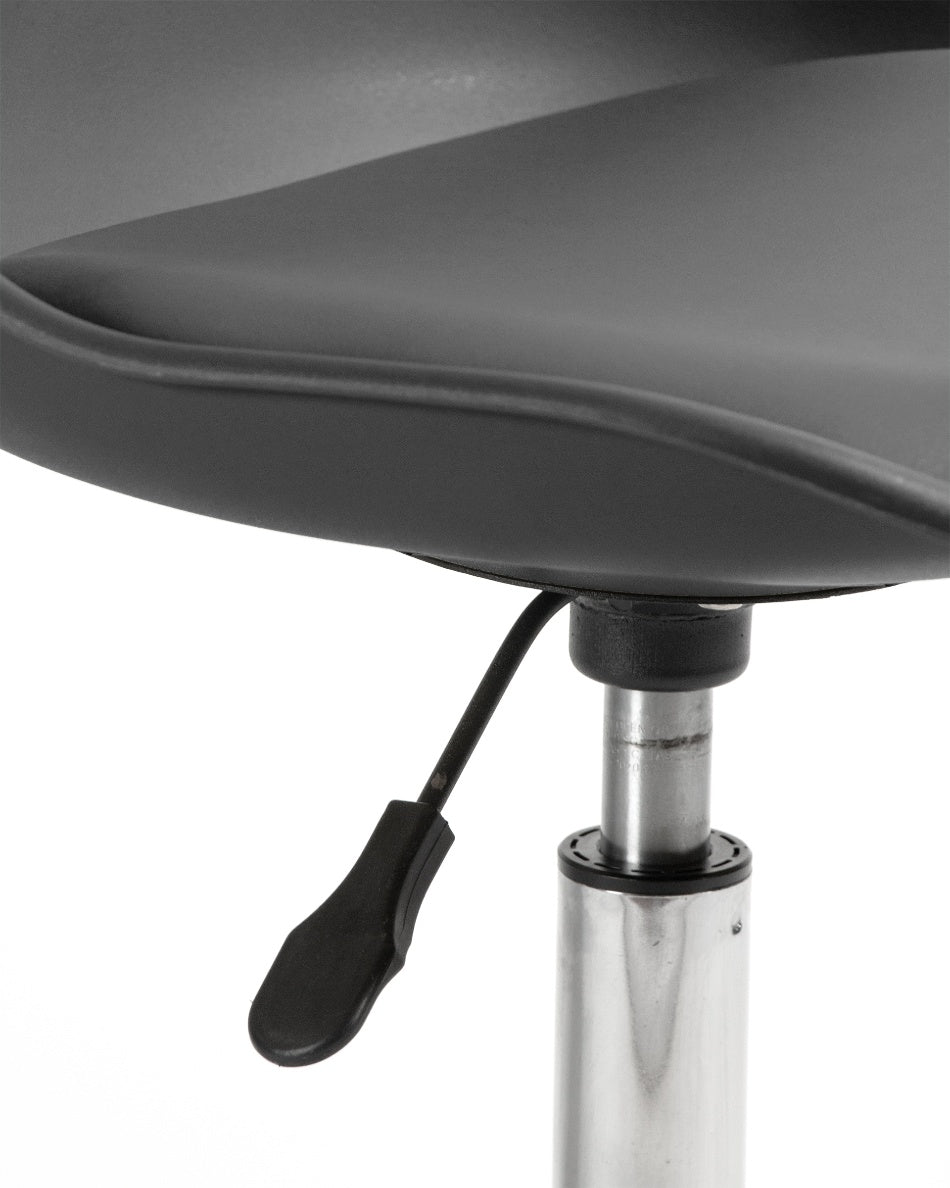 El asiento tapizado ofrece una sentada cómoda para el uso diario, mientras que la estructura de polipropileno aporta ligereza y resistencia. La base cromada con ruedas facilita el movimiento y mejora la ergonomía en jornadas de trabajo prolongadas, combinando practicidad y un aspecto actual.