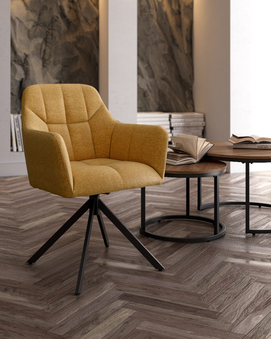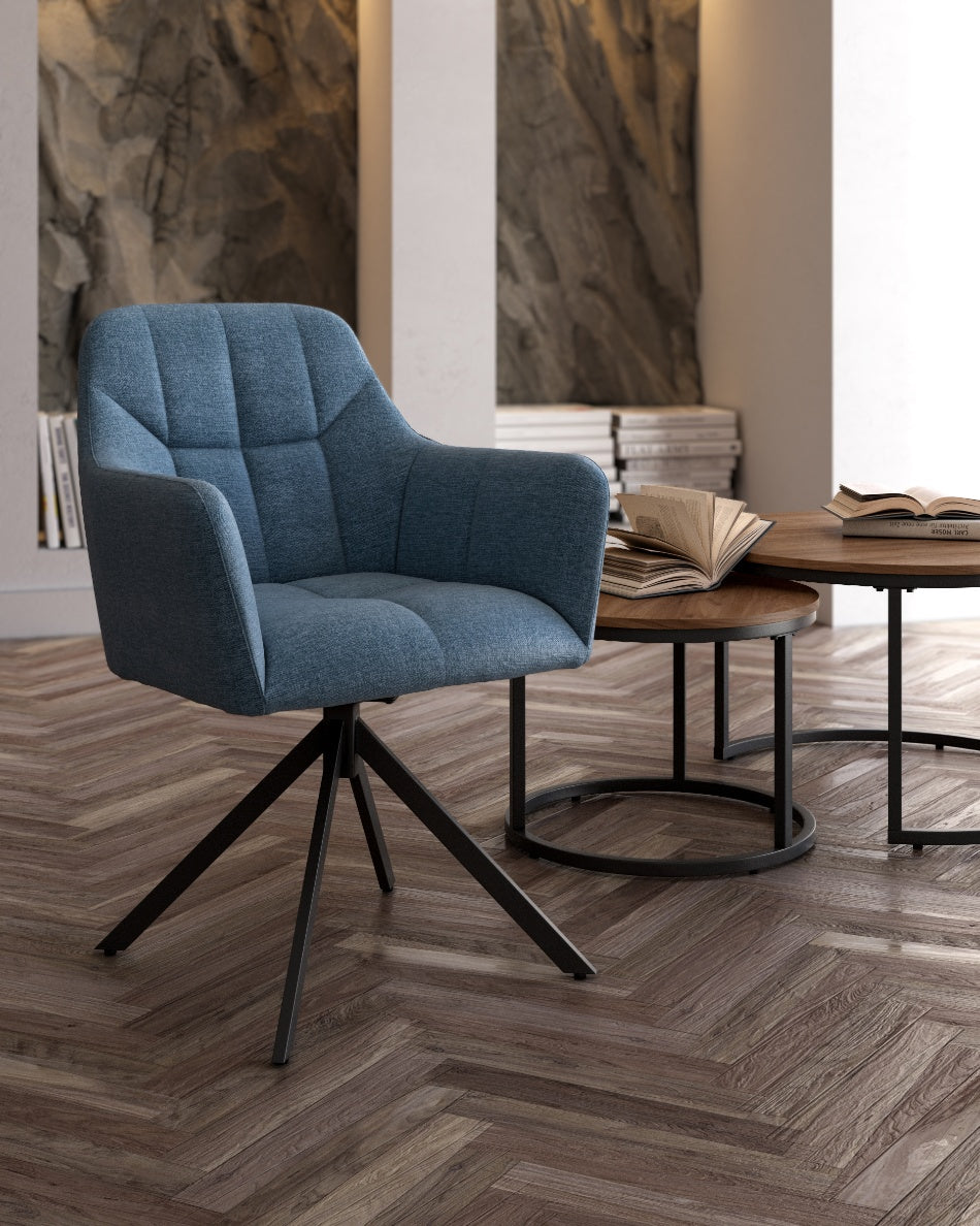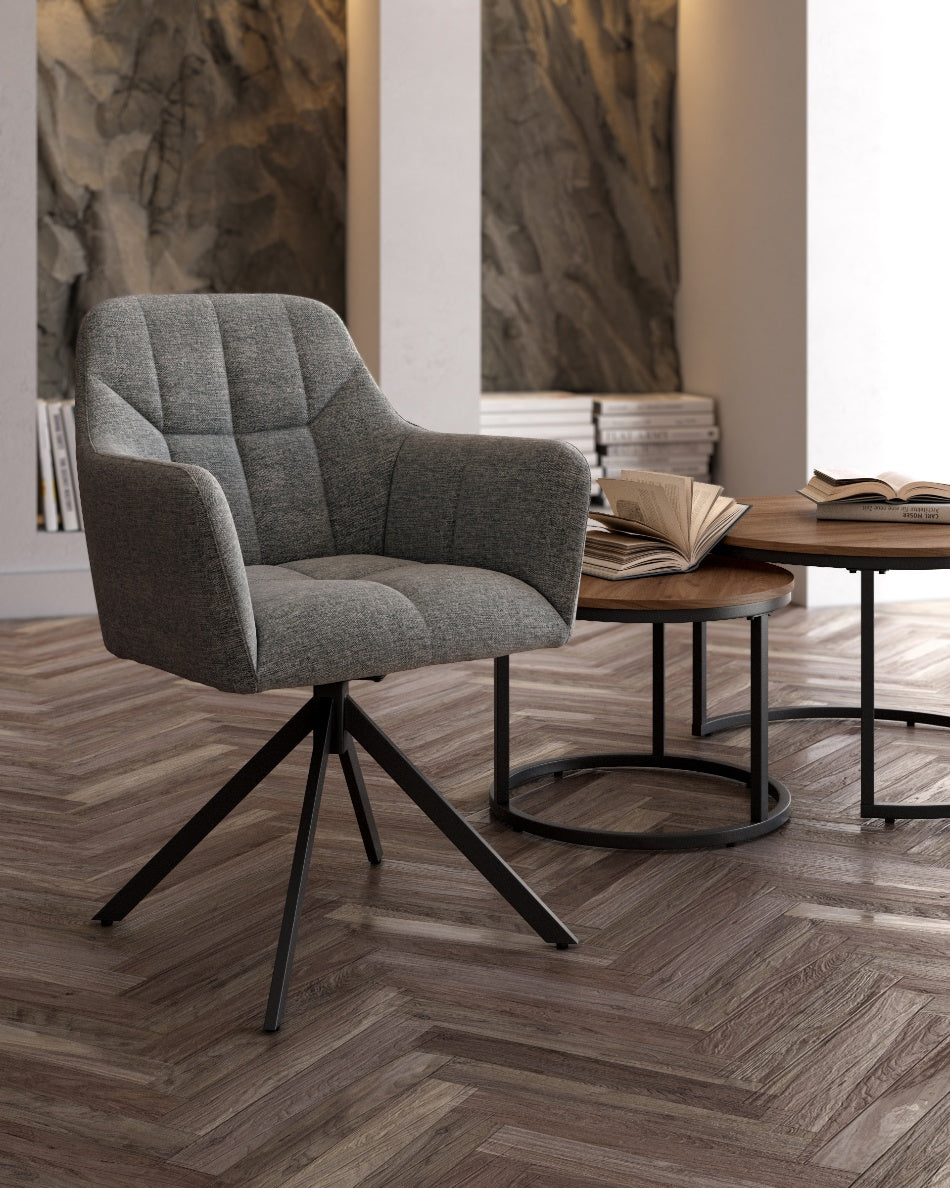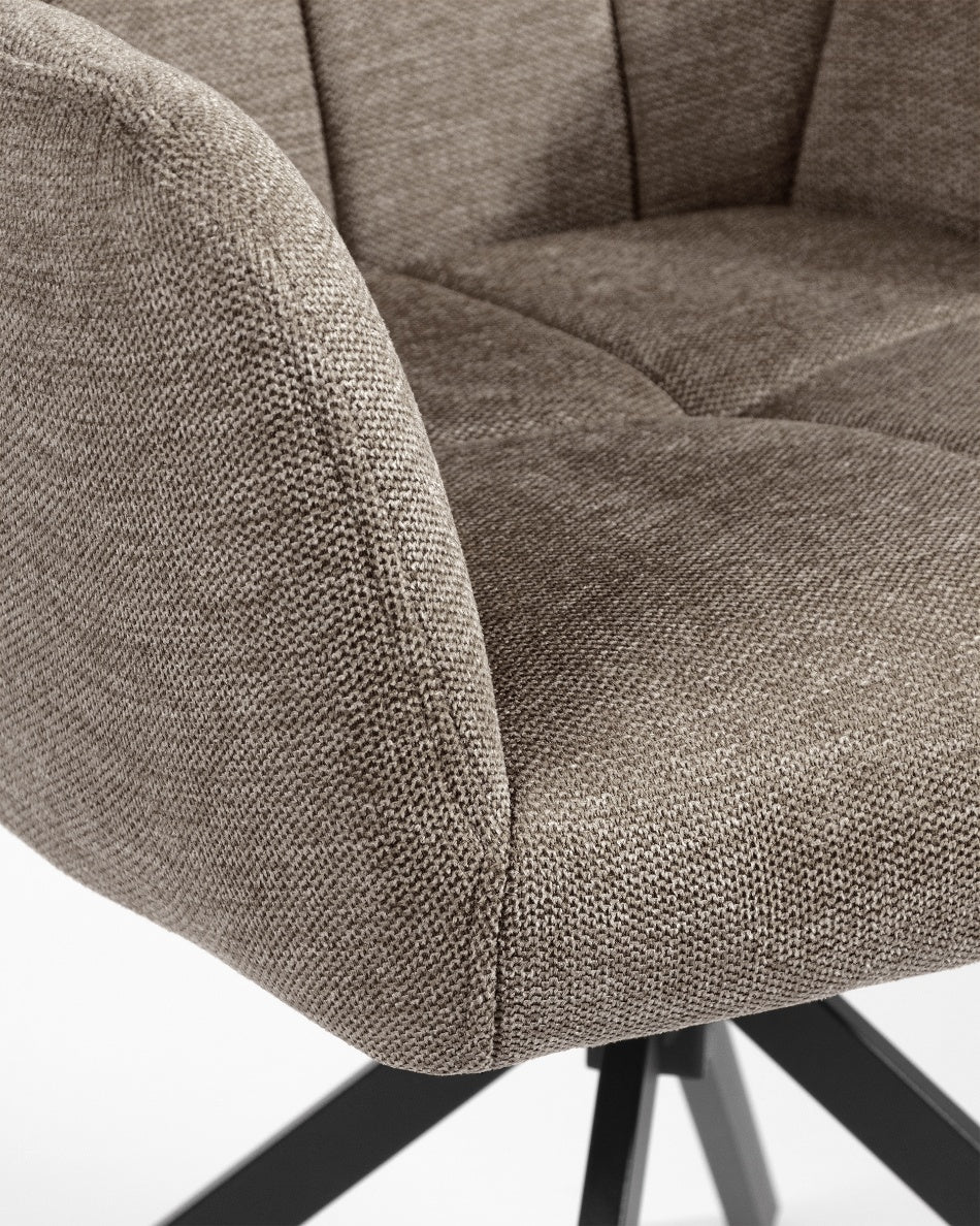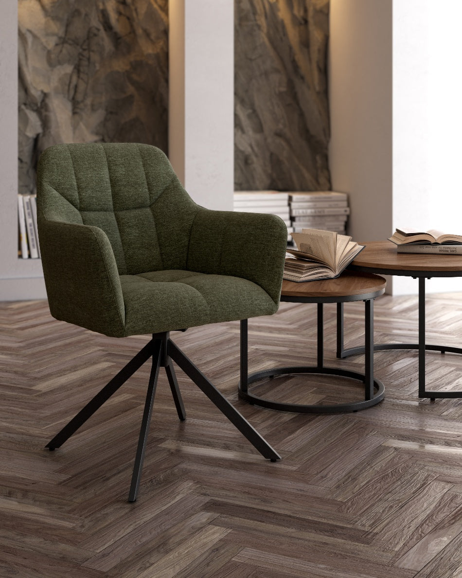La silla giratoria Bérgamo combina un diseño acogedor y actual con una gran comodidad, pensada para comedores, zonas de estar o espacios de reunión donde se busca confort sin renunciar a una estética cuidada. Su respaldo envolvente y sus líneas suaves aportan presencia y carácter, integrándose fácilmente en interiores modernos y cálidos.