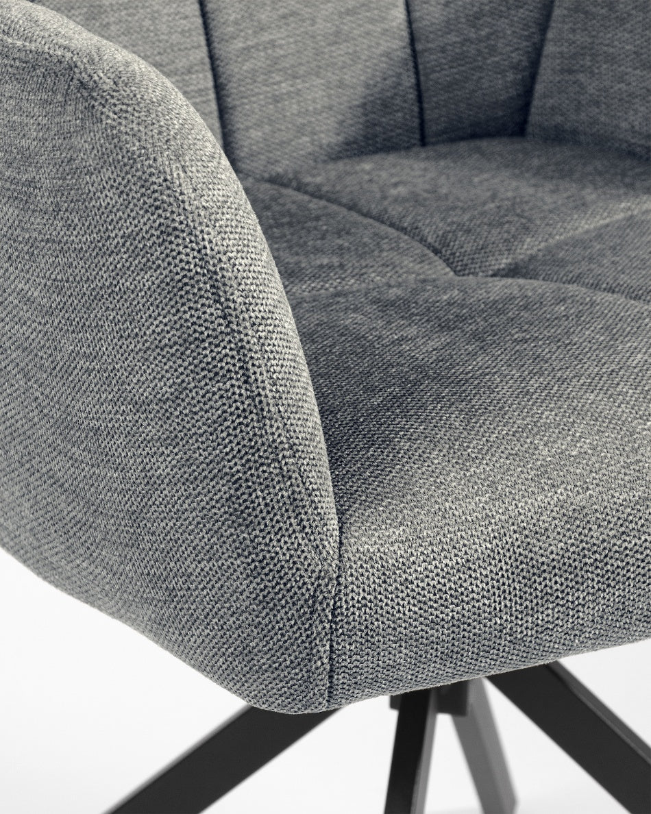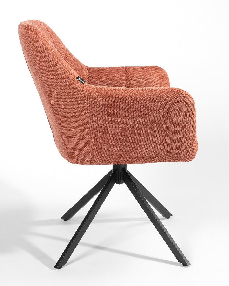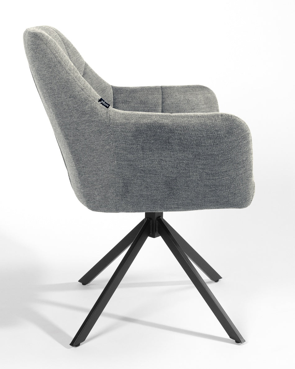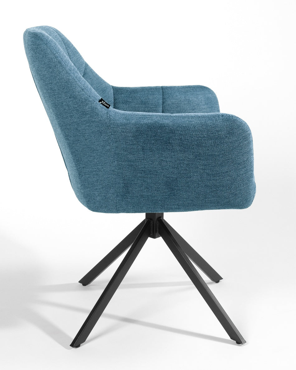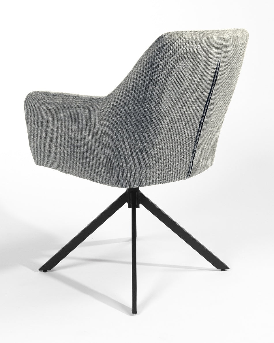 El asiento y el respaldo tapizados ofrecen una sentada confortable para el uso diario, mientras que la base metálica con sistema giratorio de retorno 180° facilita el movimiento y ayuda a mantener el orden visual alrededor de la mesa. Un diseño equilibrado que une funcionalidad y estilo, ideal tanto para el hogar como para proyectos contract.