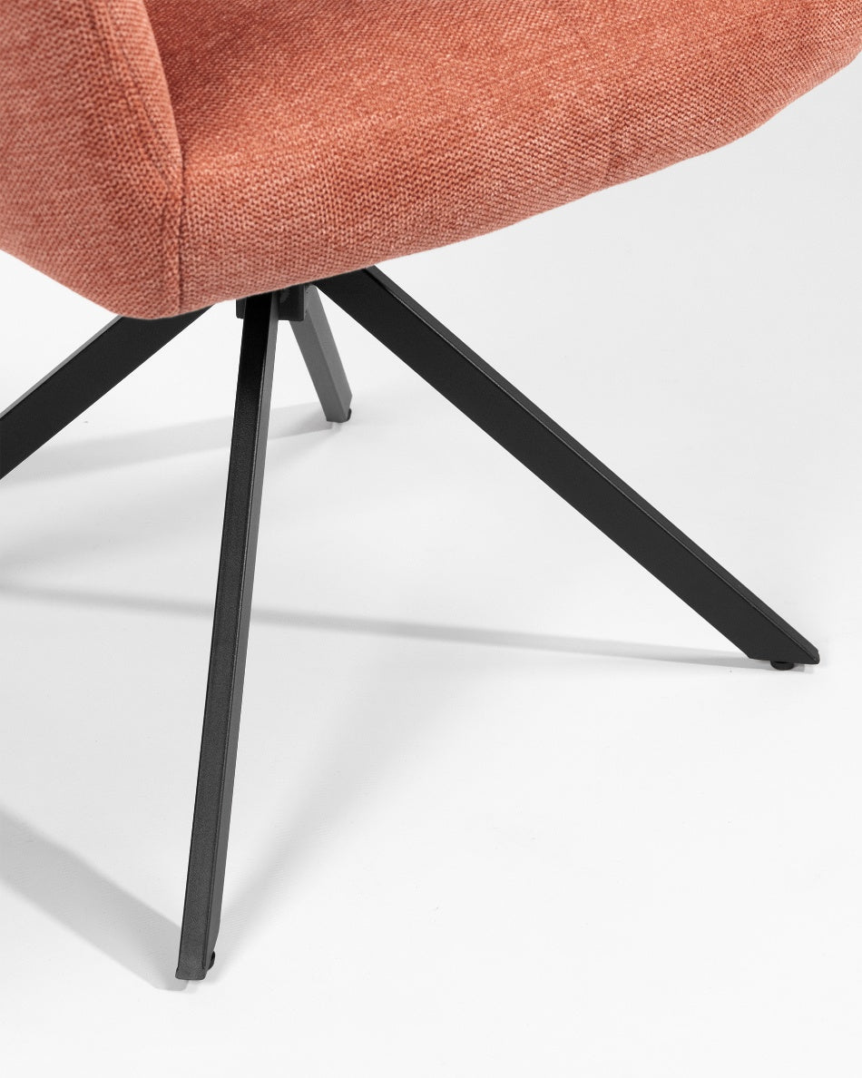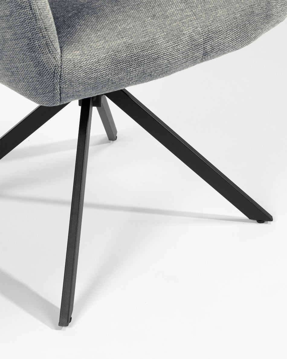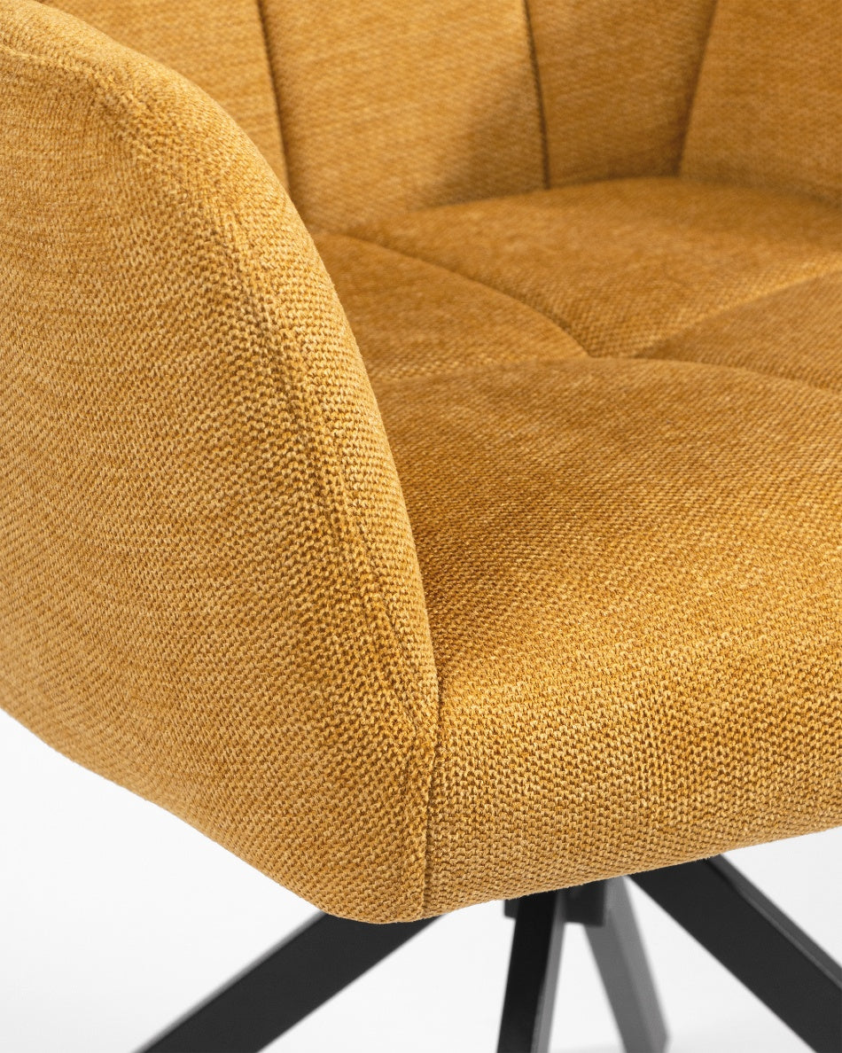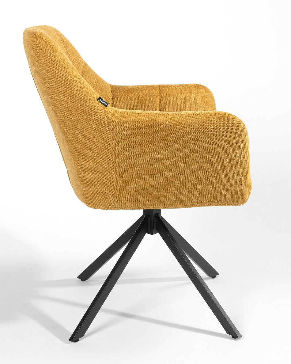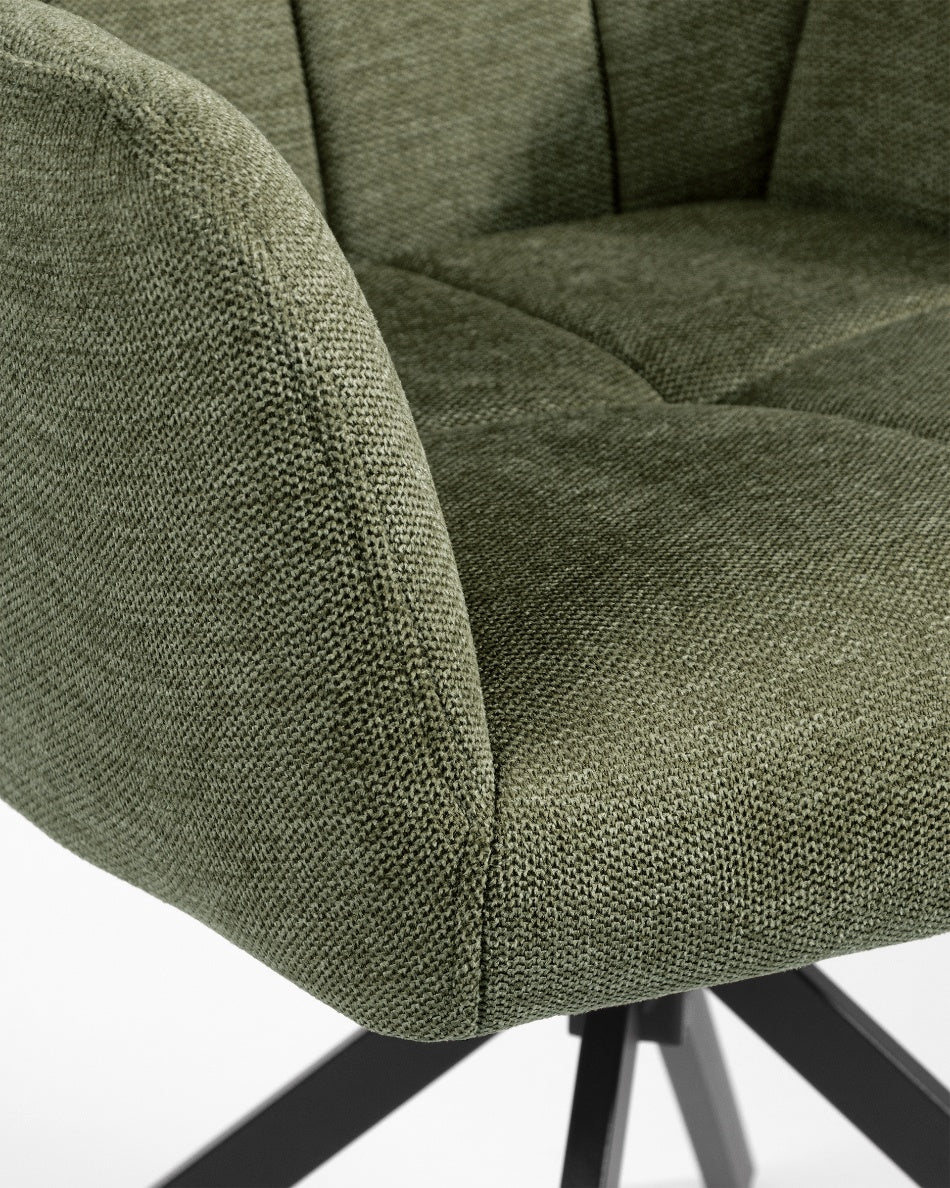 El asiento y el respaldo tapizados ofrecen una sentada confortable para el uso diario, mientras que la base metálica con sistema giratorio de retorno 180° facilita el movimiento y ayuda a mantener el orden visual alrededor de la mesa. Un diseño equilibrado que une funcionalidad y estilo, ideal tanto para el hogar como para proyectos contract.