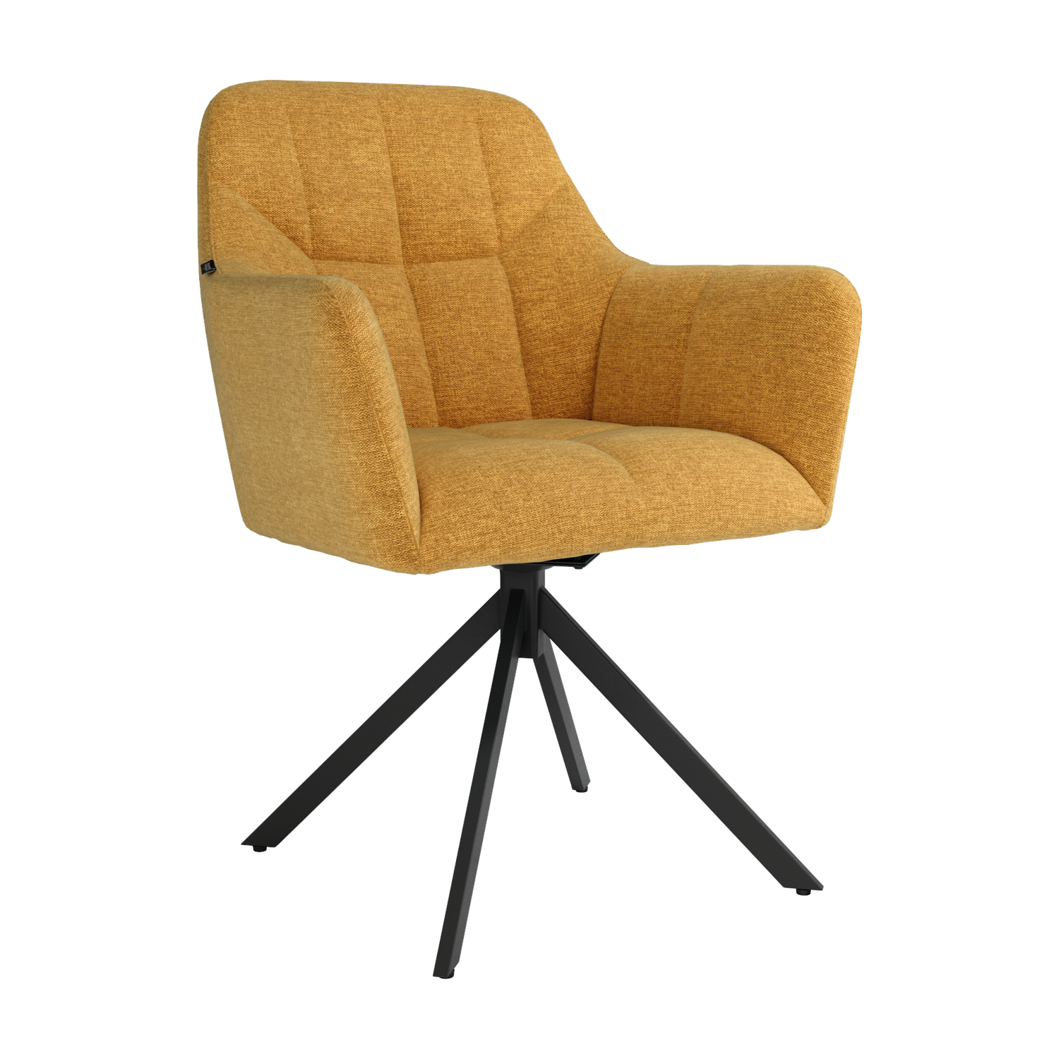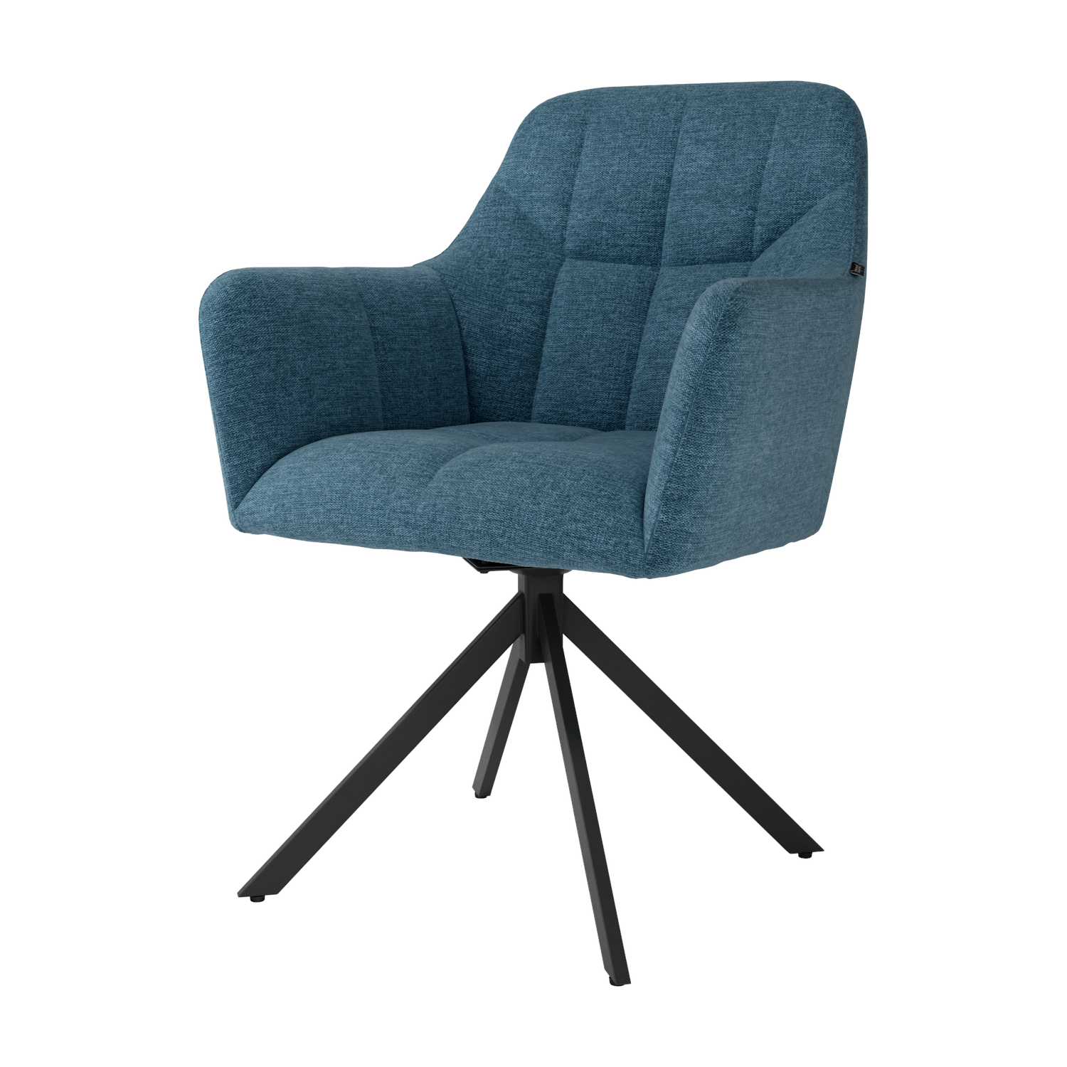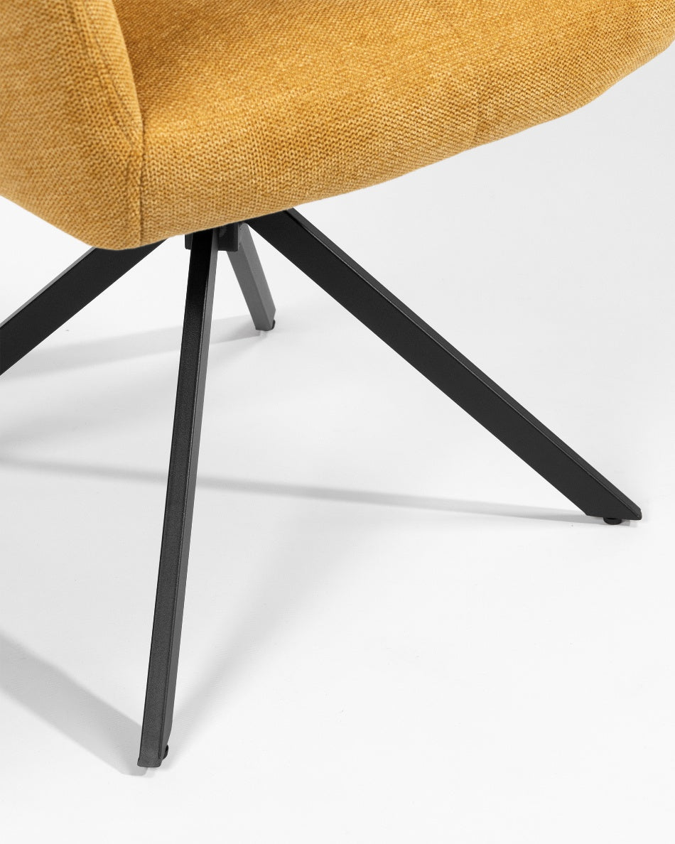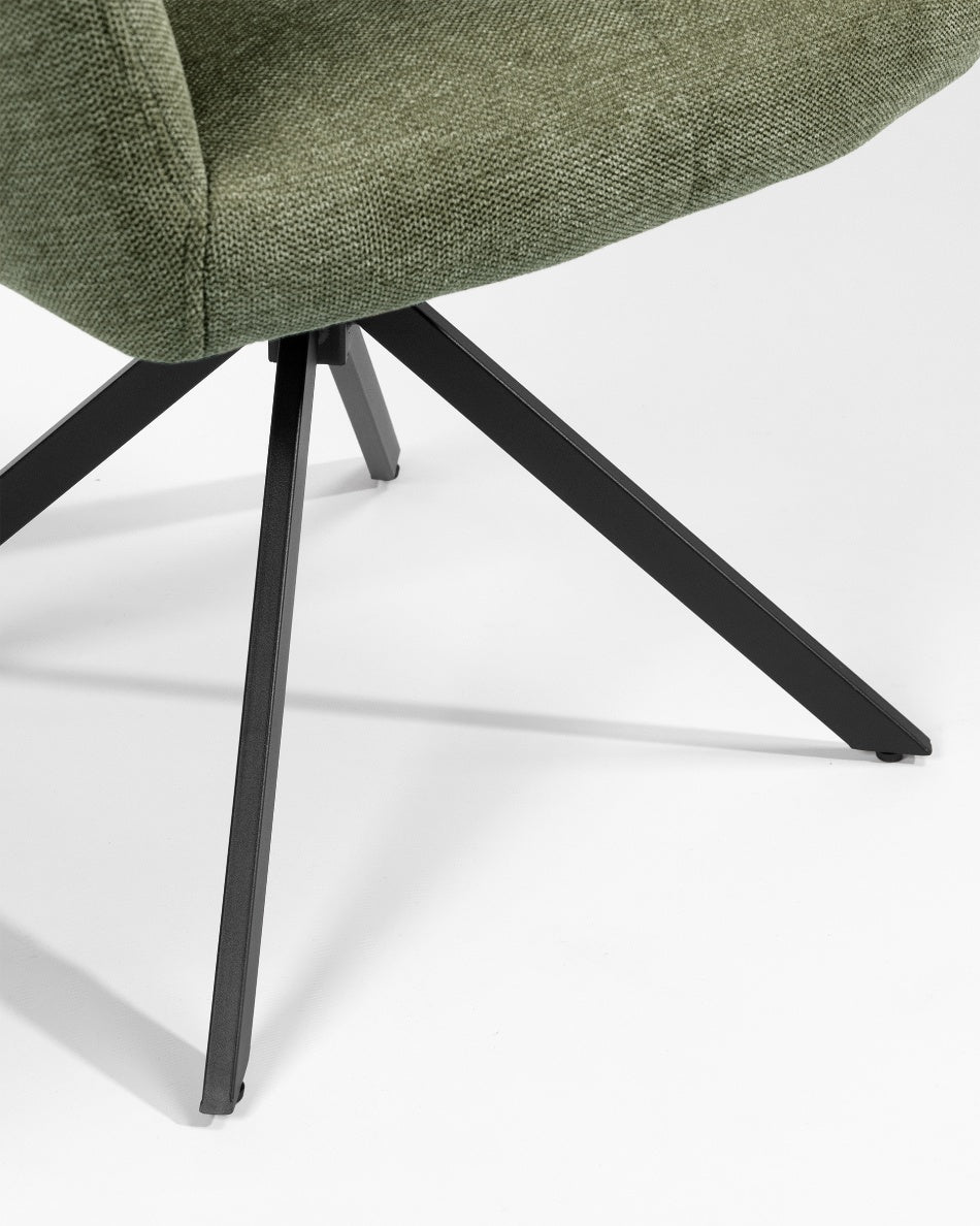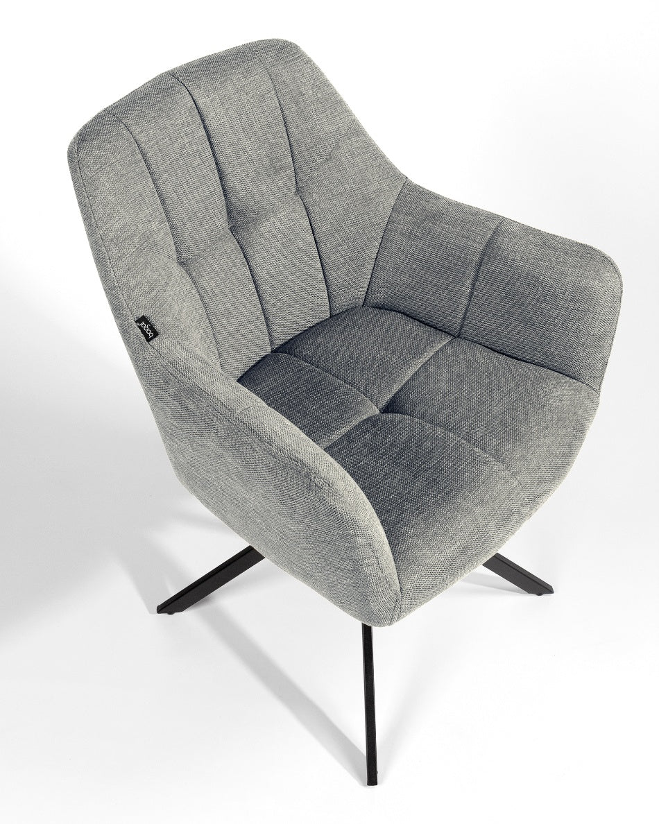 El asiento y el respaldo tapizados ofrecen una sentada confortable para el uso diario, mientras que la base metálica con sistema giratorio de retorno 180° facilita el movimiento y ayuda a mantener el orden visual alrededor de la mesa. Un diseño equilibrado que une funcionalidad y estilo, ideal tanto para el hogar como para proyectos contract.