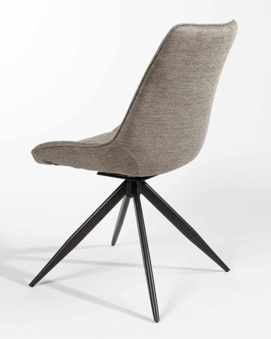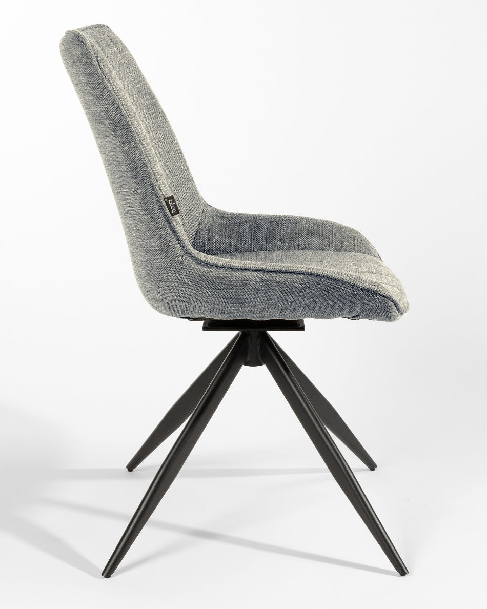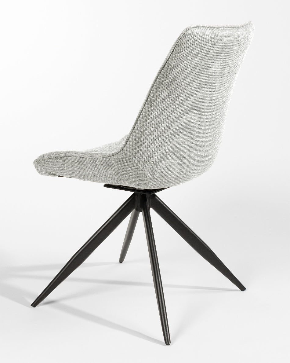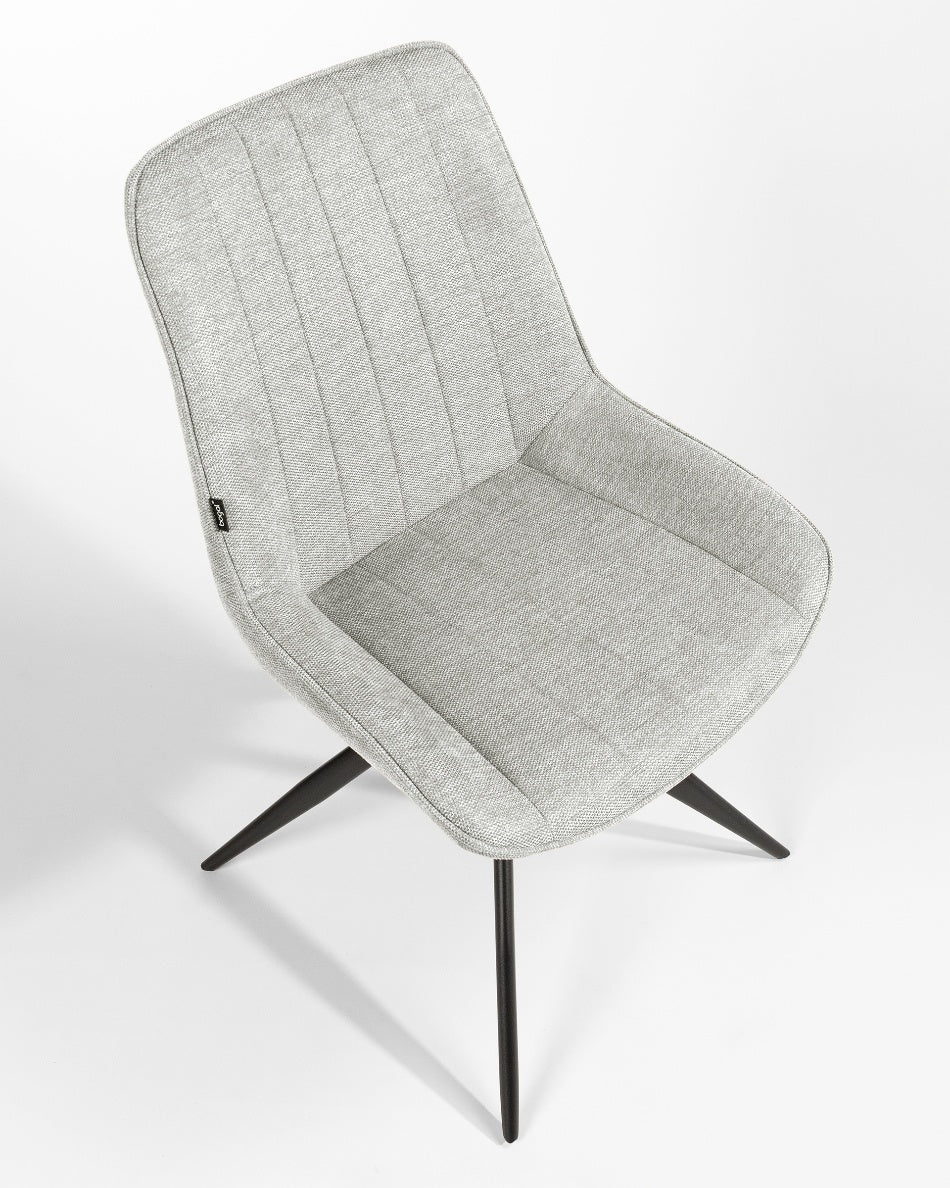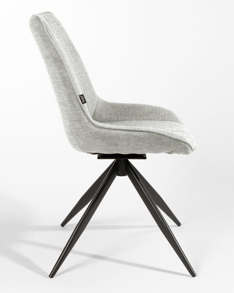 El asiento y el respaldo tapizados ofrecen una sentada confortable para el uso diario, mientras que la base metálica con sistema giratorio de retorno 180° facilita el movimiento y ayuda a que la silla vuelva a su posición original, manteniendo el conjunto ordenado alrededor de la mesa. Una opción práctica y estética, adecuada tanto para el hogar como para espacios contract.