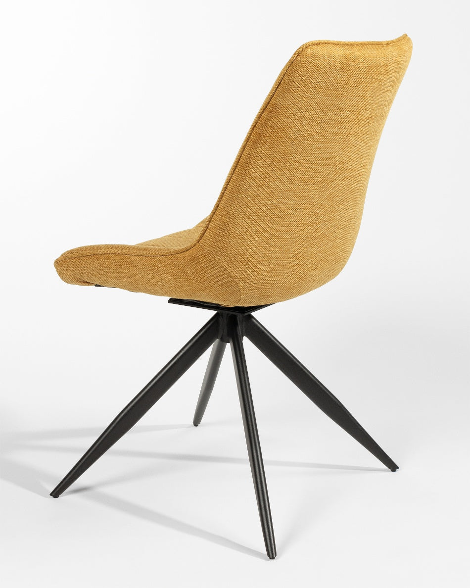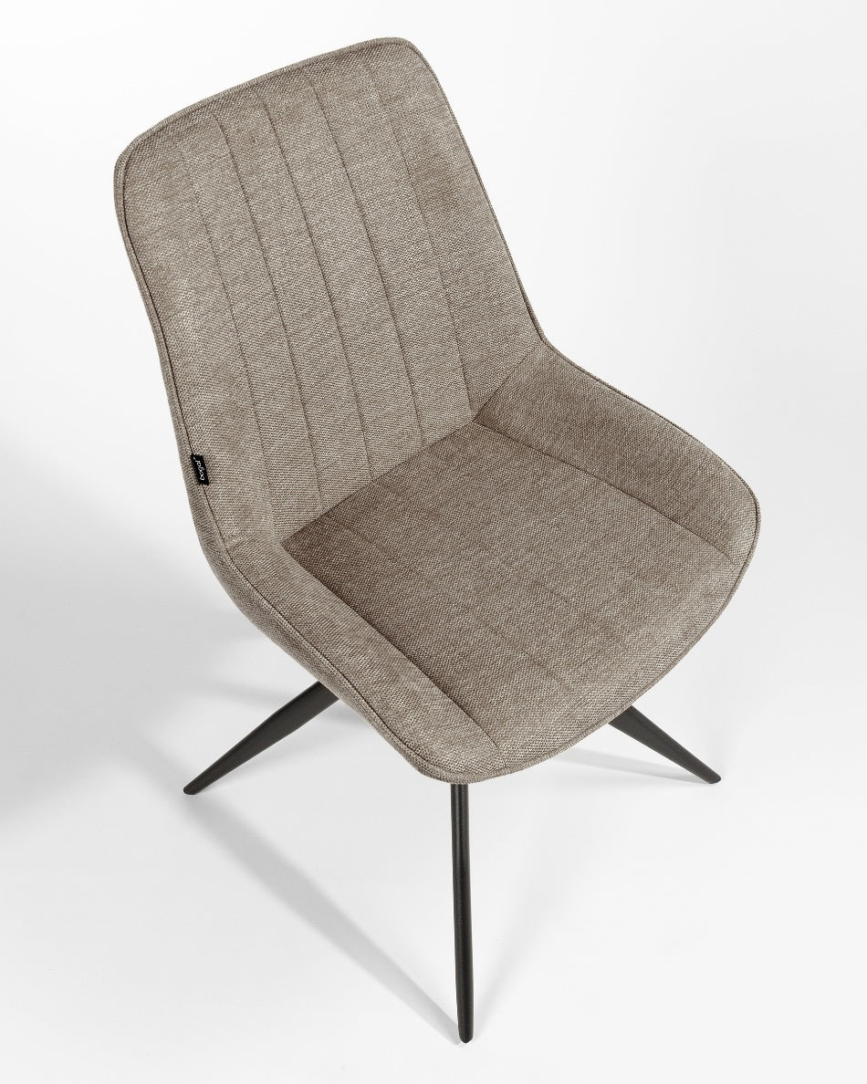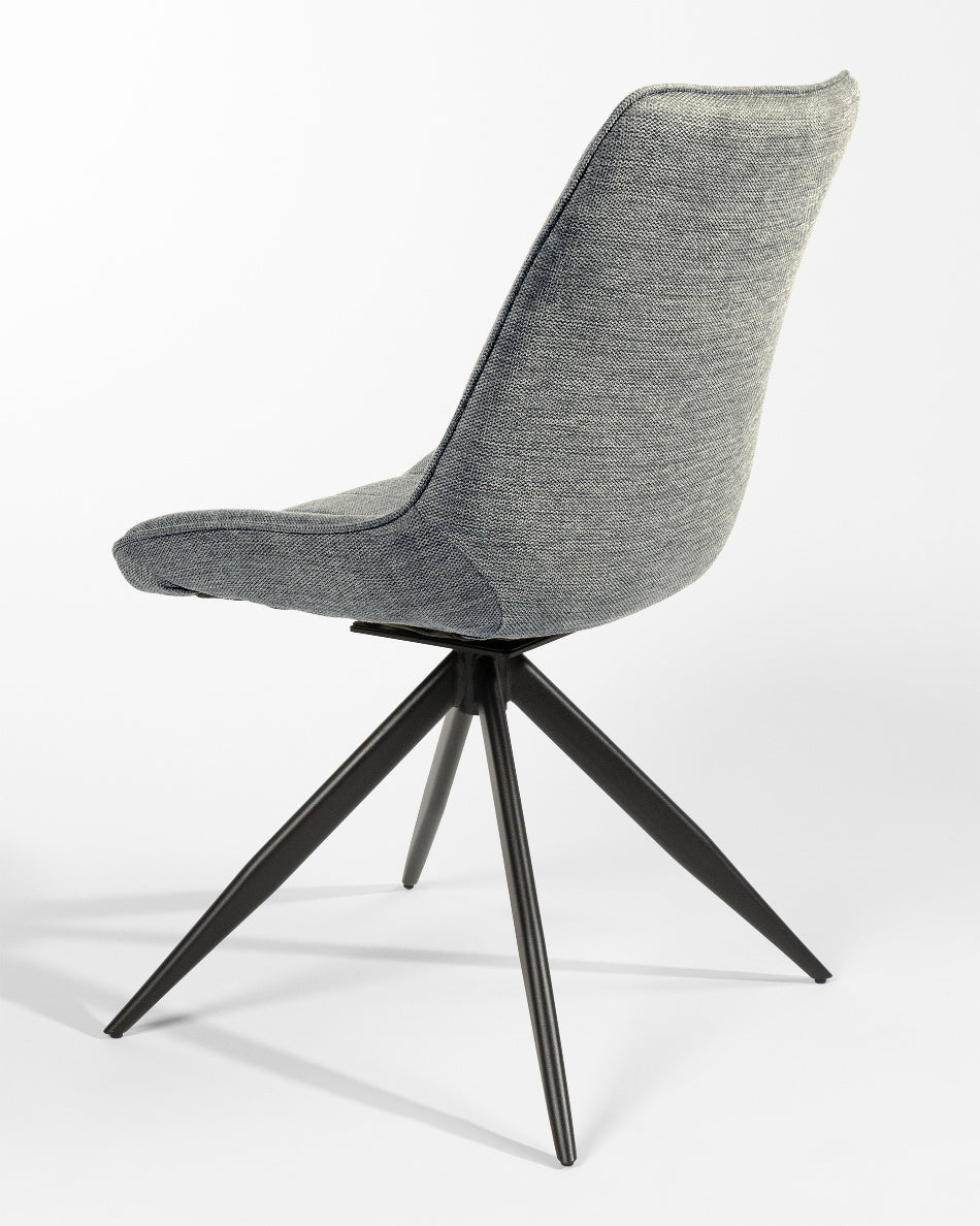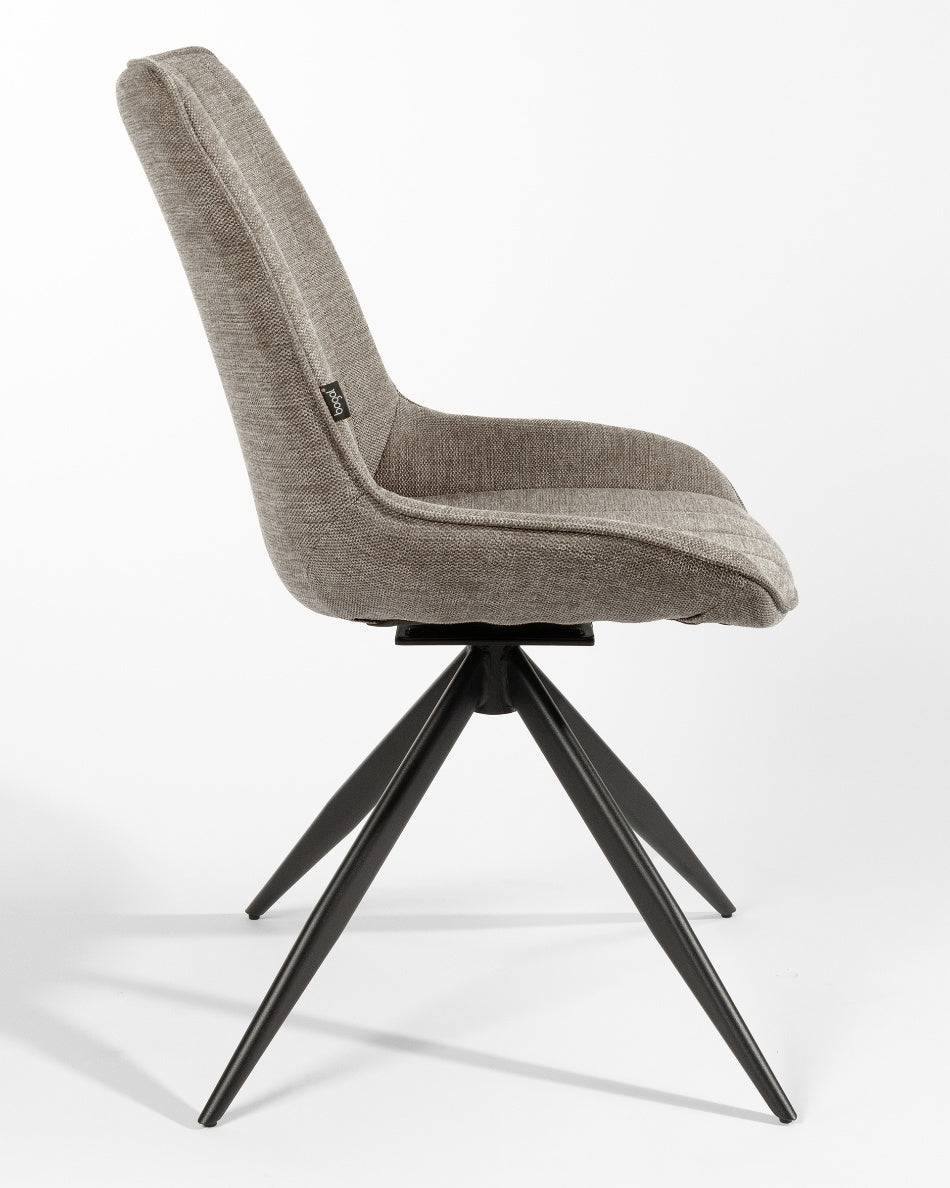 El asiento y el respaldo tapizados ofrecen una sentada confortable para el uso diario, mientras que la base metálica con sistema giratorio de retorno 180° facilita el movimiento y ayuda a que la silla vuelva a su posición original, manteniendo el conjunto ordenado alrededor de la mesa. Una opción práctica y estética, adecuada tanto para el hogar como para espacios contract.