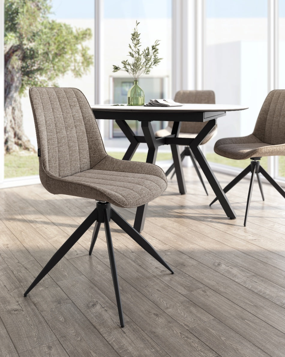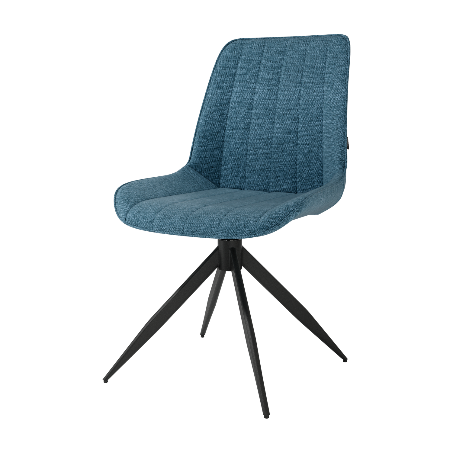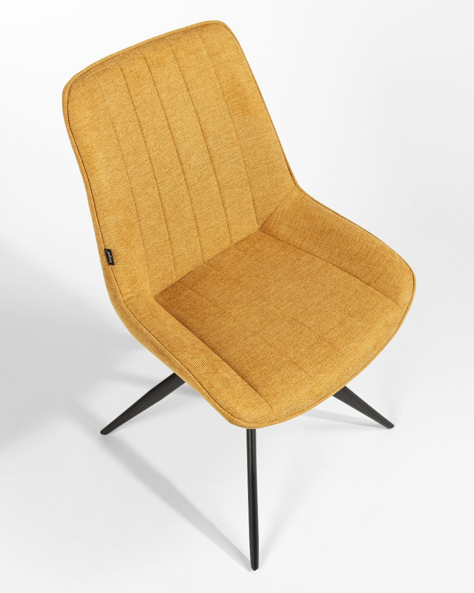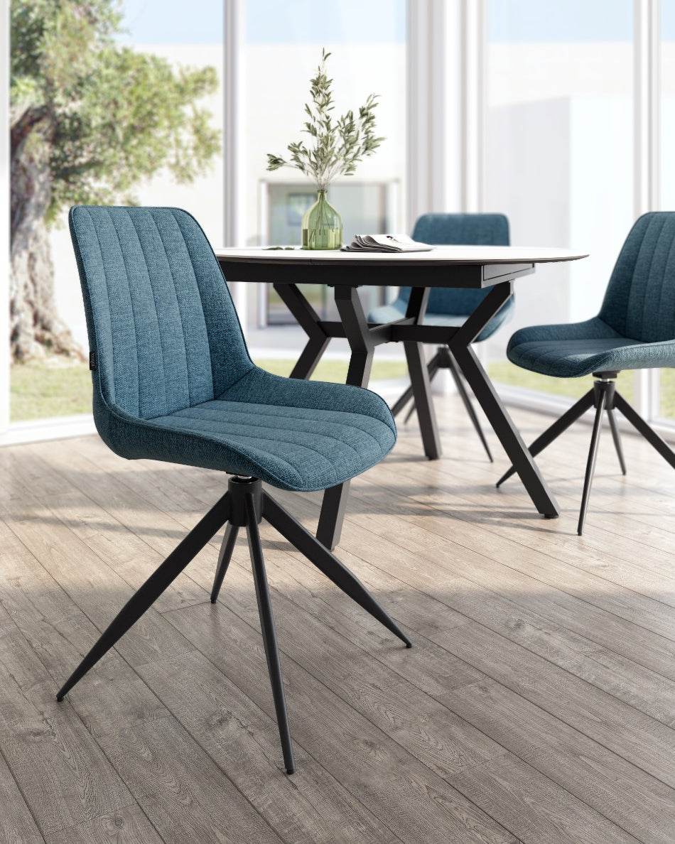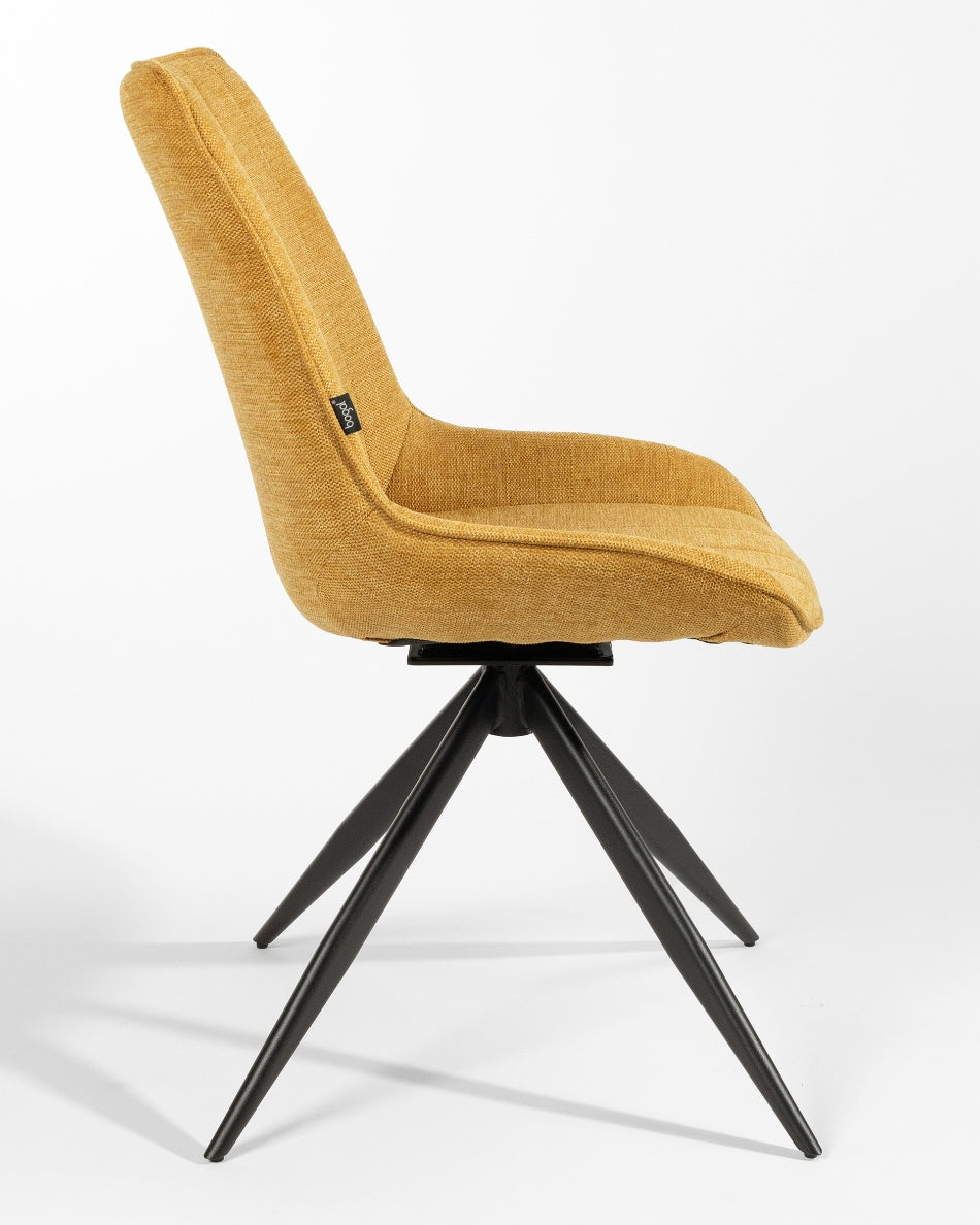 El asiento y el respaldo tapizados ofrecen una sentada confortable para el uso diario, mientras que la base metálica con sistema giratorio de retorno 180° facilita el movimiento y ayuda a que la silla vuelva a su posición original, manteniendo el conjunto ordenado alrededor de la mesa. Una opción práctica y estética, adecuada tanto para el hogar como para espacios contract.