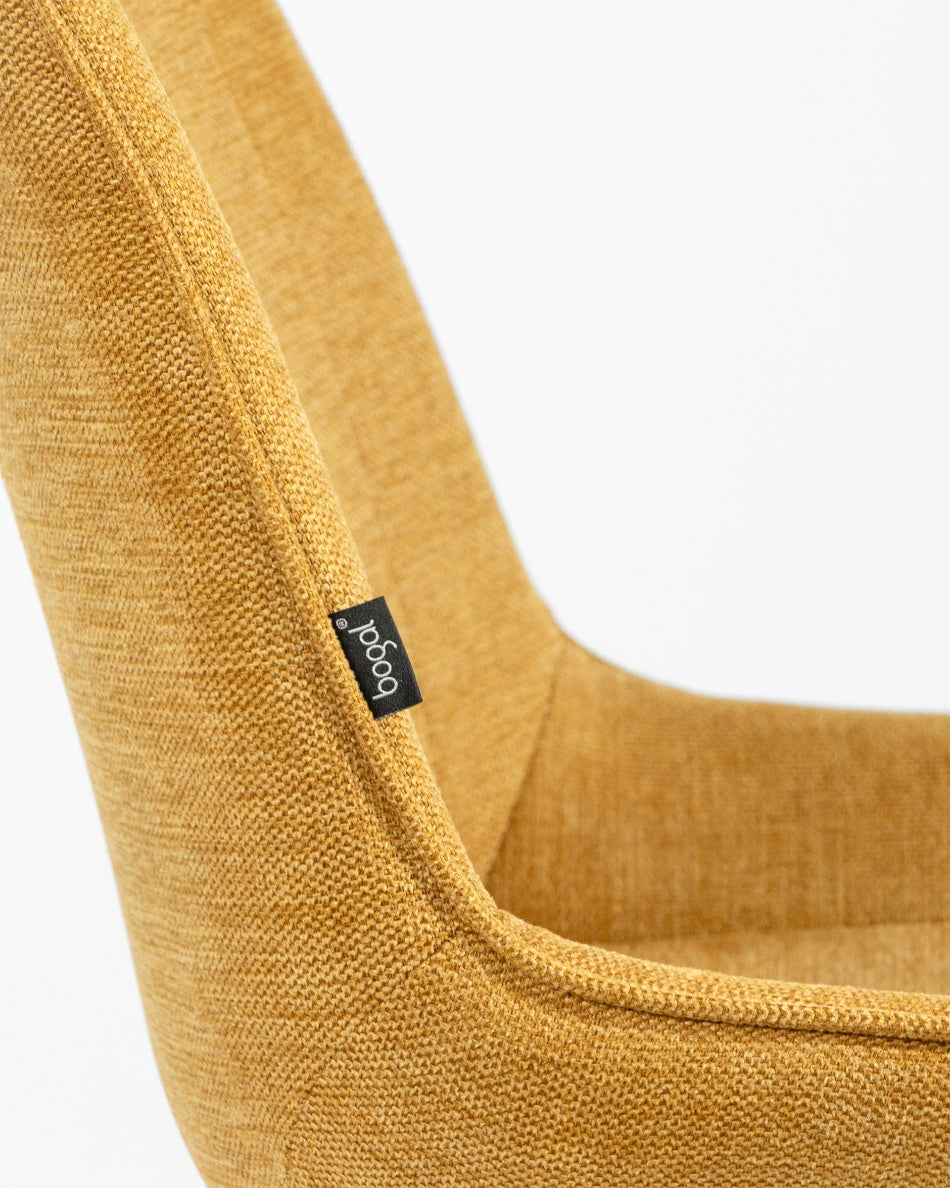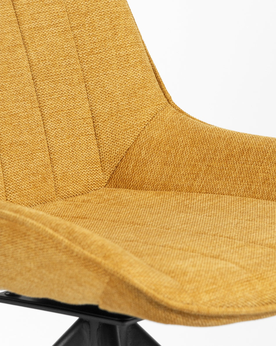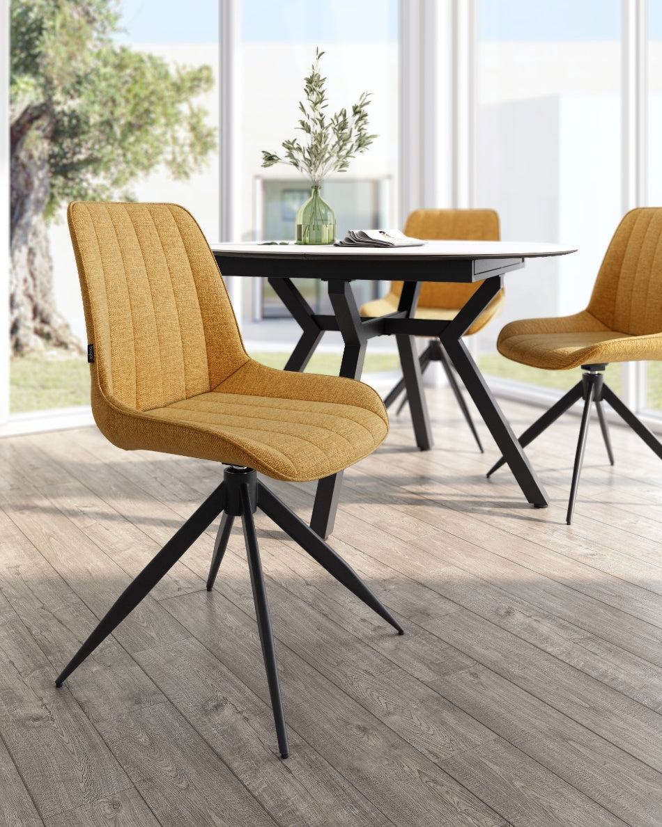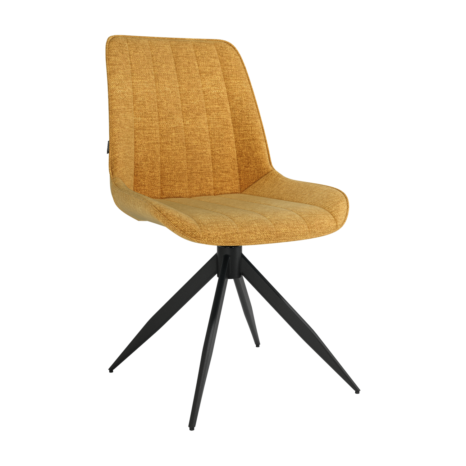 El asiento y el respaldo tapizados ofrecen una sentada confortable para el uso diario, mientras que la base metálica con sistema giratorio de retorno 180° facilita el movimiento y ayuda a que la silla vuelva a su posición original, manteniendo el conjunto ordenado alrededor de la mesa. Una opción práctica y estética, adecuada tanto para el hogar como para espacios contract.