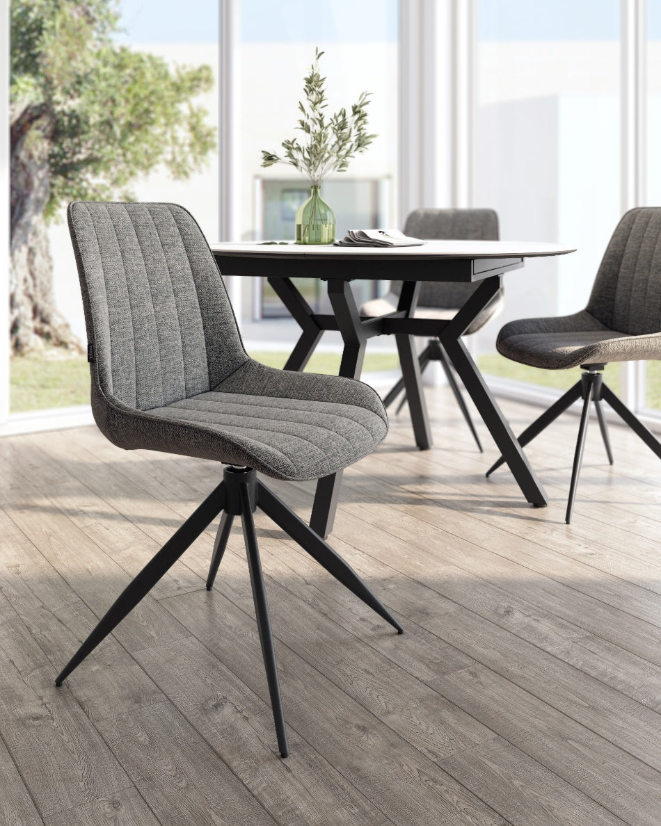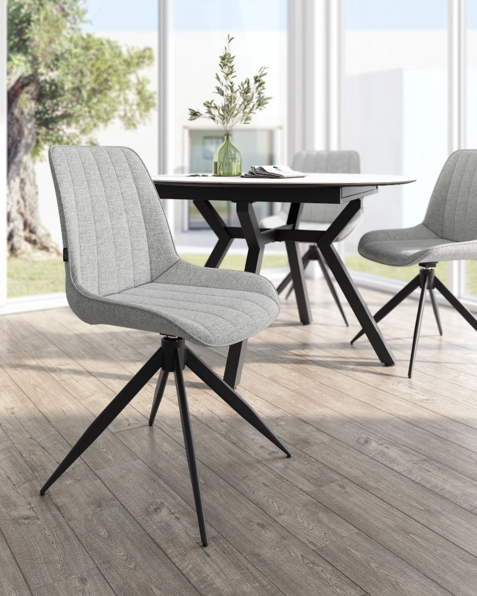 La silla giratoria Bursa presenta un diseño elegante y actual, pensada para aportar comodidad y un aire sofisticado a comedores y zonas de reunión. Sus líneas suaves y su respaldo ligeramente curvado crean una silueta equilibrada que encaja con facilidad en interiores contemporáneos y ambientes luminosos.
