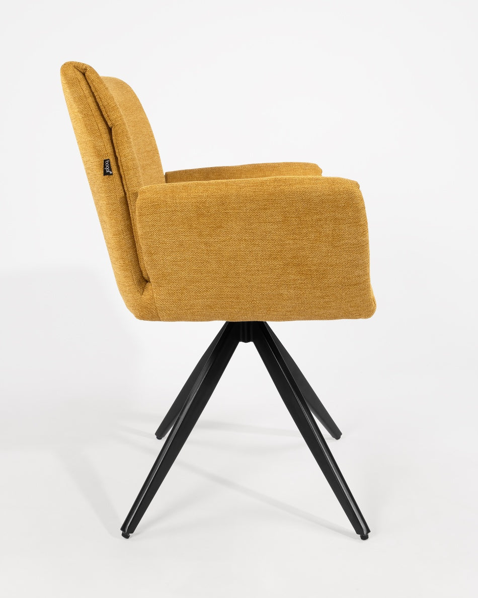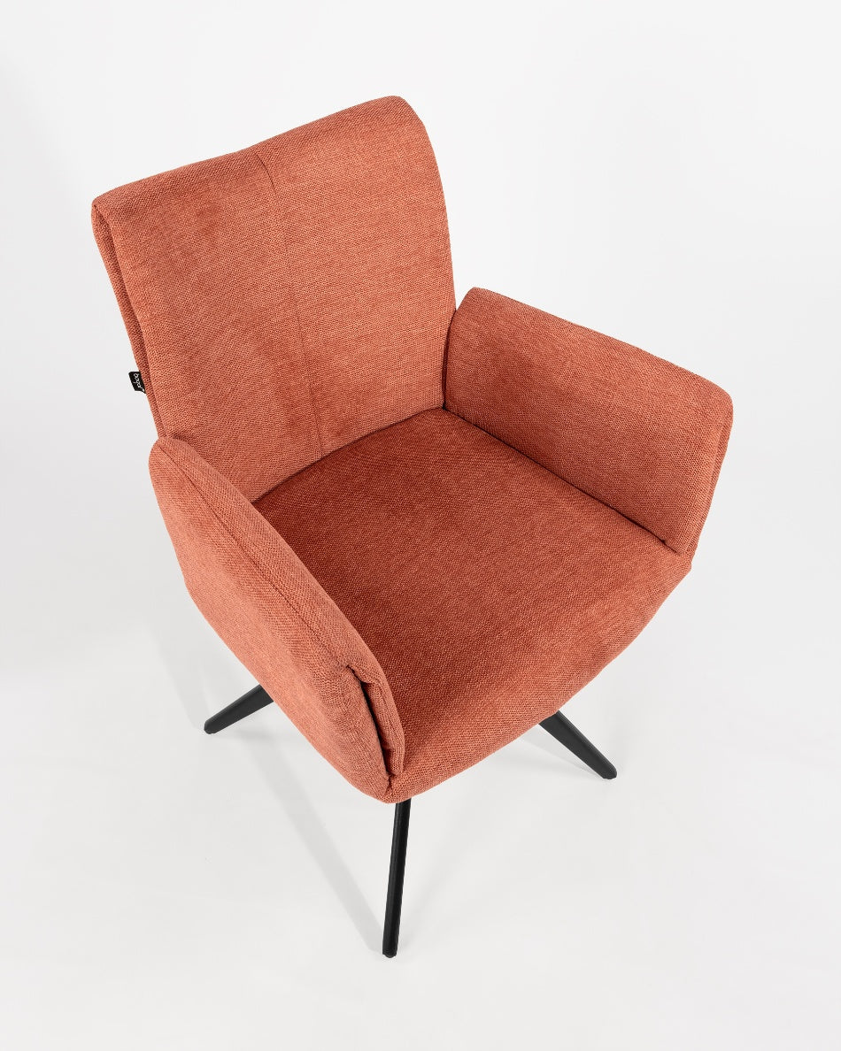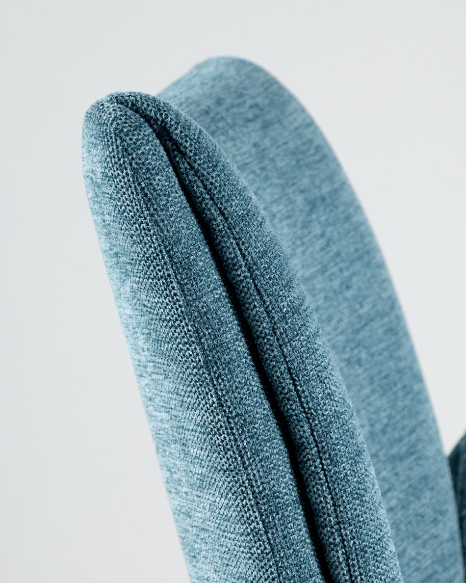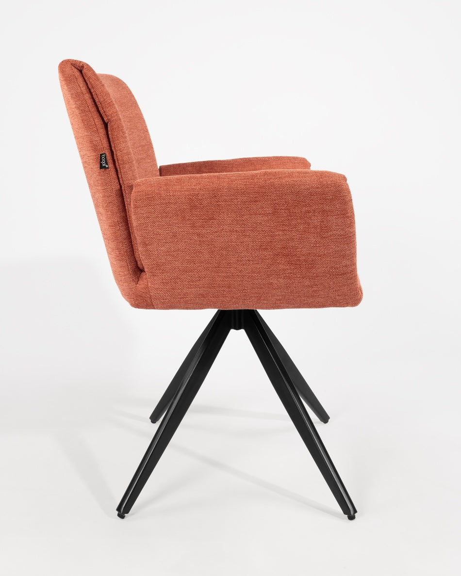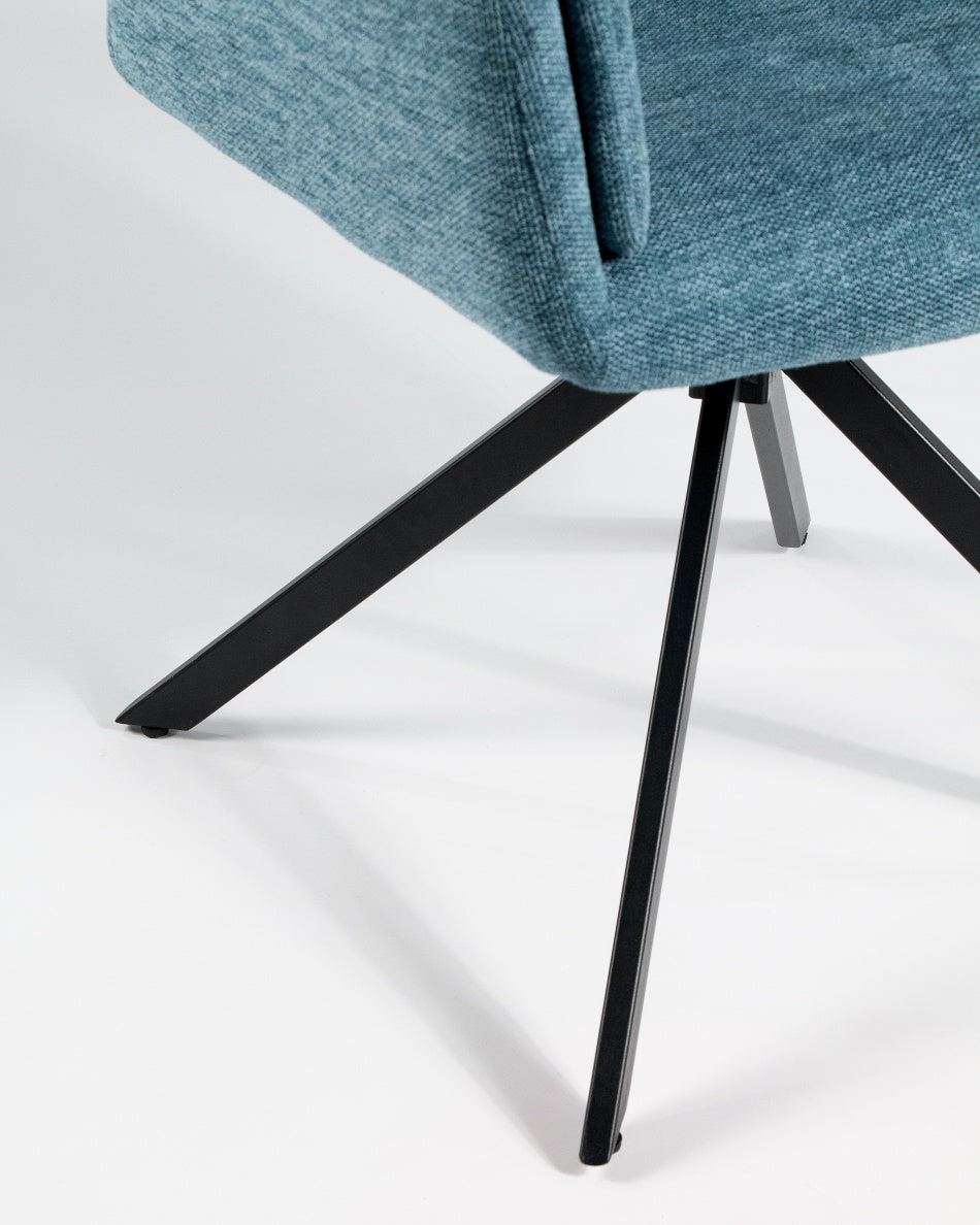 El asiento y el respaldo tapizados ofrecen una sentada cómoda y agradable, mientras que la base metálica con sistema giratorio de retorno 180° permite libertad de movimiento y hace que la silla vuelva de forma automática a su posición original. Un diseño funcional y bien proporcionado, ideal tanto para el hogar como para proyectos contract.