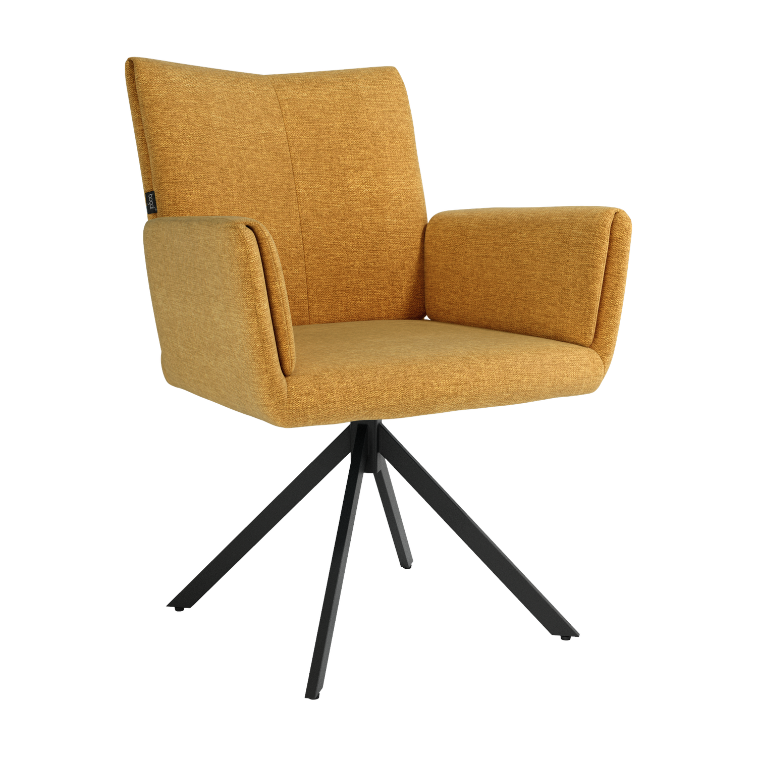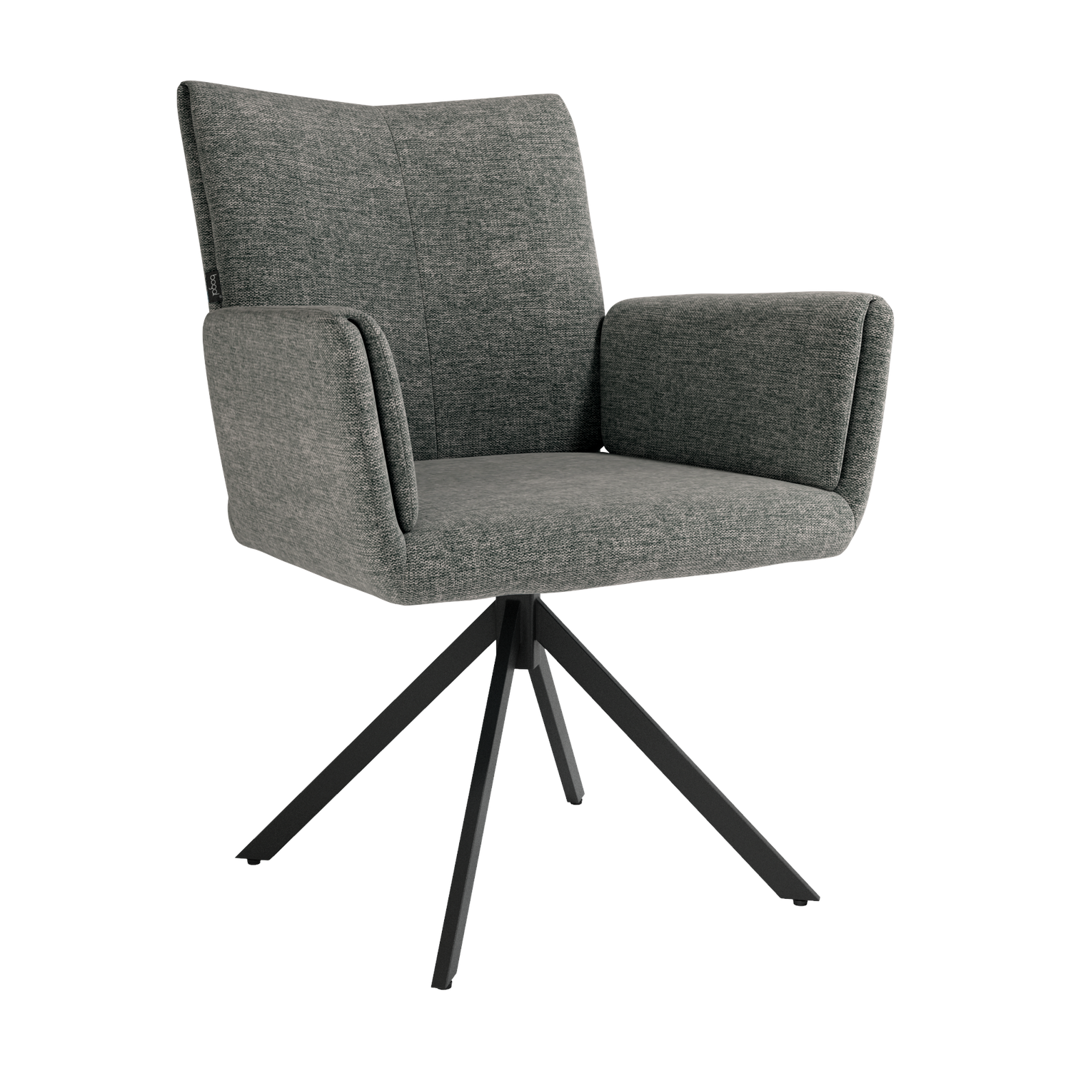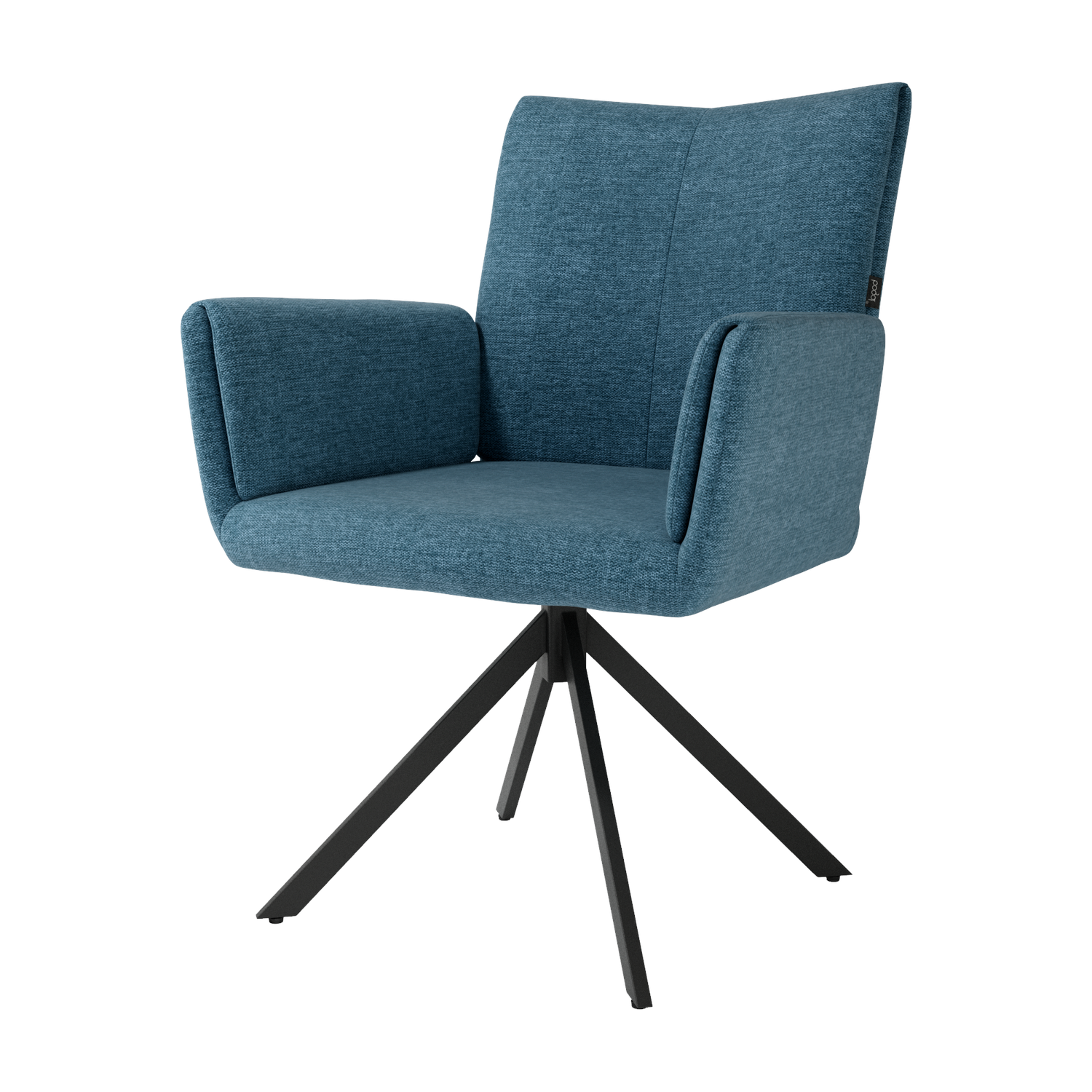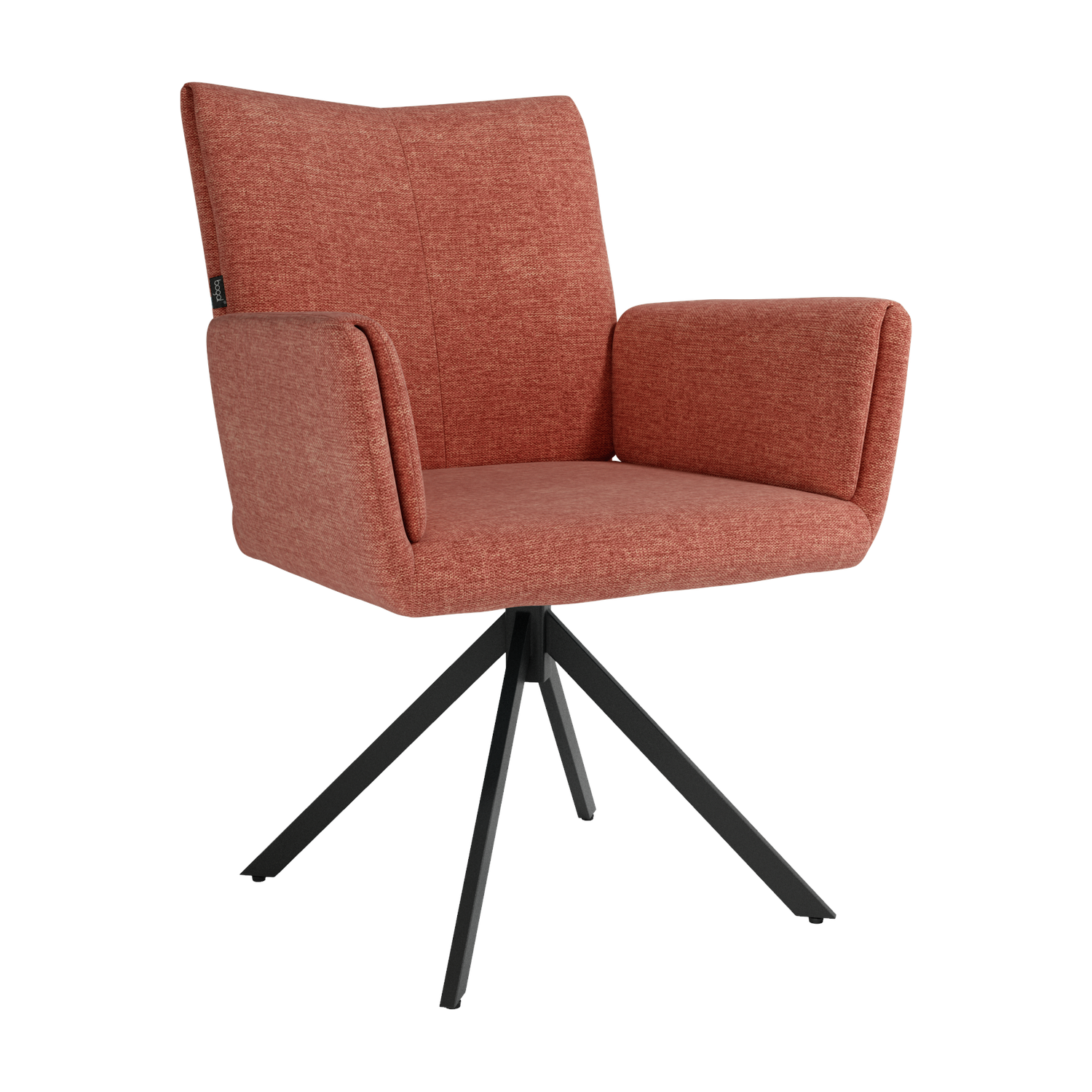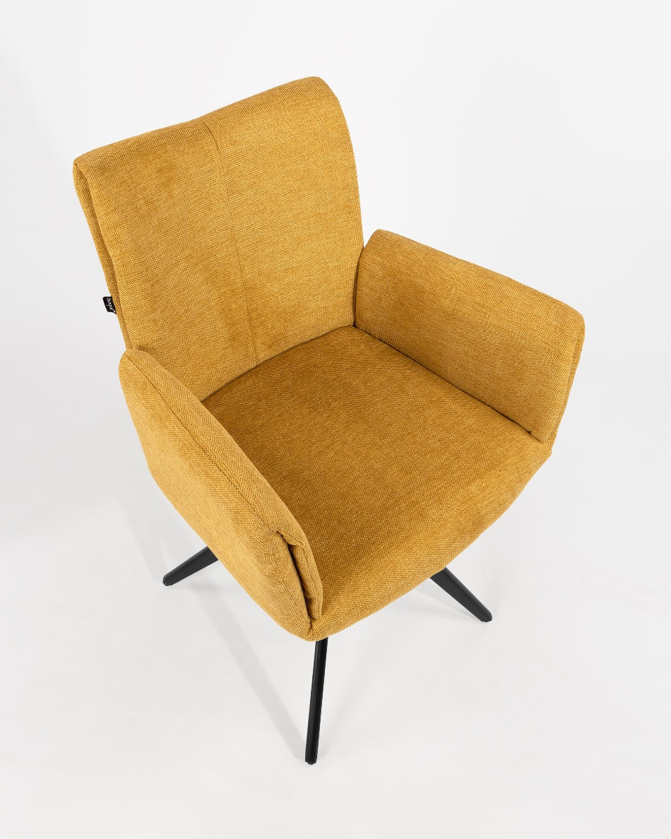 El asiento y el respaldo tapizados ofrecen una sentada cómoda y agradable, mientras que la base metálica con sistema giratorio de retorno 180° permite libertad de movimiento y hace que la silla vuelva de forma automática a su posición original. Un diseño funcional y bien proporcionado, ideal tanto para el hogar como para proyectos contract.
