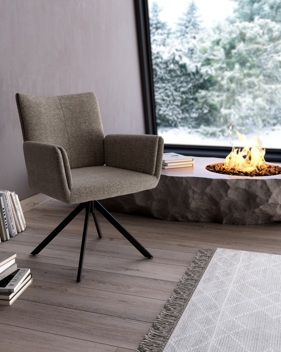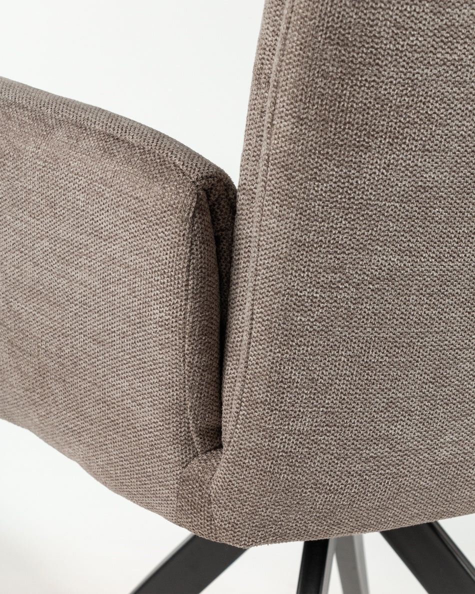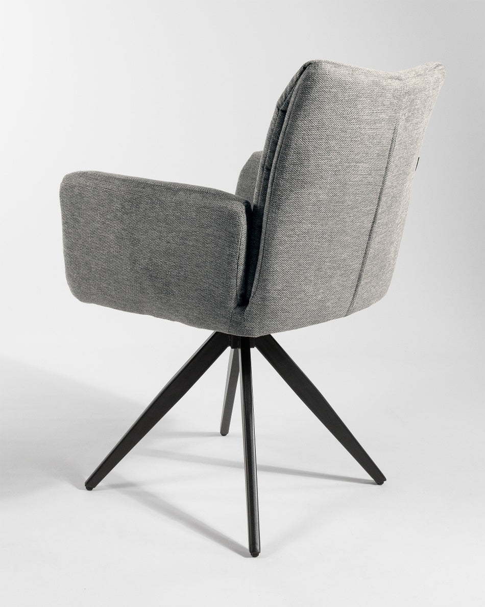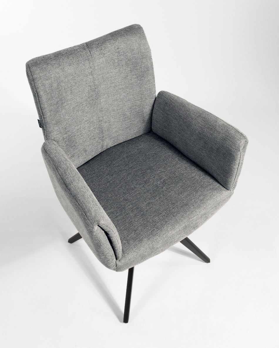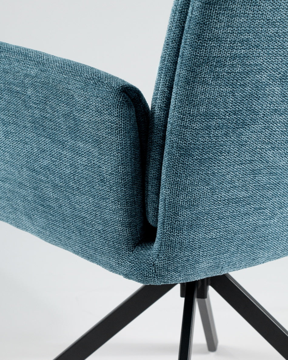 La silla giratoria Módena destaca por su diseño envolvente y acogedor, pensada para aportar confort y un carácter elegante a comedores y espacios de estar. Su respaldo alto y ligeramente curvado, junto con los brazos integrados, crea una silueta equilibrada que invita a sentarse y disfrutar de largas sobremesas.