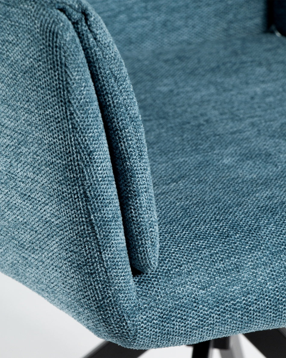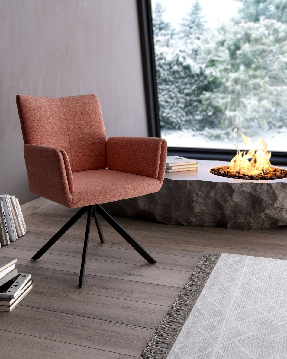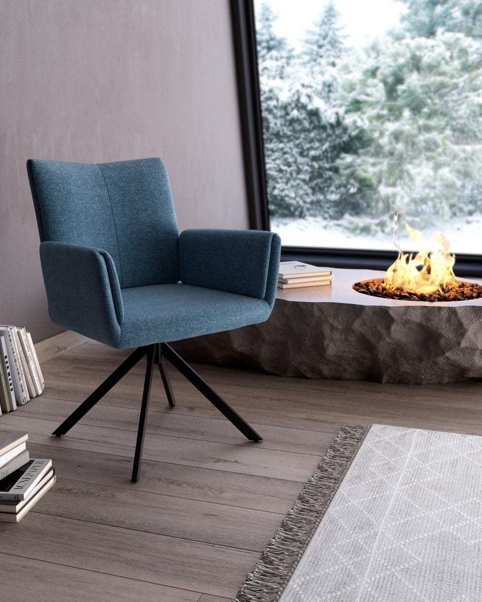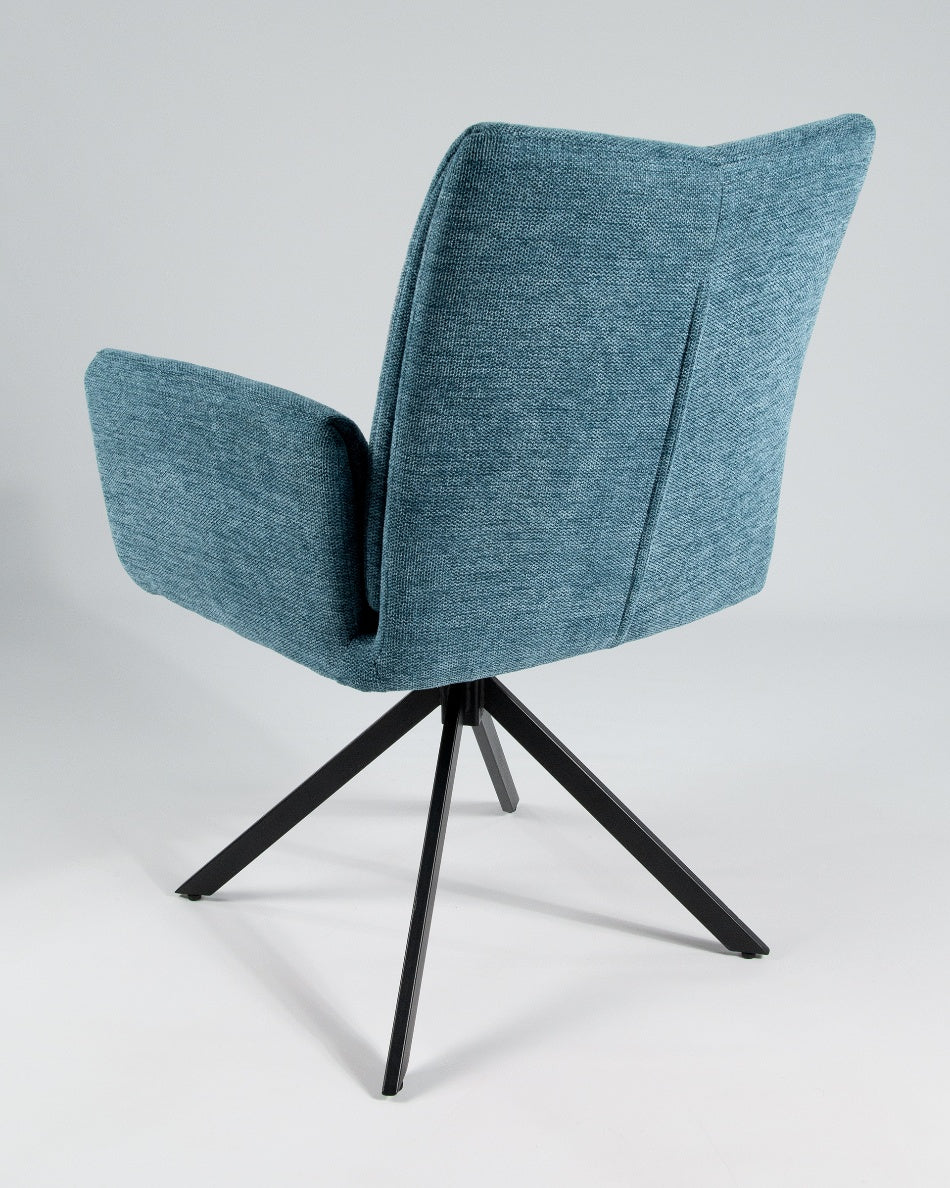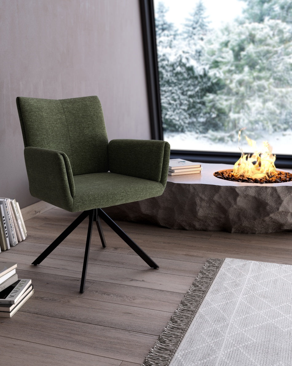 La silla giratoria Módena destaca por su diseño envolvente y acogedor, pensada para aportar confort y un carácter elegante a comedores y espacios de estar. Su respaldo alto y ligeramente curvado, junto con los brazos integrados, crea una silueta equilibrada que invita a sentarse y disfrutar de largas sobremesas.