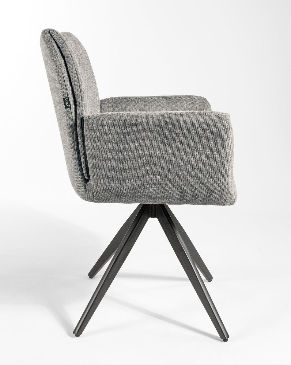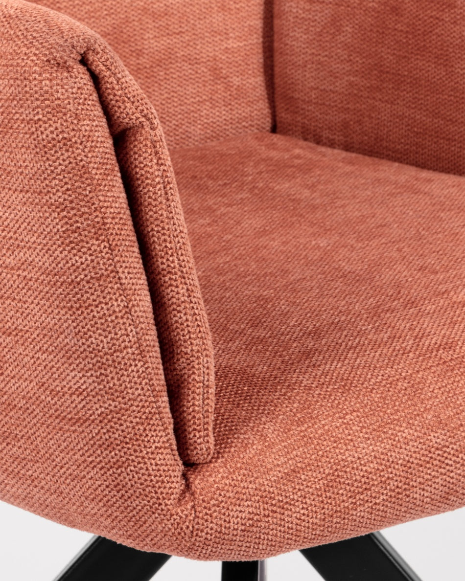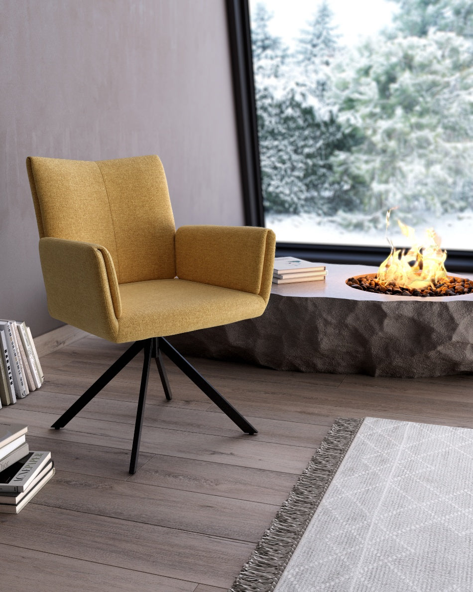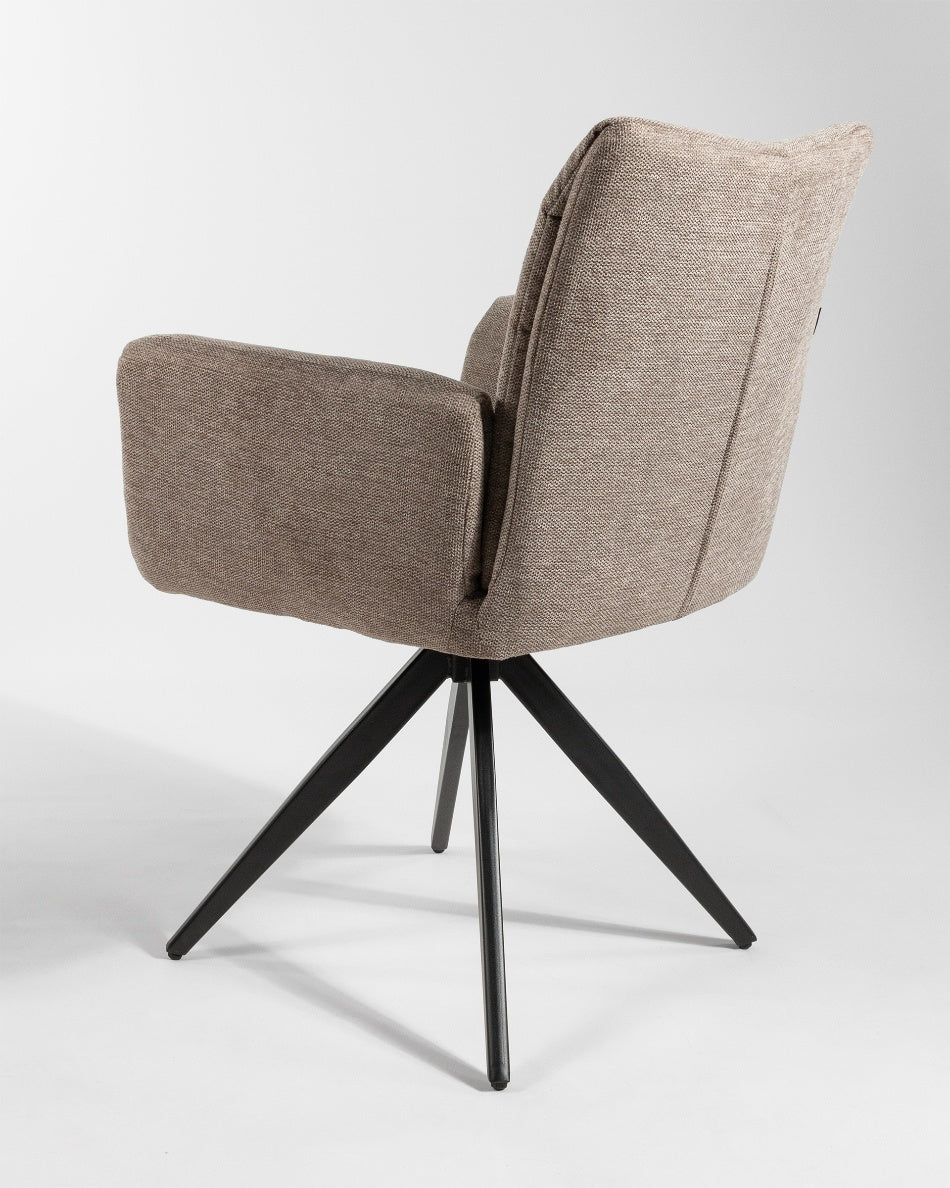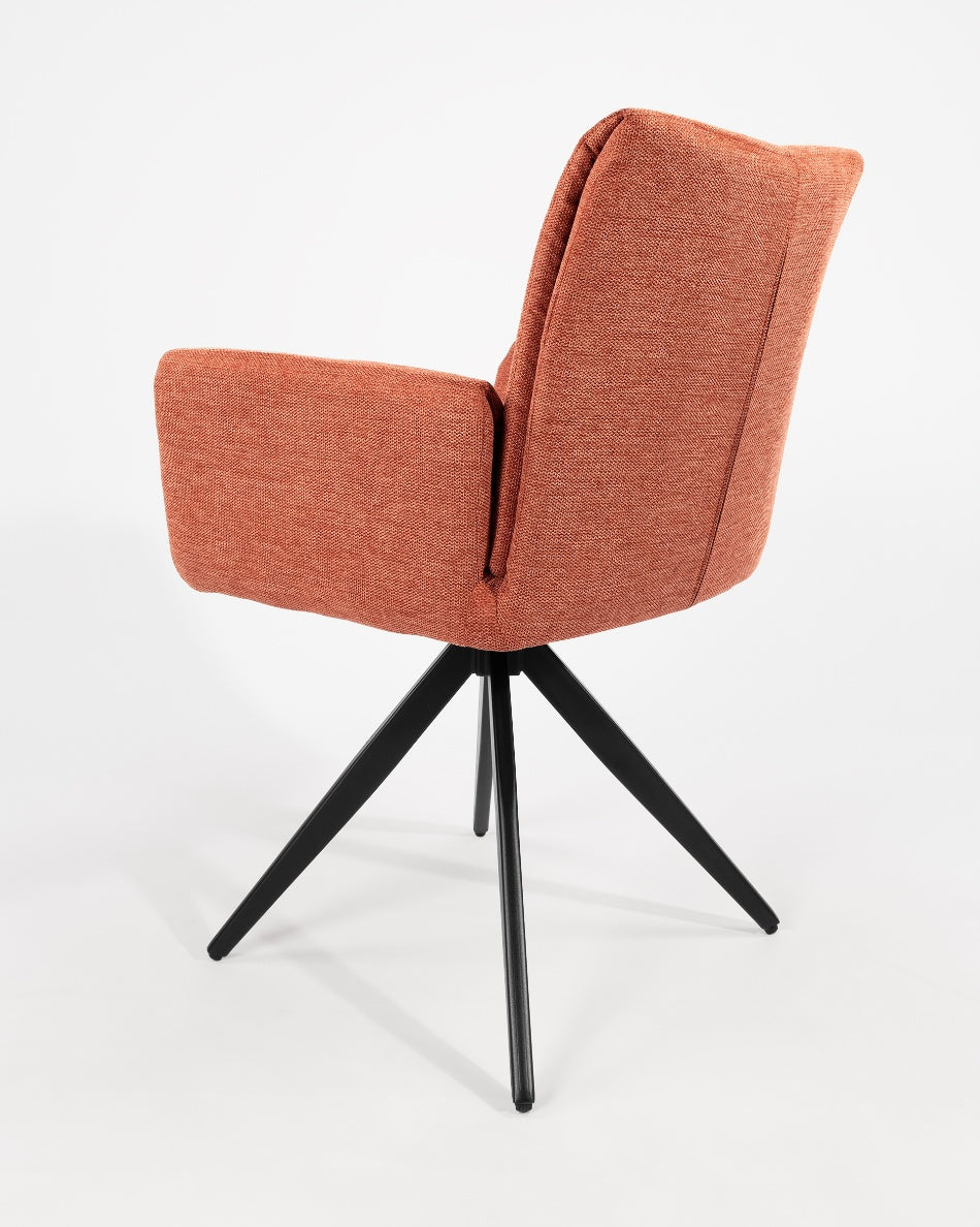 La silla giratoria Módena destaca por su diseño envolvente y acogedor, pensada para aportar confort y un carácter elegante a comedores y espacios de estar. Su respaldo alto y ligeramente curvado, junto con los brazos integrados, crea una silueta equilibrada que invita a sentarse y disfrutar de largas sobremesas.