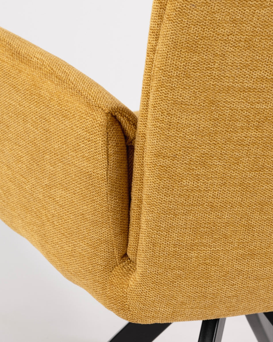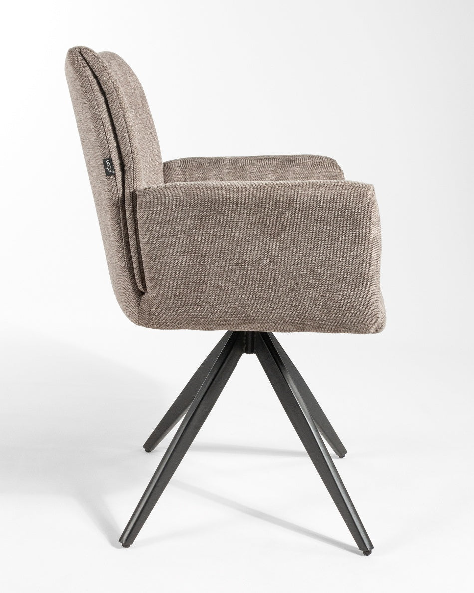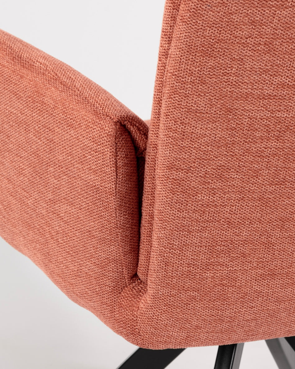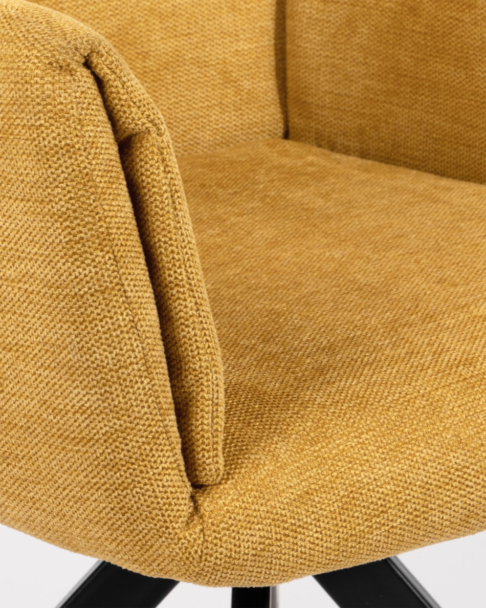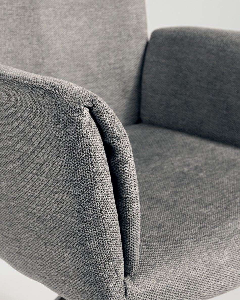 La silla giratoria Módena destaca por su diseño envolvente y acogedor, pensada para aportar confort y un carácter elegante a comedores y espacios de estar. Su respaldo alto y ligeramente curvado, junto con los brazos integrados, crea una silueta equilibrada que invita a sentarse y disfrutar de largas sobremesas.