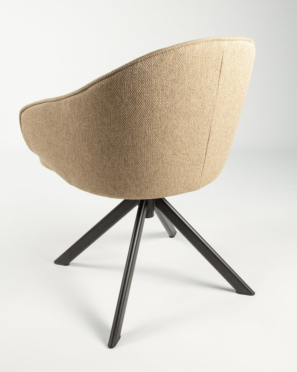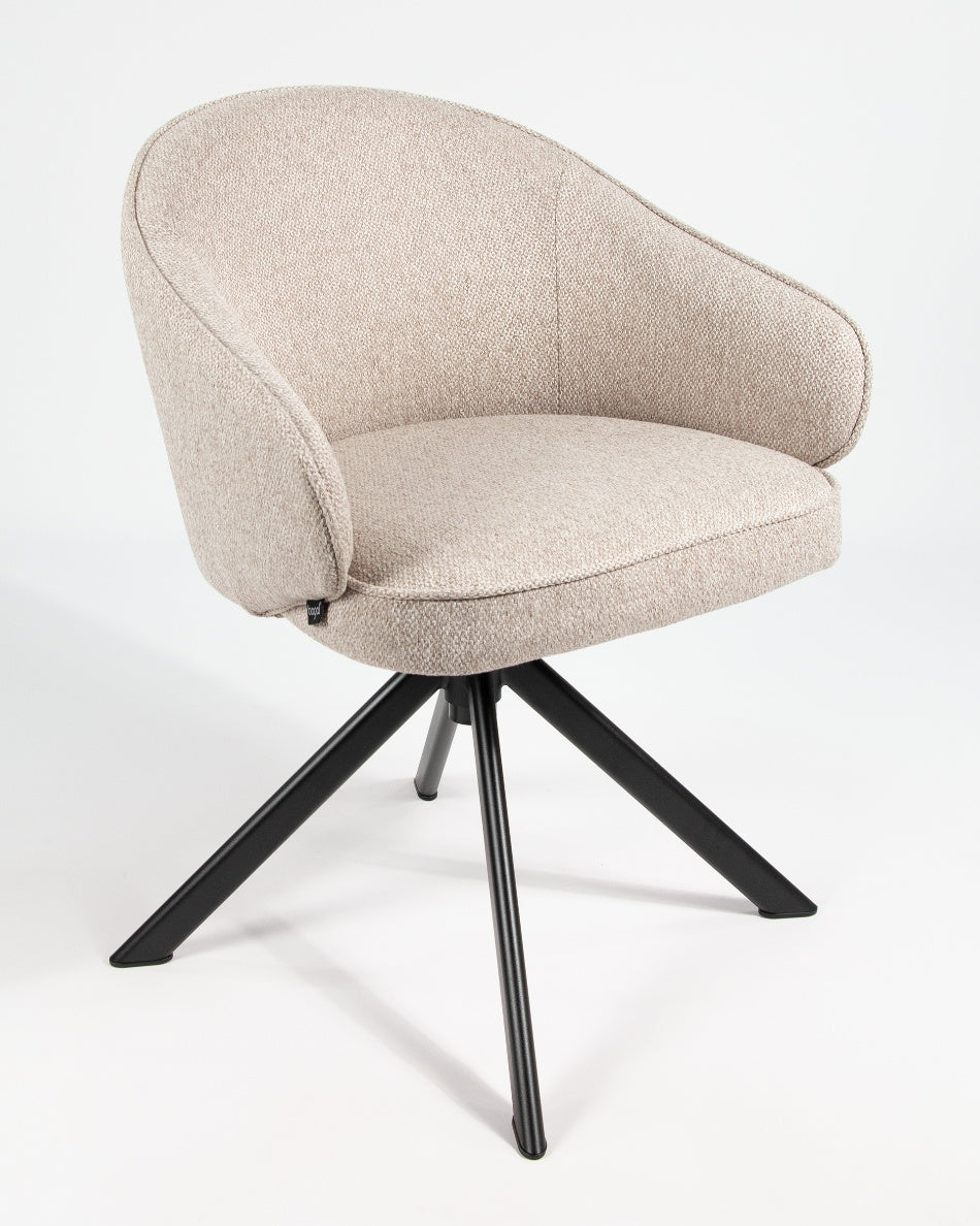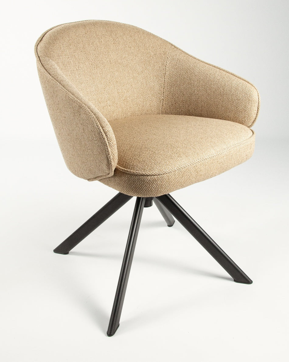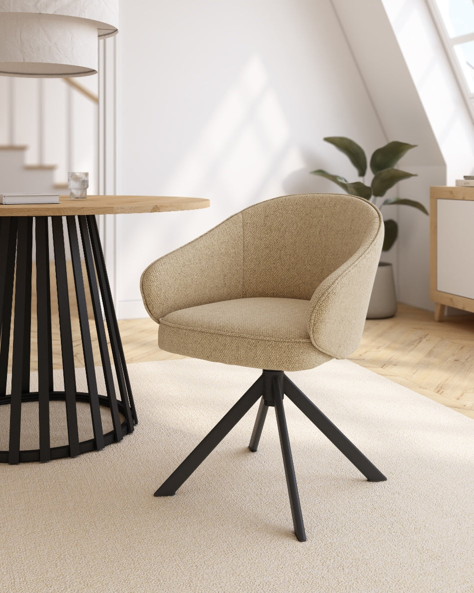 El asiento y el respaldo tapizados garantizan confort en el uso diario, mientras que la base metálica negra con sistema giratorio 360° facilita el movimiento y aporta estabilidad. Una silla versátil que combina funcionalidad y diseño, ideal tanto para mesas de comedor como para espacios de trabajo o uso polivalente.