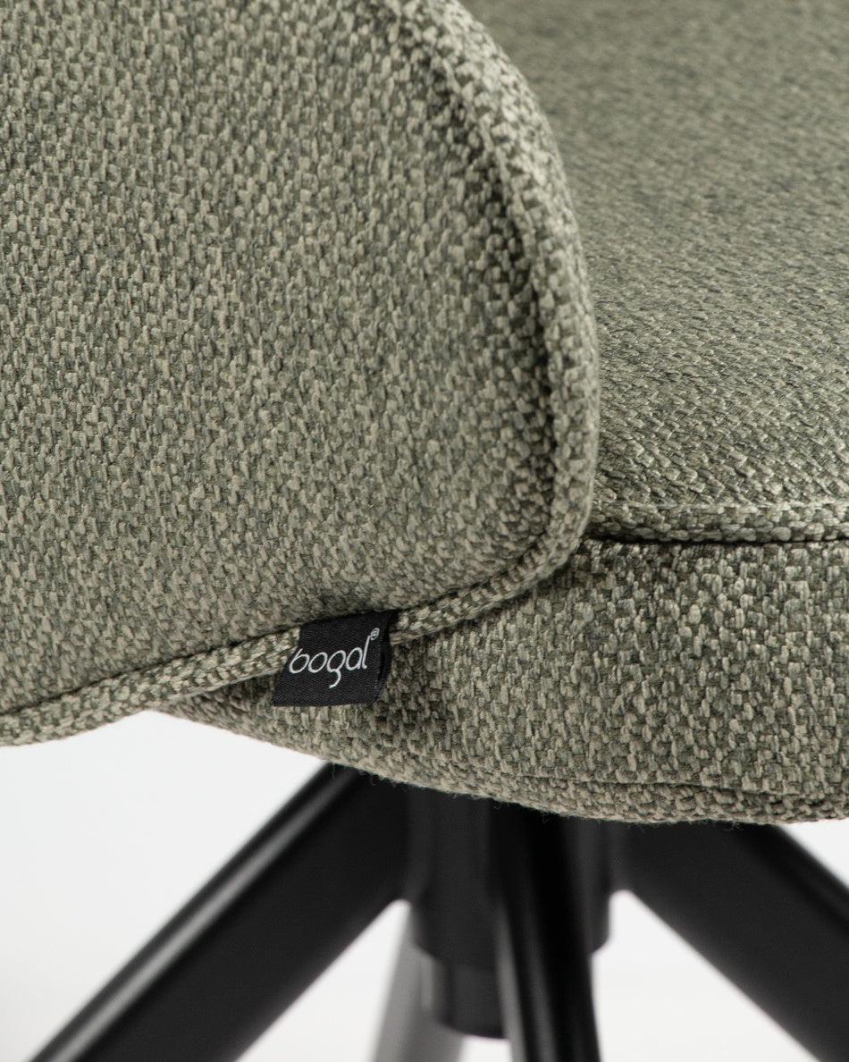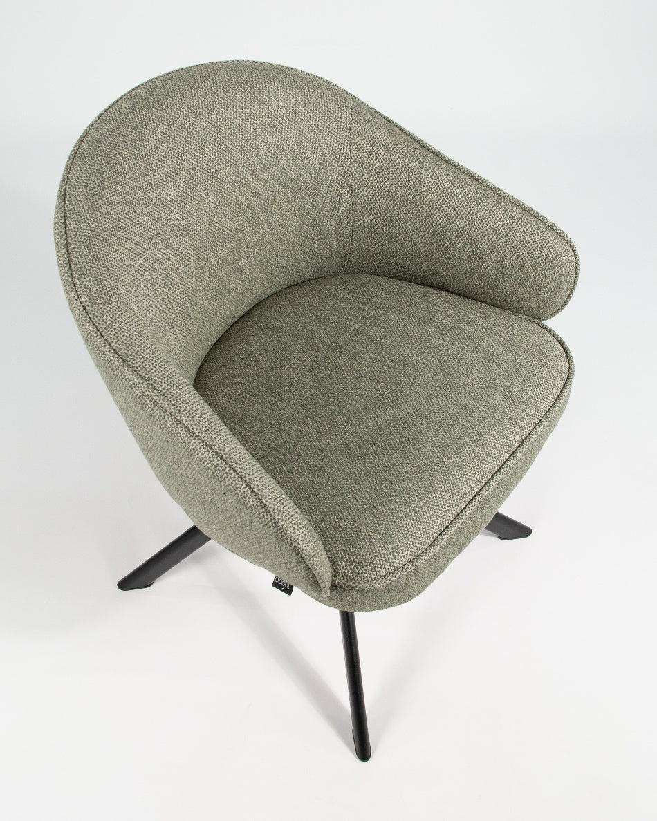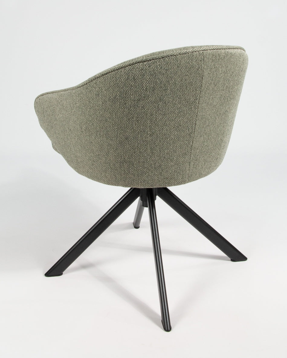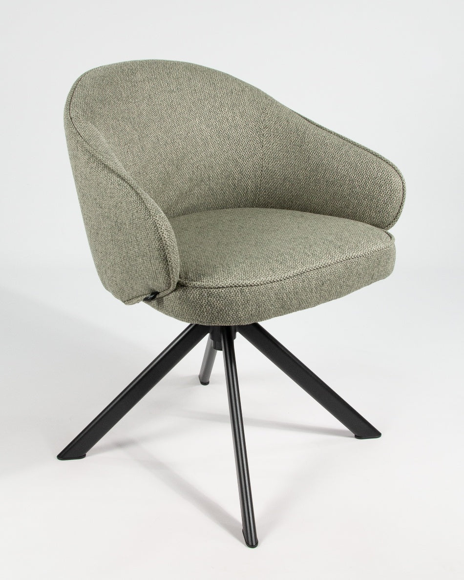 El asiento y el respaldo tapizados garantizan confort en el uso diario, mientras que la base metálica negra con sistema giratorio 360° facilita el movimiento y aporta estabilidad. Una silla versátil que combina funcionalidad y diseño, ideal tanto para mesas de comedor como para espacios de trabajo o uso polivalente.