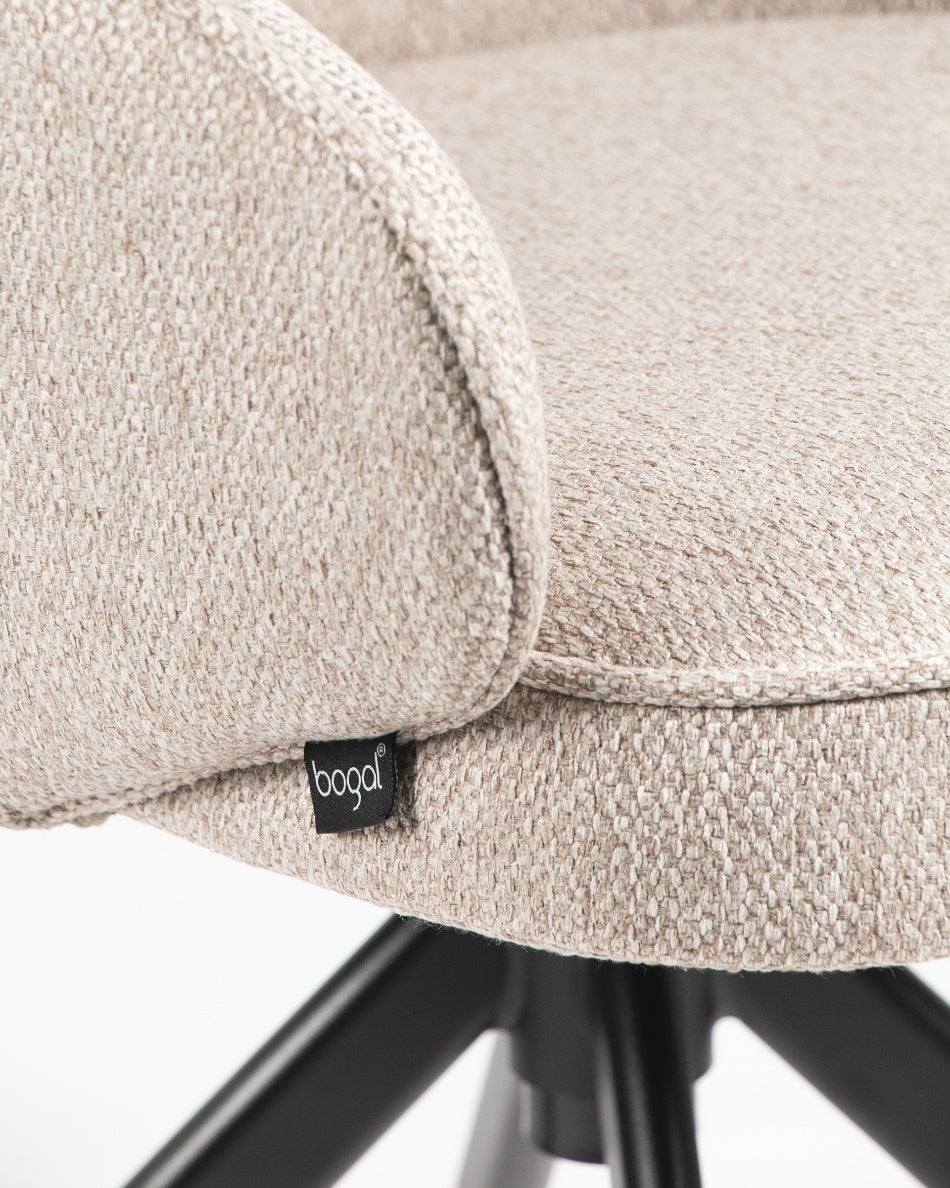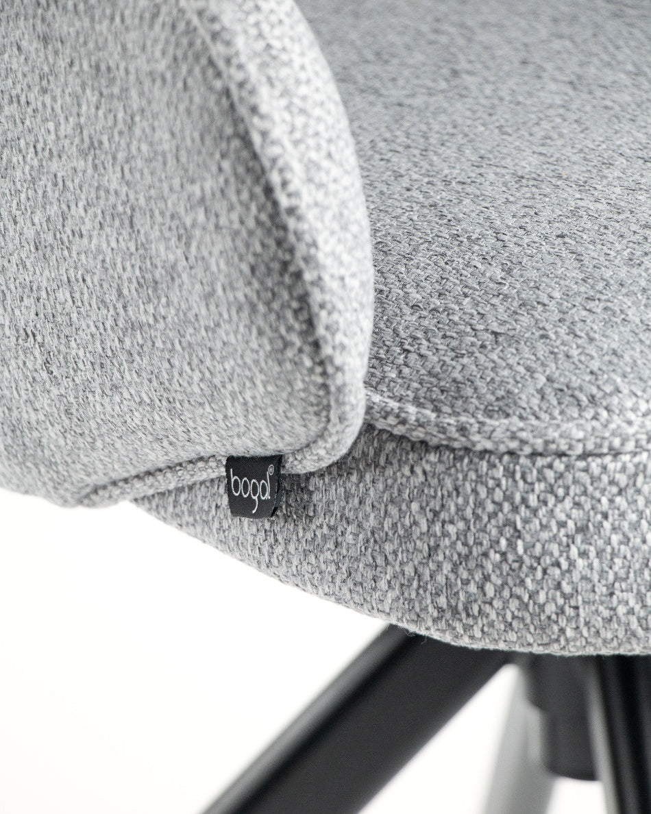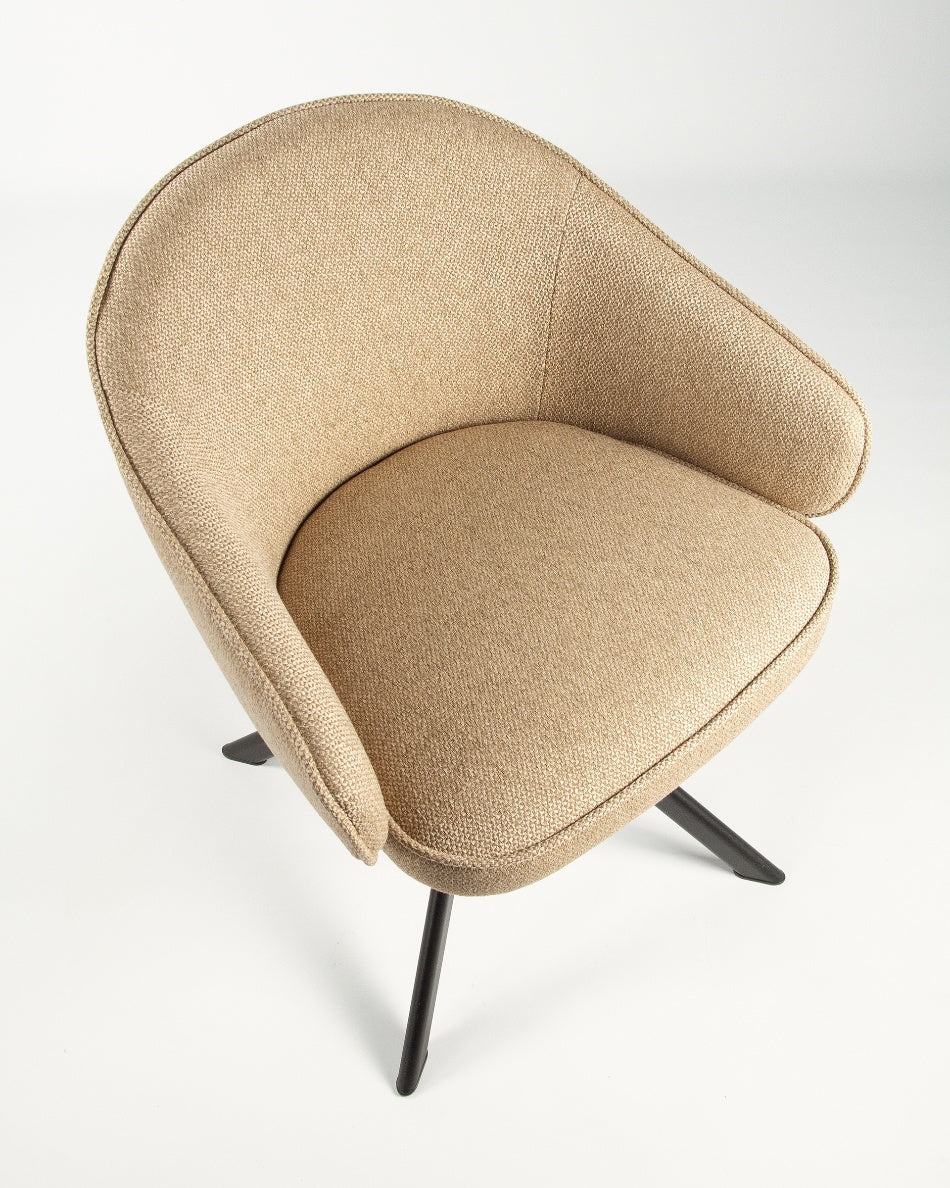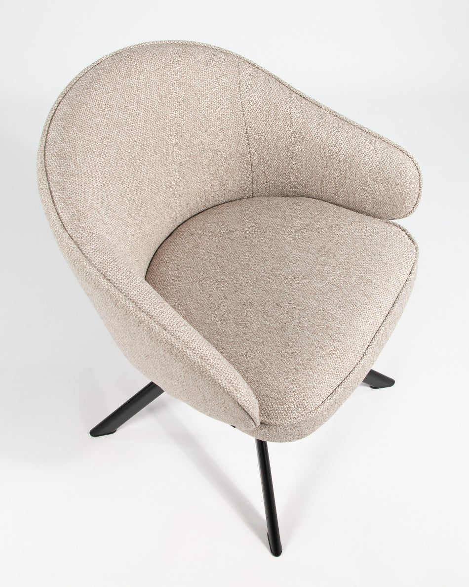 El asiento y el respaldo tapizados garantizan confort en el uso diario, mientras que la base metálica negra con sistema giratorio 360° facilita el movimiento y aporta estabilidad. Una silla versátil que combina funcionalidad y diseño, ideal tanto para mesas de comedor como para espacios de trabajo o uso polivalente.