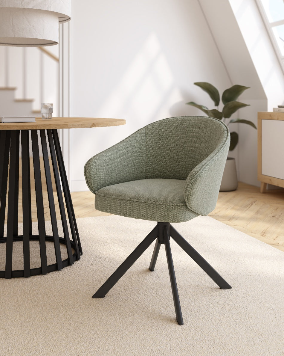 La silla giratoria Verona destaca por su diseño envolvente y actual, pensada para aportar comodidad y un carácter elegante a comedores, despachos domésticos o zonas de reunión. Su respaldo curvado con brazos integrados ofrece una sentada recogida y confortable, manteniendo una estética ligera que encaja bien en espacios contemporáneos.