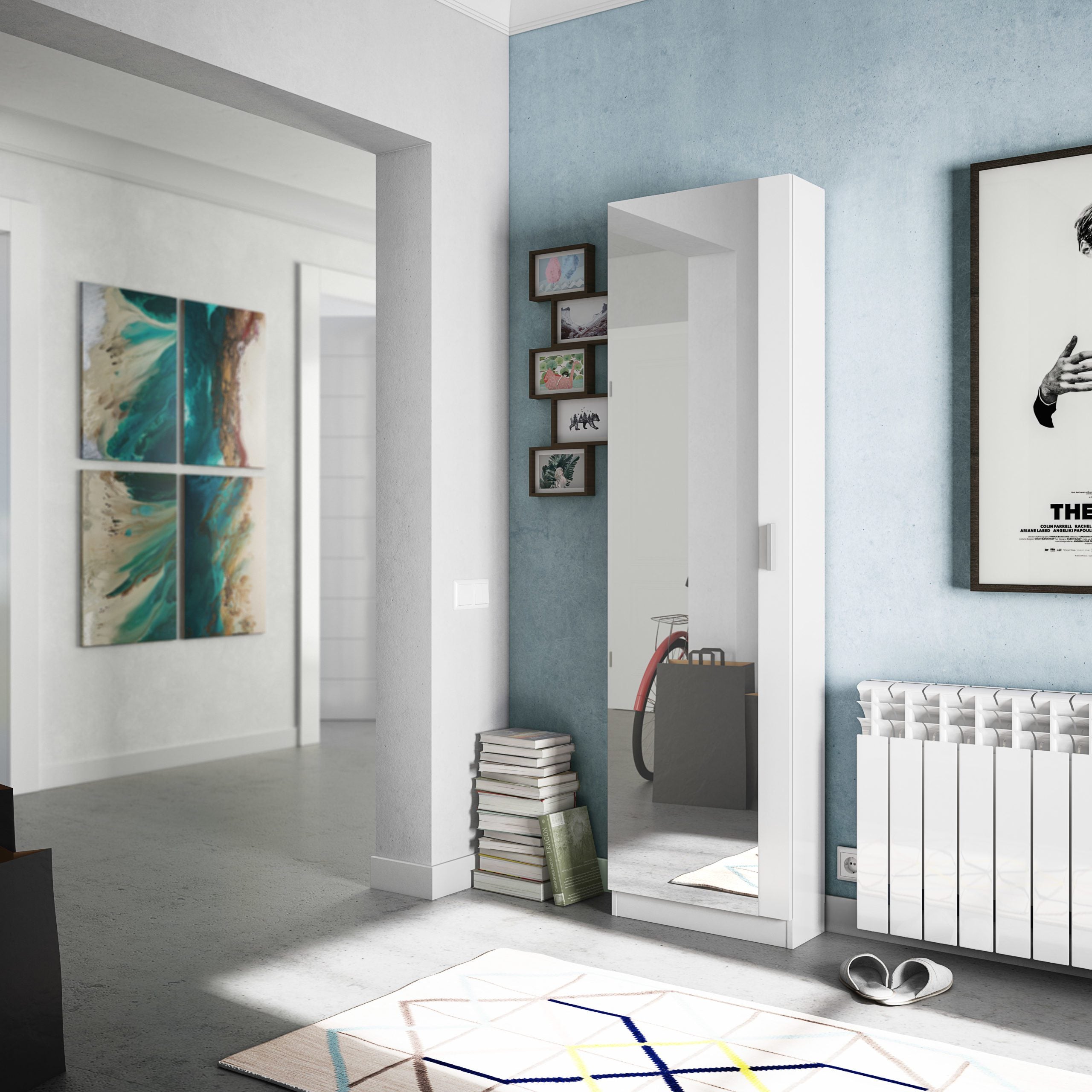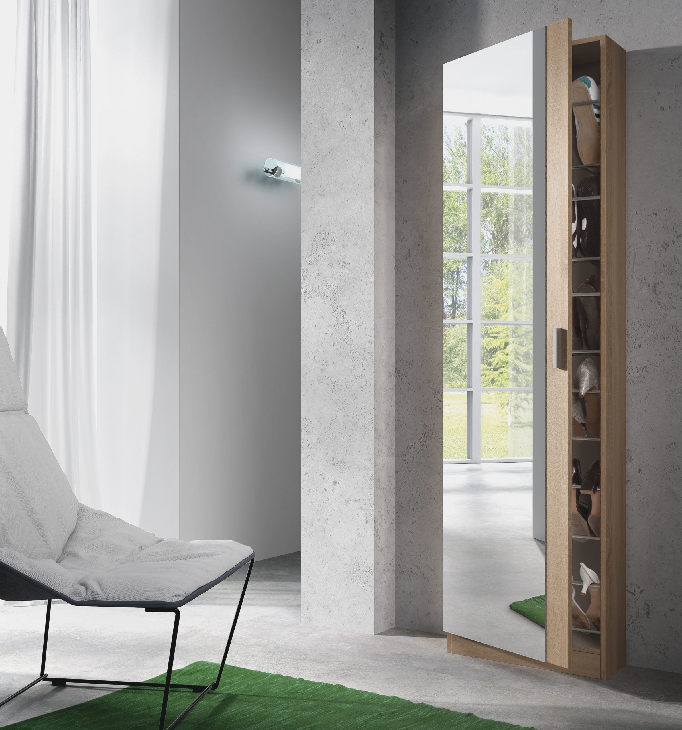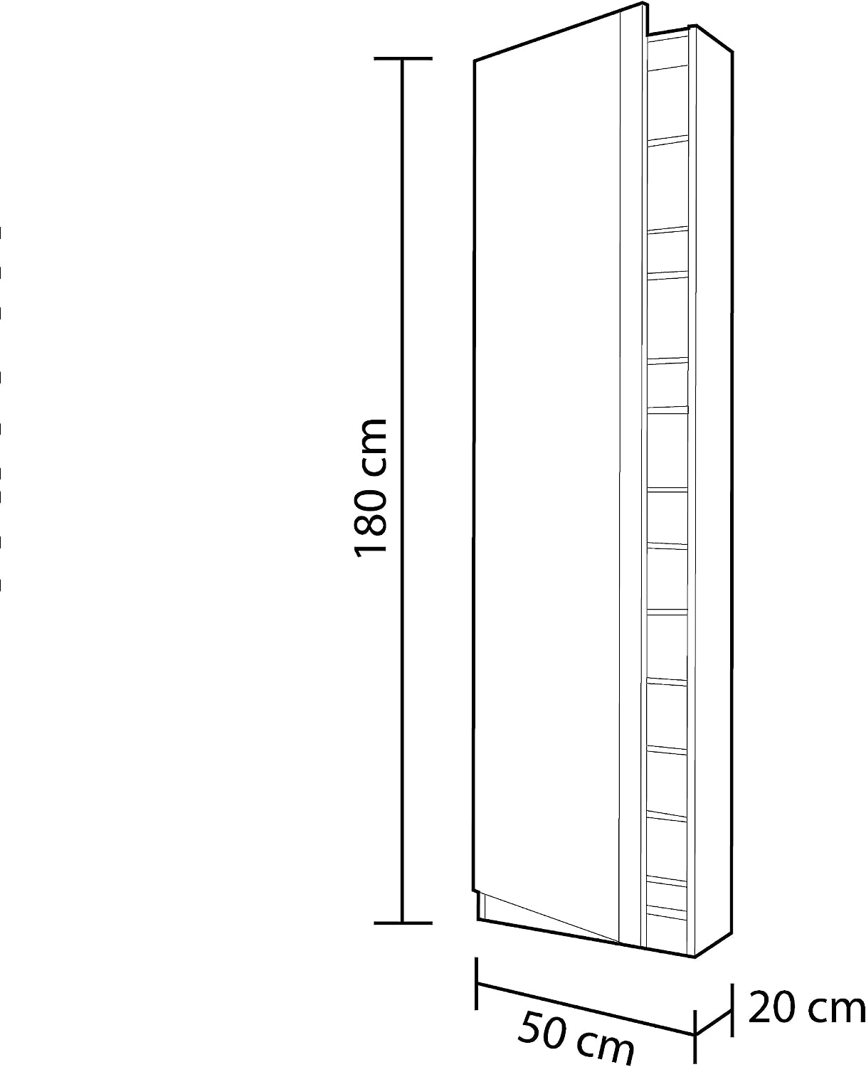 Medidas y capacidad: Mueble completo: 180 cm (alto) x 50 cm (ancho) x 20 cm (prof.) | Espejo integrado de gran formato: 173 cm (alto) x 44 cm (ancho) | Capacidad de almacenaje: 16 pares de zapatos aproximadamente.
