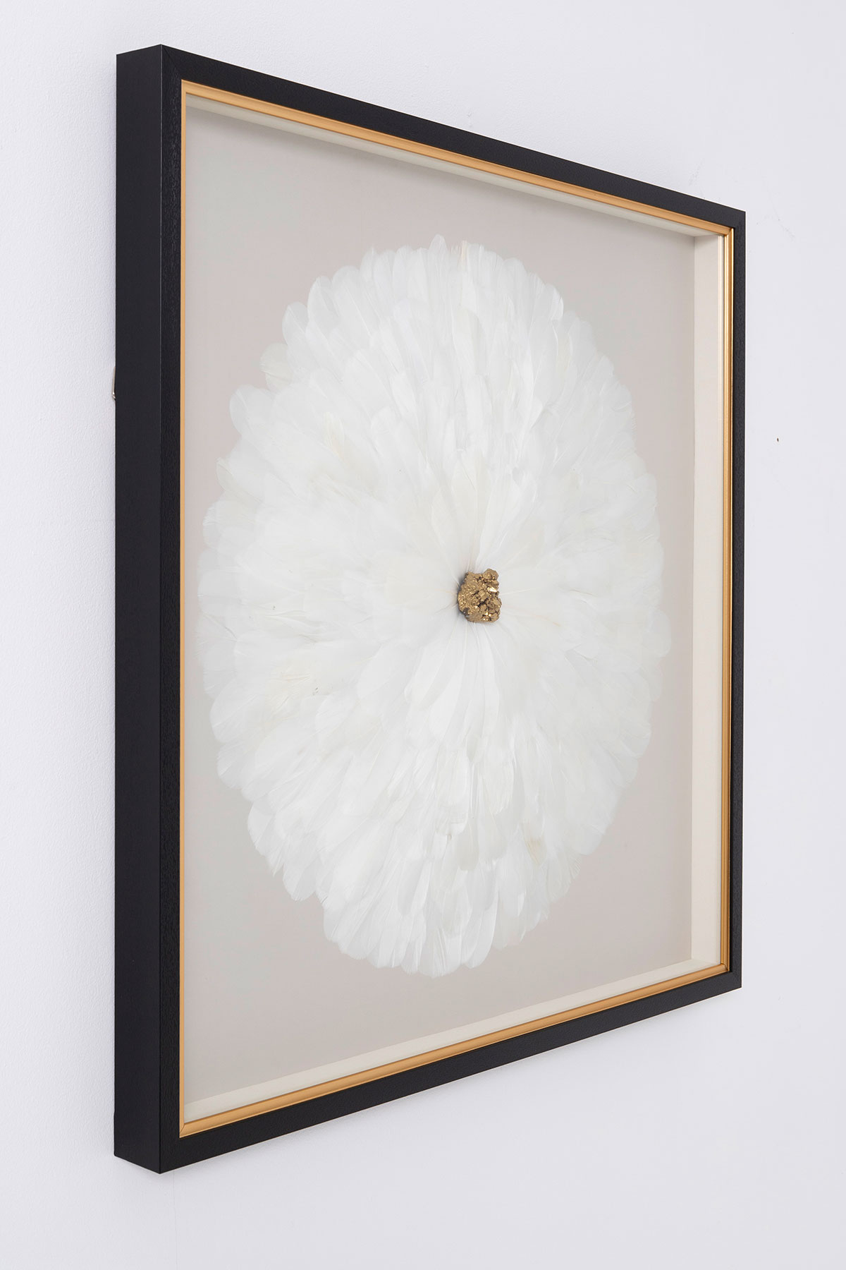 Este cuadro tiene una función puramente decorativa, pensado para añadir textura, volumen y un punto diferencial a la pared donde se coloca. Las plumas blancas, ordenadas en el interior de la vitrina, aportan ligereza visual y un aire delicado, mientras que el marco negro y los detalles dorados añaden fuerza y elegancia.