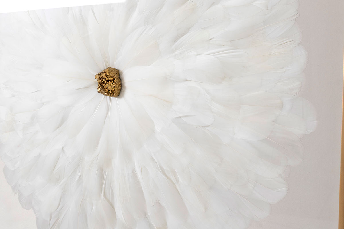 En el interior, las plumas blancas destacan sobre el fondo y los toques dorados, creando un juego de texturas y colores muy decorativo. La mezcla de madera, cristal y elementos internos cuidadosamente dispuestos da como resultado una pieza resistente y preparada para lucir en paredes de salón, comedor o recibidor.