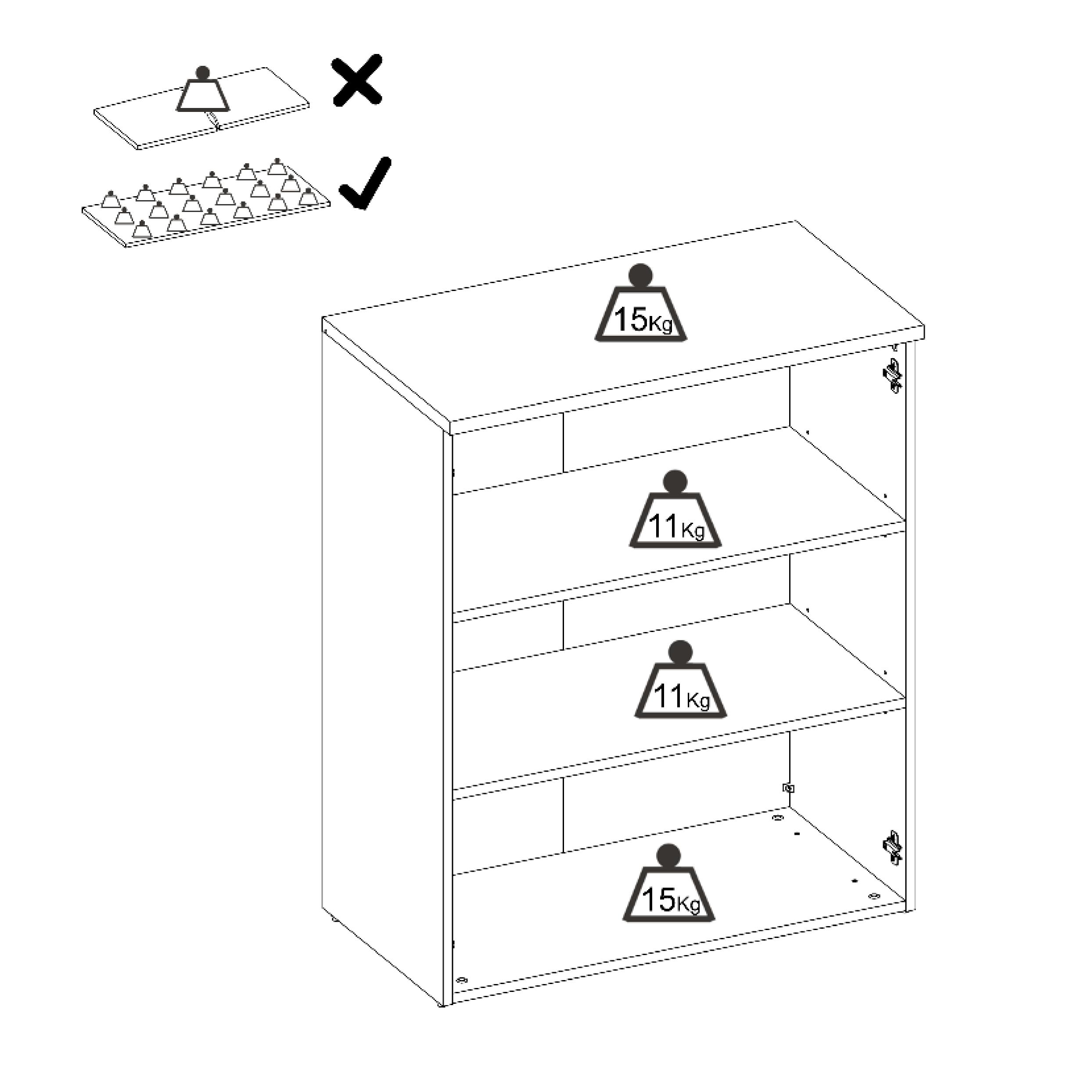 Los 2 estantes interiores soportan un peso máximo de 11kg cada uno, la tapa y el zócalo del módulo bajo pueden soportar un peso máximo de 15kg